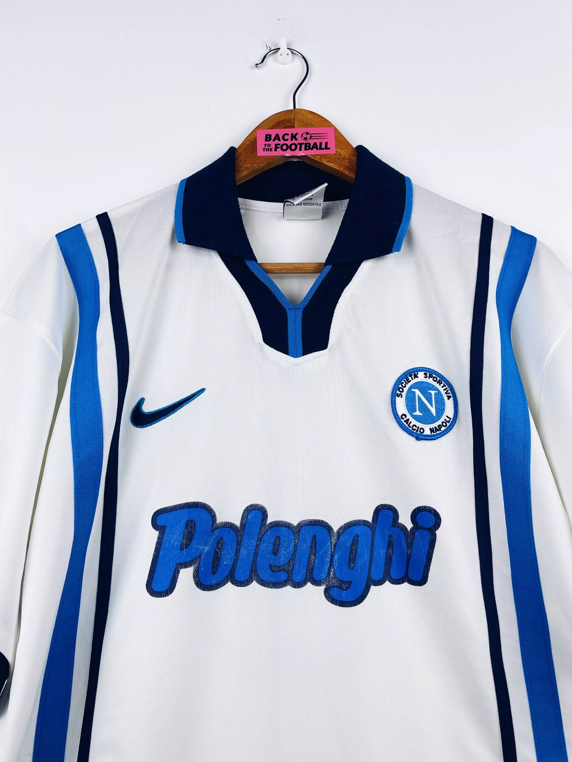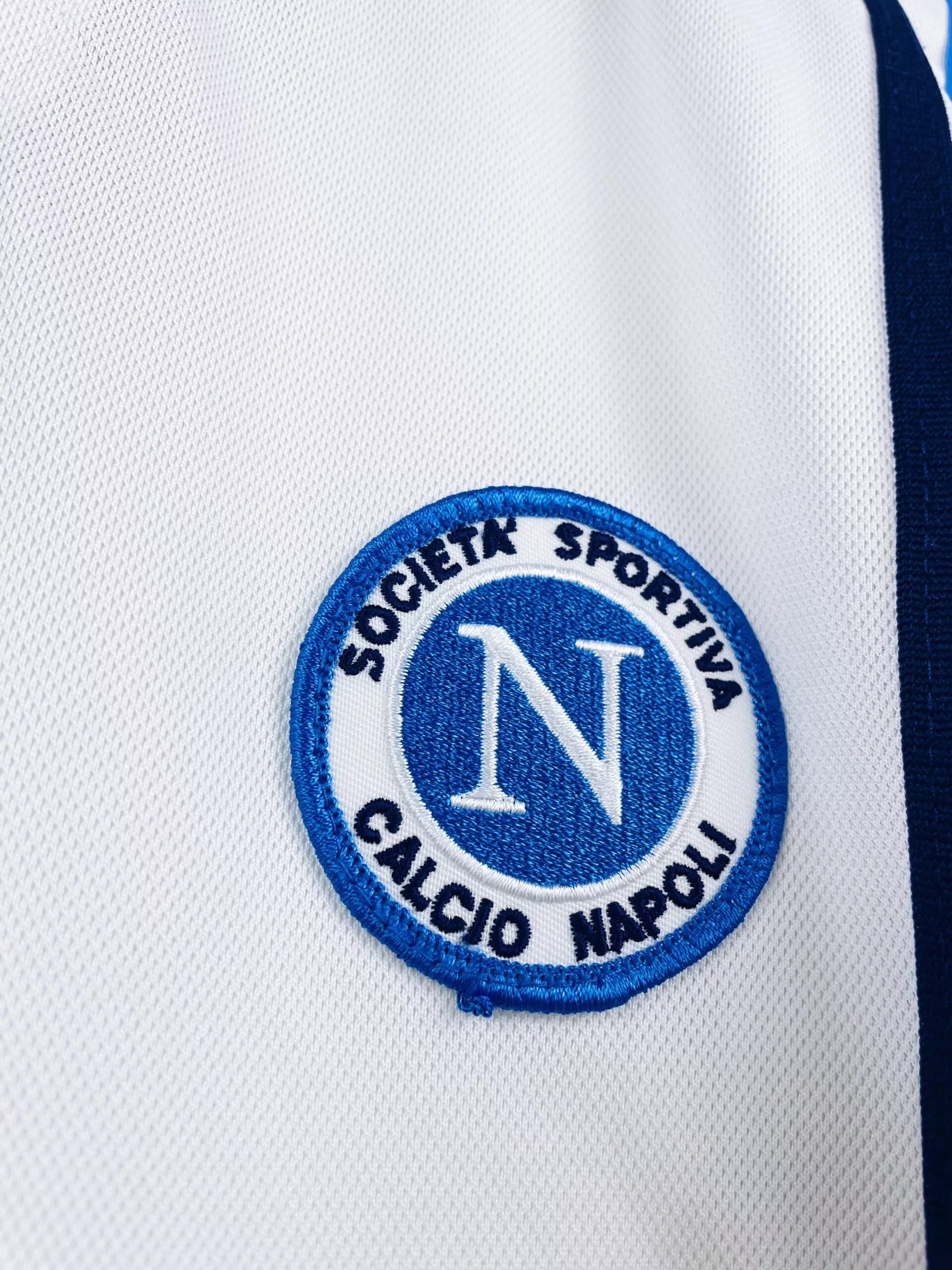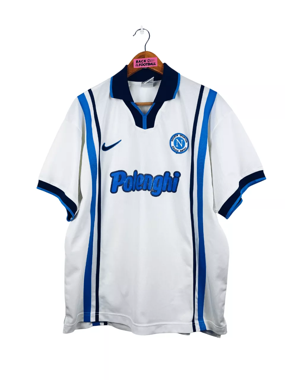 Taille : L Si tu veux plus de détails, tu peux nous contacter par mail ou sur les réseaux 😉 Etat : 8/10, très bon état hormis le sponsor qui est un peu abimé (voir photo) Le maillot : maillot vintage extérieur du Napoli 1997/1998 préparé (match issue) pour le numéro 6 : pas de patch Nike à l’avant, #6 en feutrine. L’écusson et le logo Nike sont brodés, le sponsor Polenghi est floqué. Très beau maillot rétro du Napoli ! Histoire : très mauvaise saison du Napoli, qui après 4 changements de coach, finira à la dernière place de…