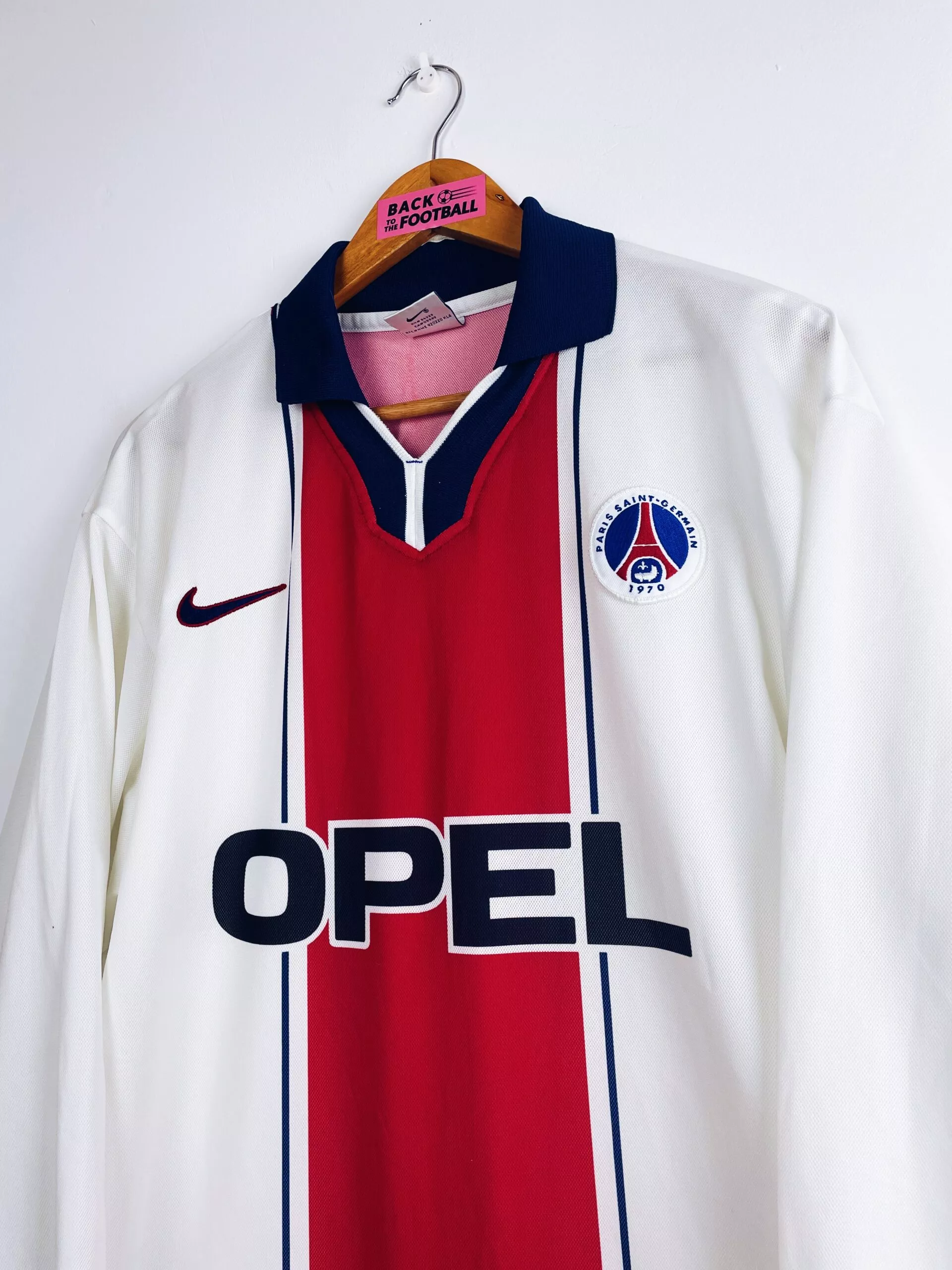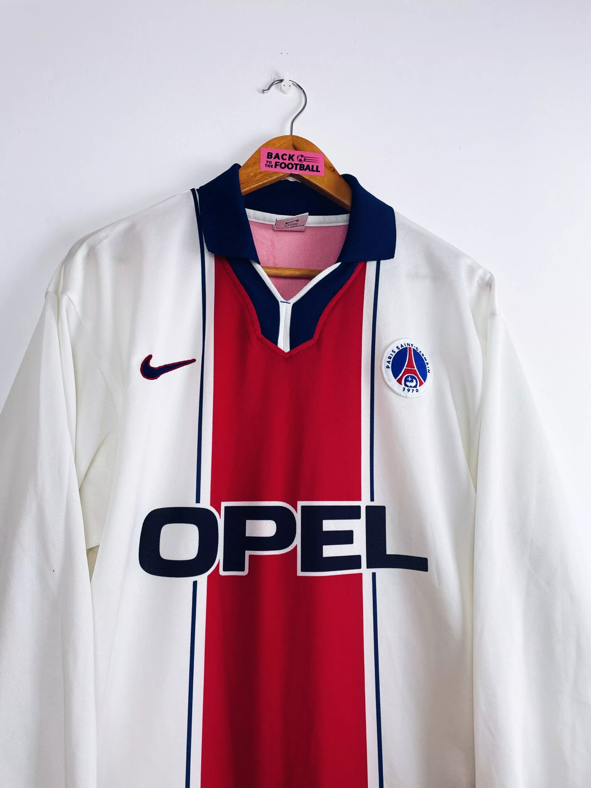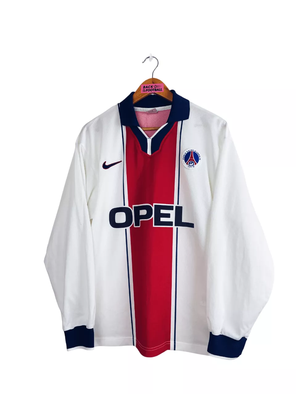 Taille : L Si tu veux plus de détails, tu peux nous contacter par mail ou sur les réseaux 😉 Etat : 8/10, excellent état Le maillot : maillot vintage extérieur du PSG 1997/1998 manches longues issu du stock pro (player issue) en configuration Ligue des Champions : manches longues, sponsor Opel différent, pas de patch Nike sur le devant. L’écusson et le logo Nike sont brodés, le sponsor Opel est incrusté au maillot. Très beau maillot rétro du PSG ! Histoire : belle saison pour le PSG coaché par Joël Bats qui remporte les deux coupes nationales : 2-1…