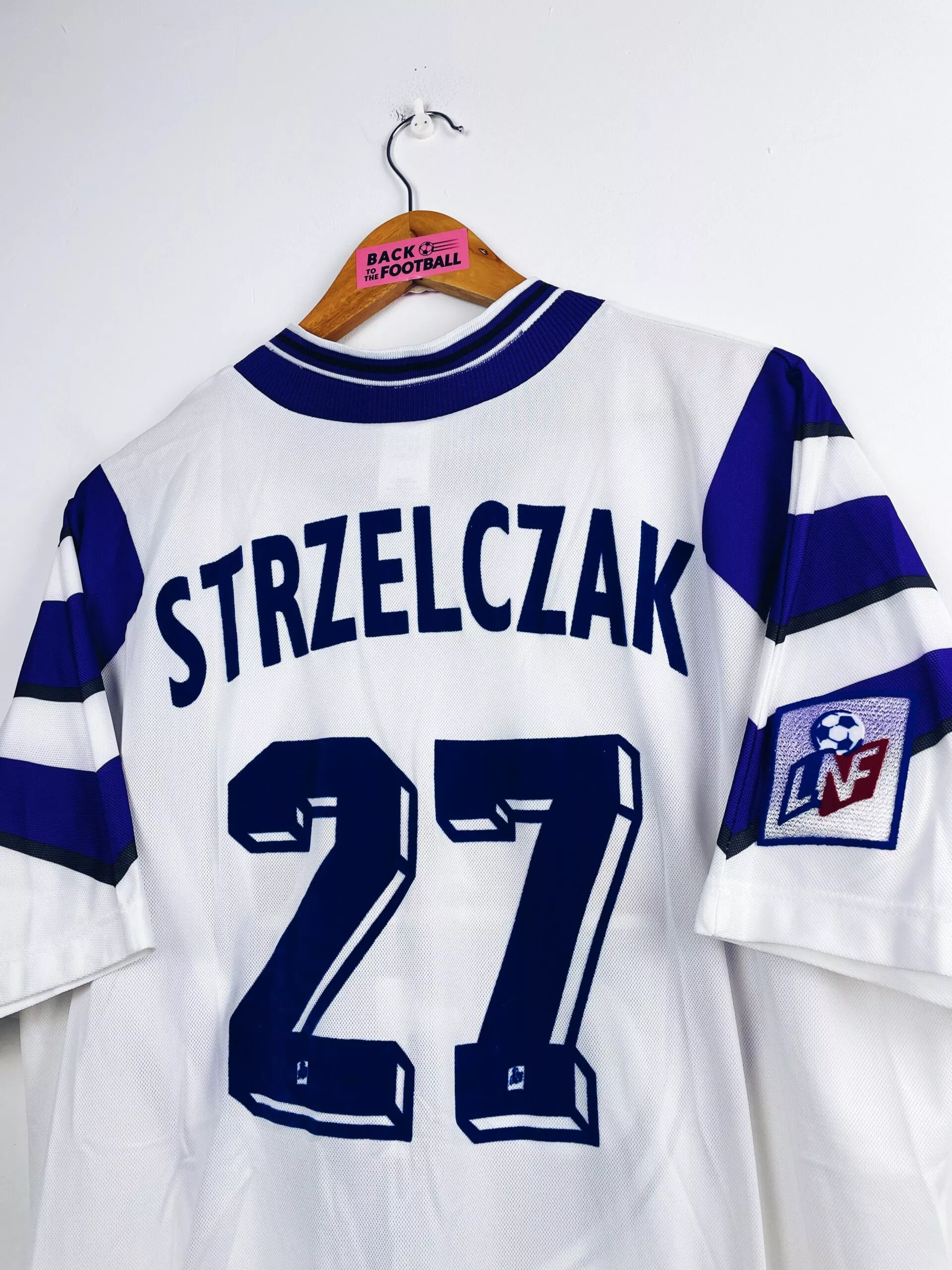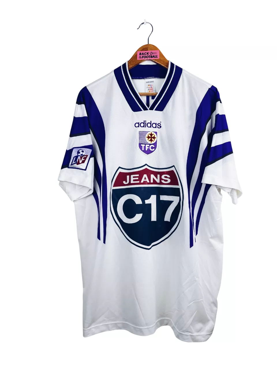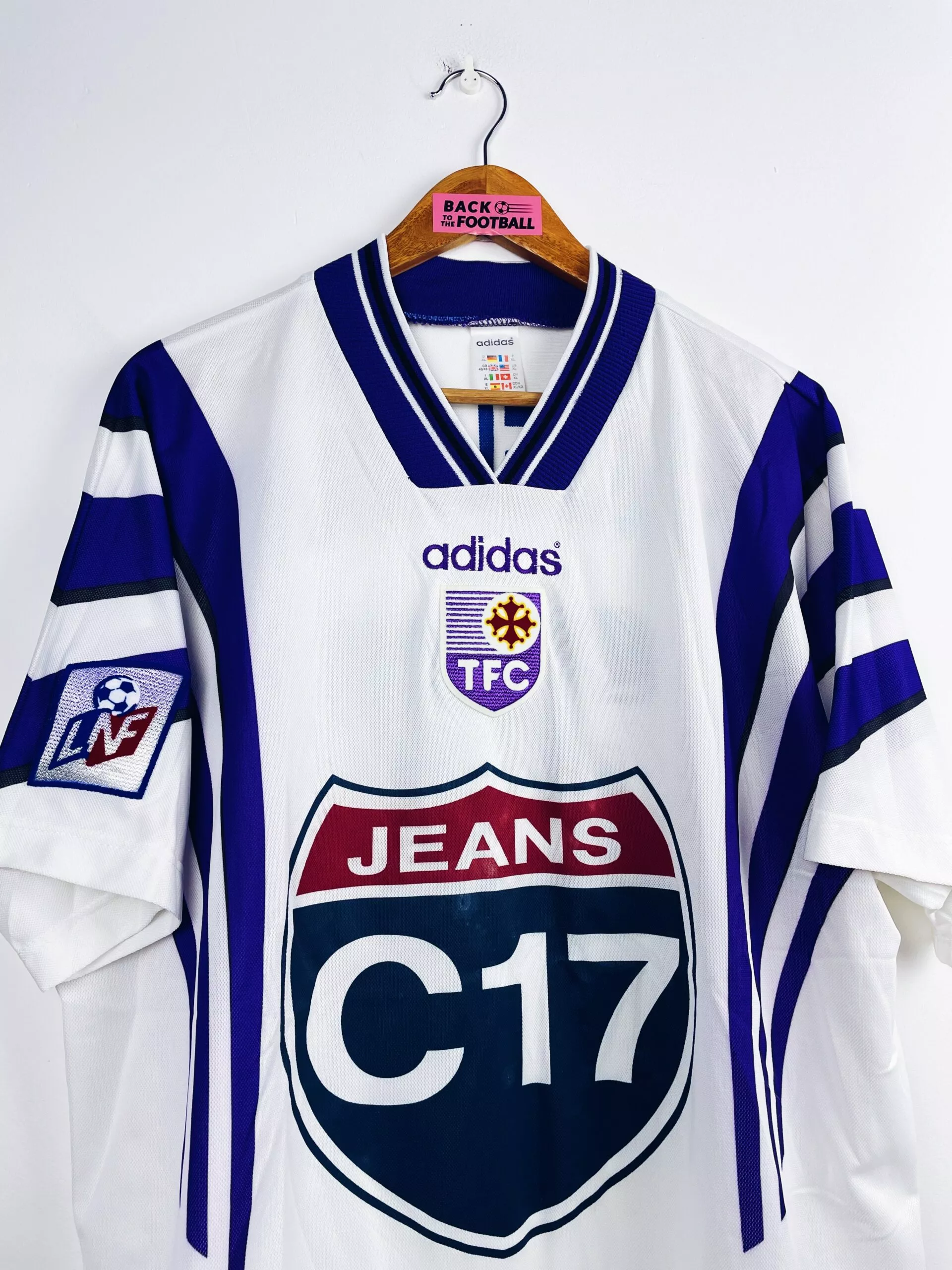 Taille : XL Si tu veux plus de détails, tu peux nous contacter par mail ou sur les réseaux 😉 Etat : 8/10, très bon état, minis traces sur le sponsor (voir photo) Le maillot : maillot vintage domicile du Toulouse FC 1997/1998 préparé (match issue) ou porté (match worn) par Strzelczak #27. L’écusson est en feutrine, le logo Adidas brodé, le sponsor Jeans C17 floqué et le patch LNF et Strzelczak #27 sont en feutrine. Très beau maillot rétro du TFC ! Histoire : c’est le template de la saison précédente mais porté en tout début de saison 97/98…