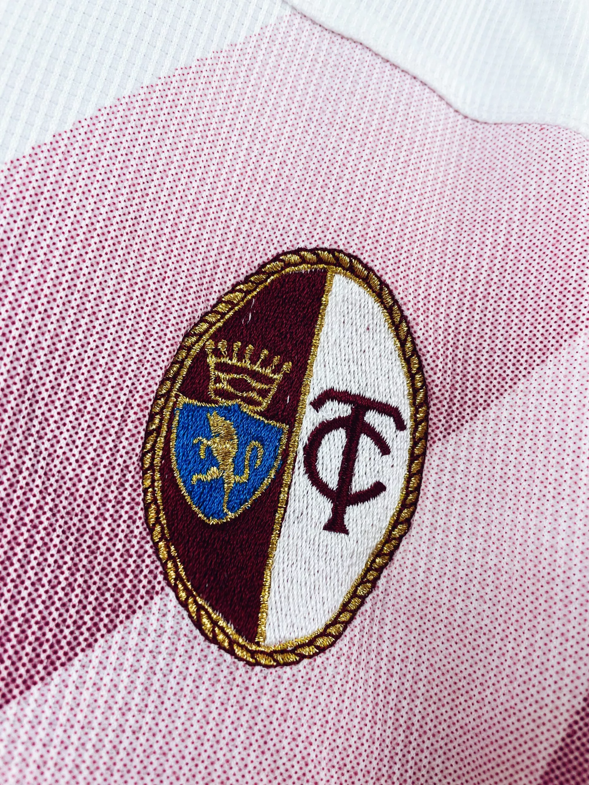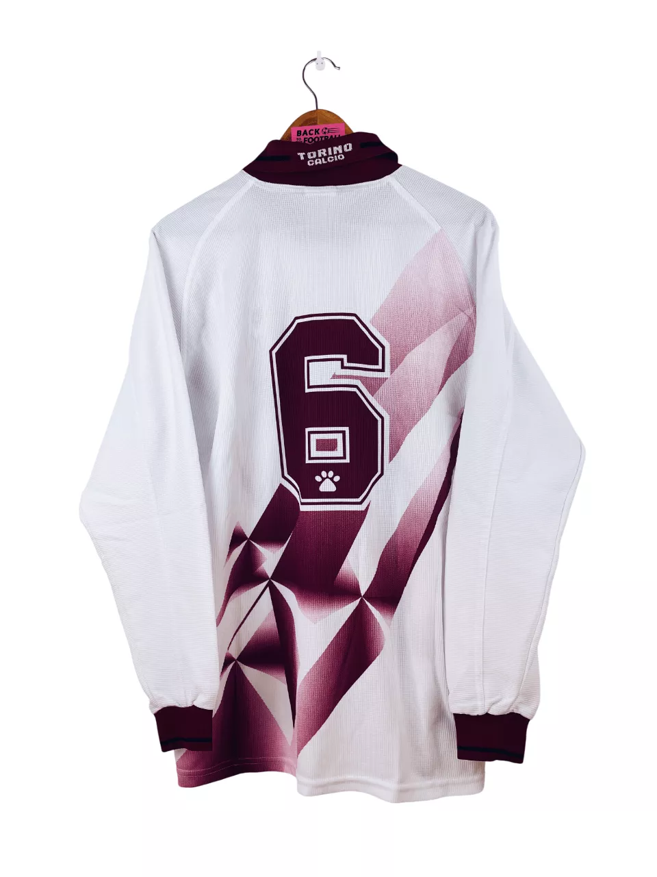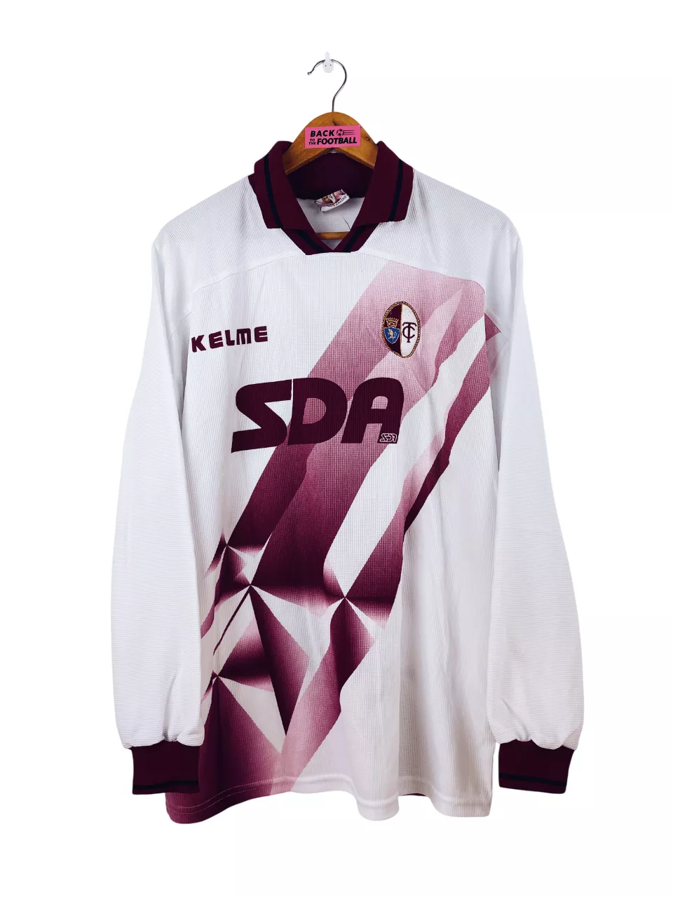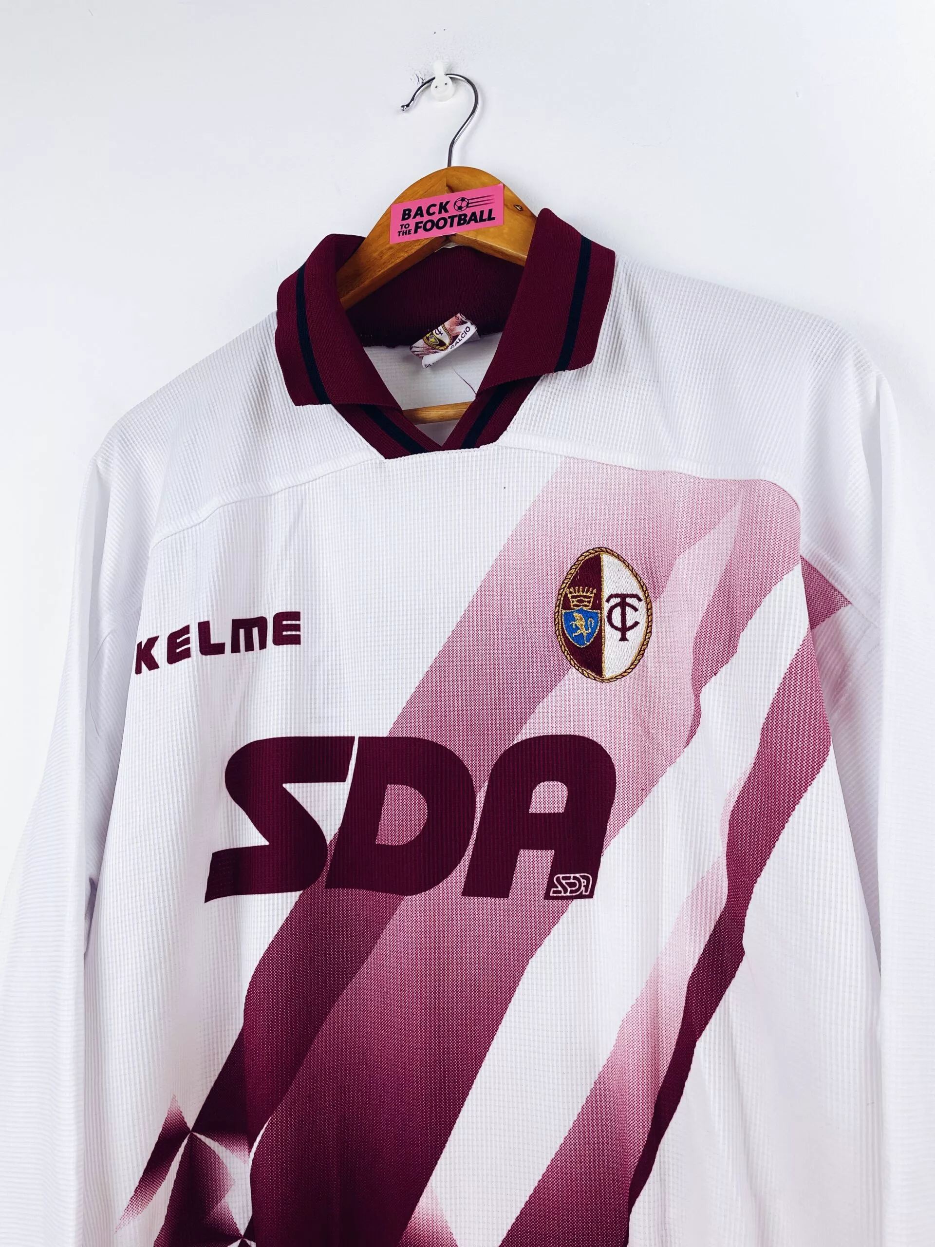 Taille : L Etat : 8/10, très bon état Le maillot : maillot vintage extérieur du Torino 1997/1998 manches longues issu du stock pro (player issue). L’écusson est brodé, le sponsor SDA, le logo Kelme et le numéro 6 sont incrustés. Très beau maillot rétro du Torino ! Histoire : le Torino termine à la 5ème place de Serie B. Les turinois seront éliminés au deuxième tour de Coupe d’Italie. Ferrante marque 23 buts cette saison.