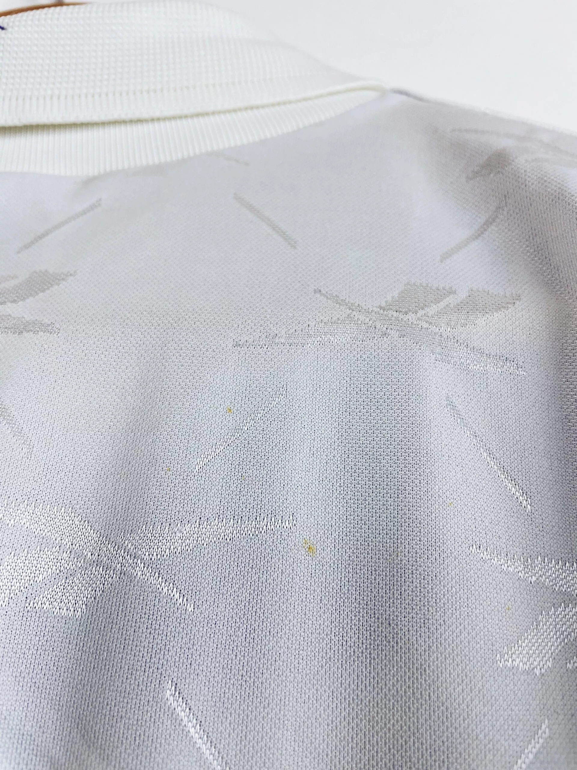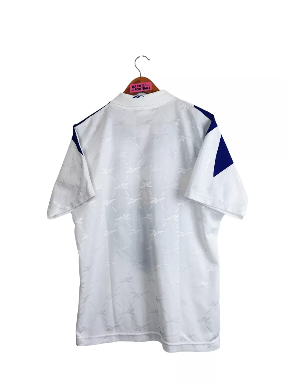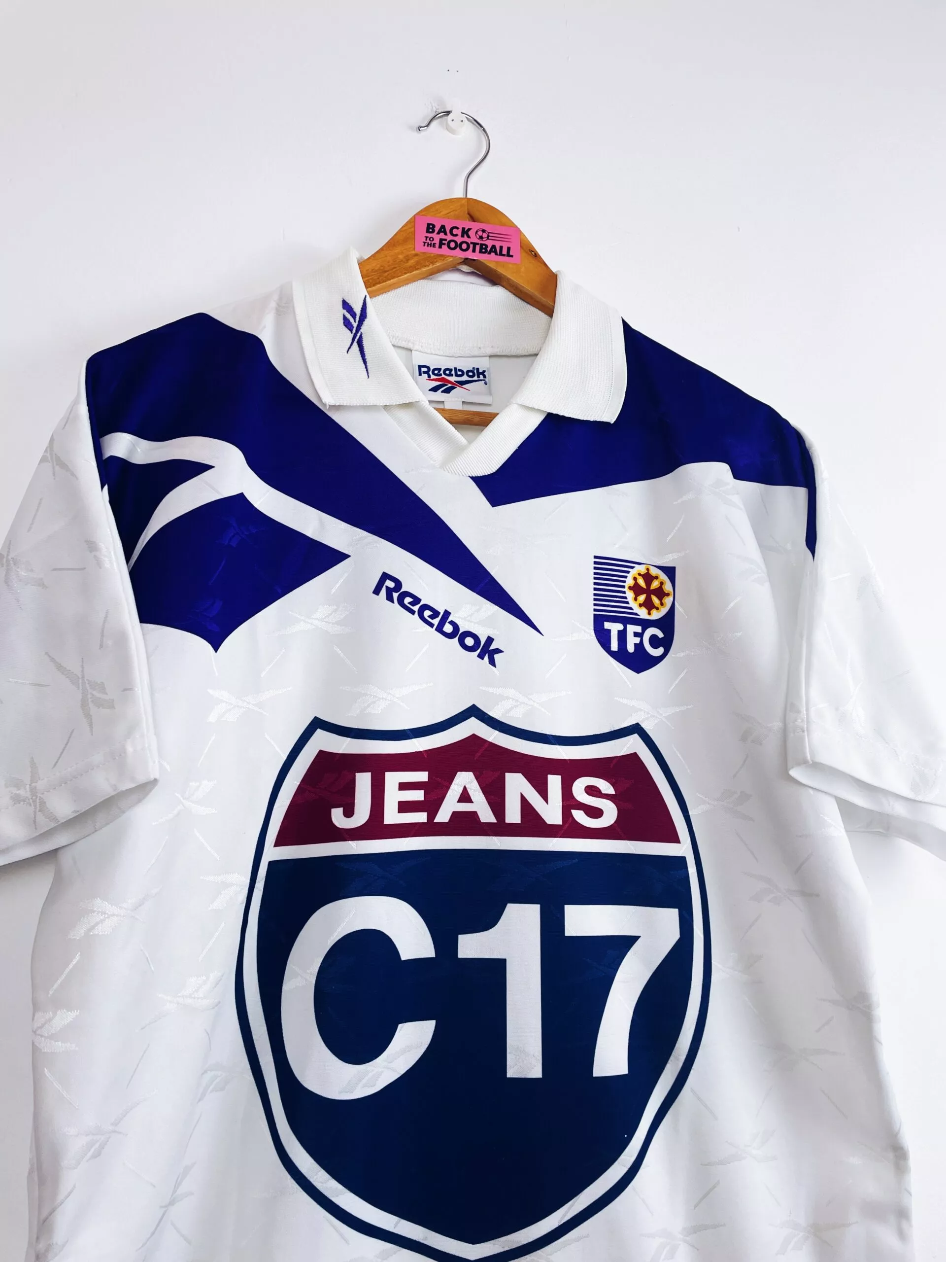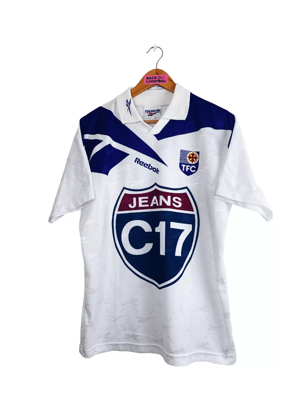 Taille : M/L (taille S sur l’étiquette mais ça taille très large) Largeur : 54cm (aisselle à aisselle) Longueur : 71cm (base du col au bas) Si tu veux plus de détails, tu peux nous contacter par mail ou sur les réseaux 😉 Etat : 8/10, très bon état, micro trace dans le dos (voir photo) Le maillot : maillot vintage domicile de Toulouse 1997/1998. L’écusson, le logo Reebok et le sponsor Jeans C17 sont incrustés. On peut voir le logo Reebok en tramé sur tout le maillot. Très beau maillot rétro de Toulouse ! Histoire : le Téfécé tout…