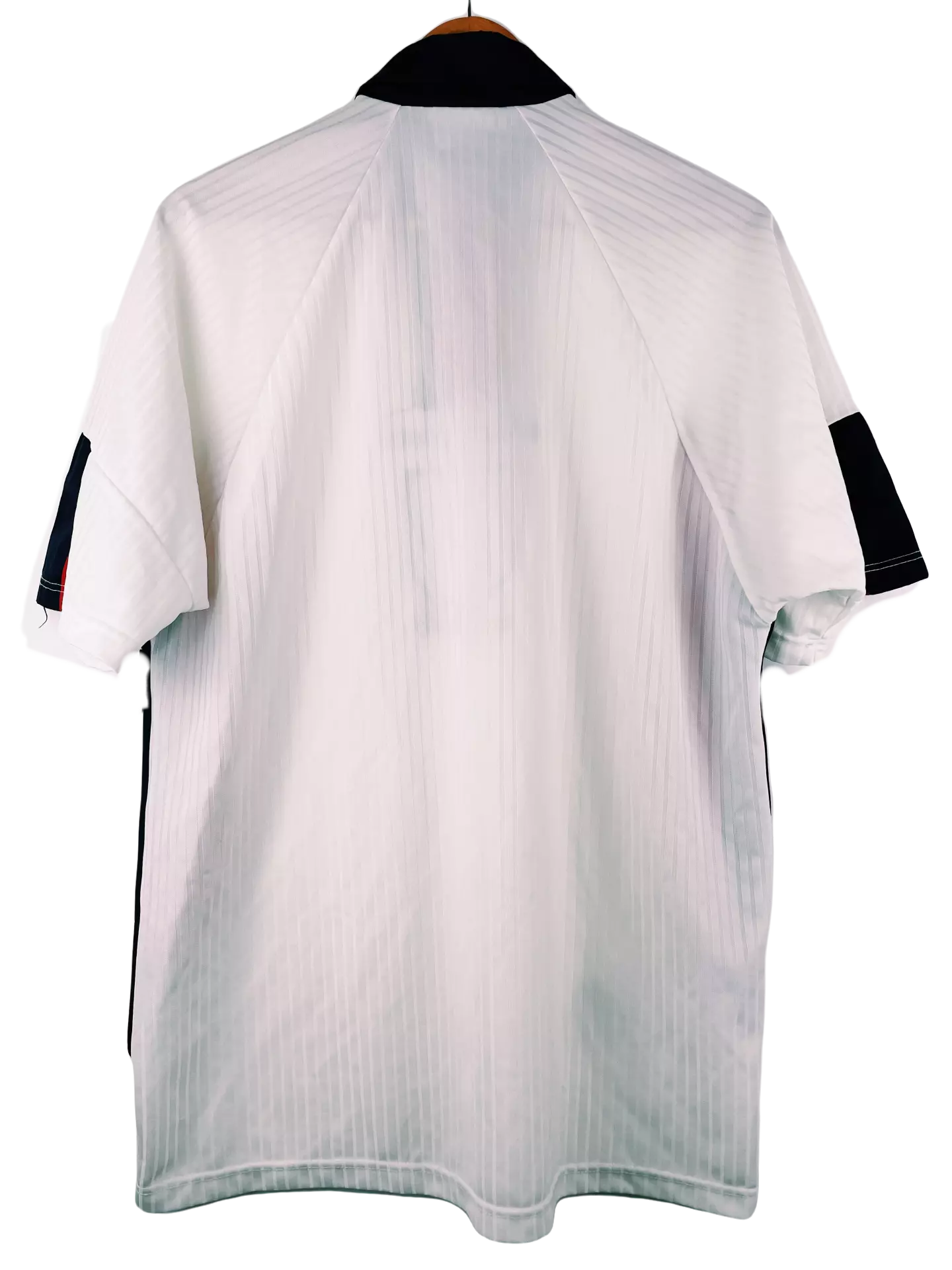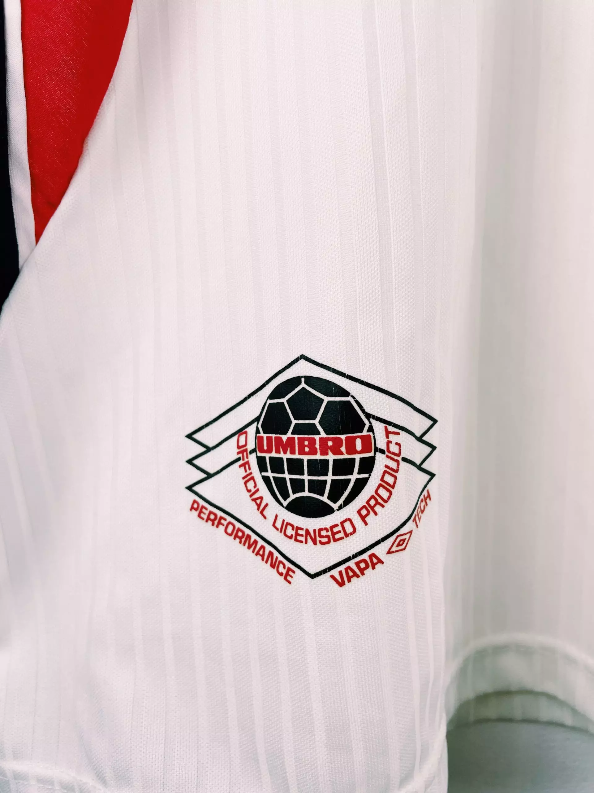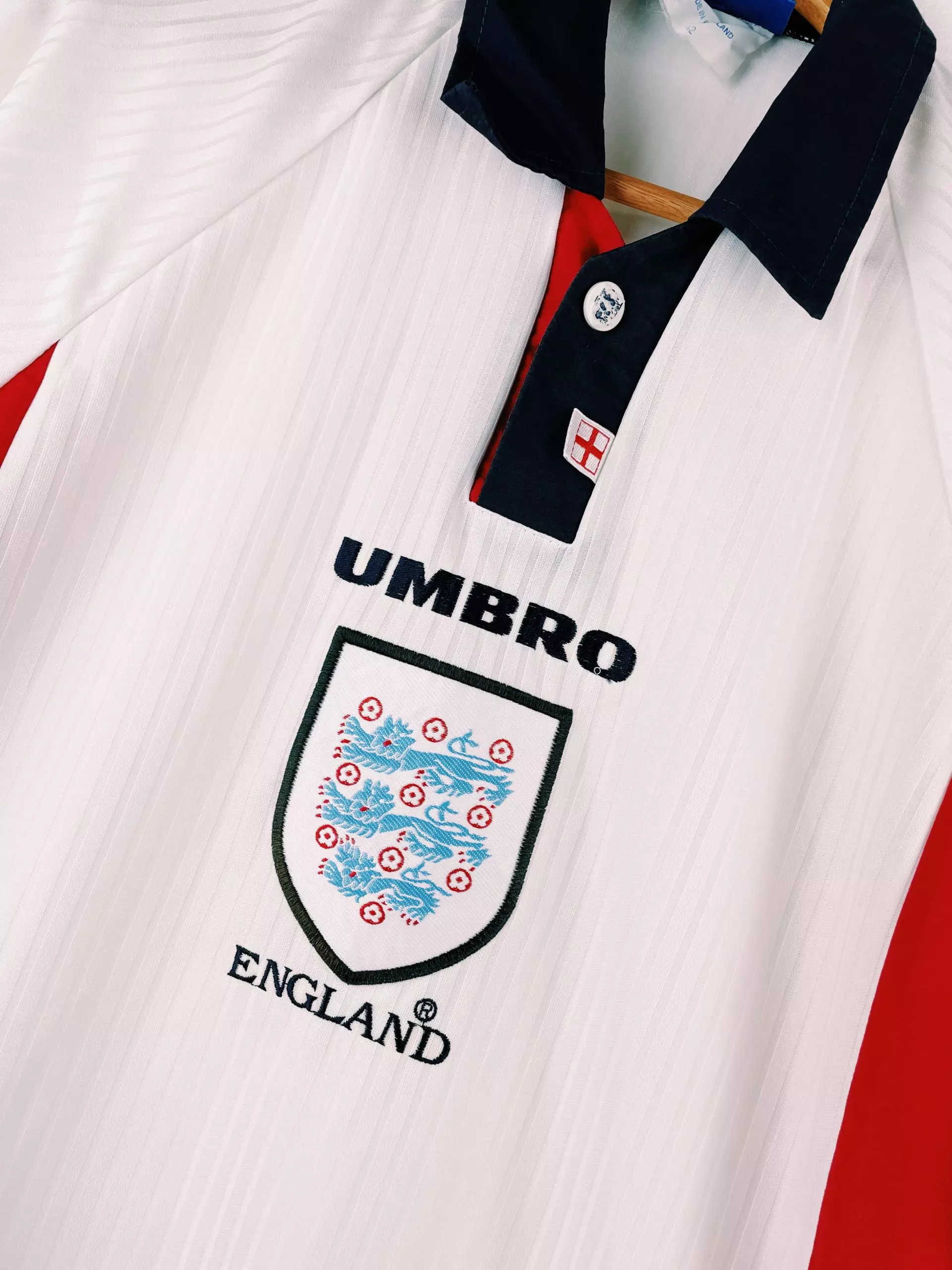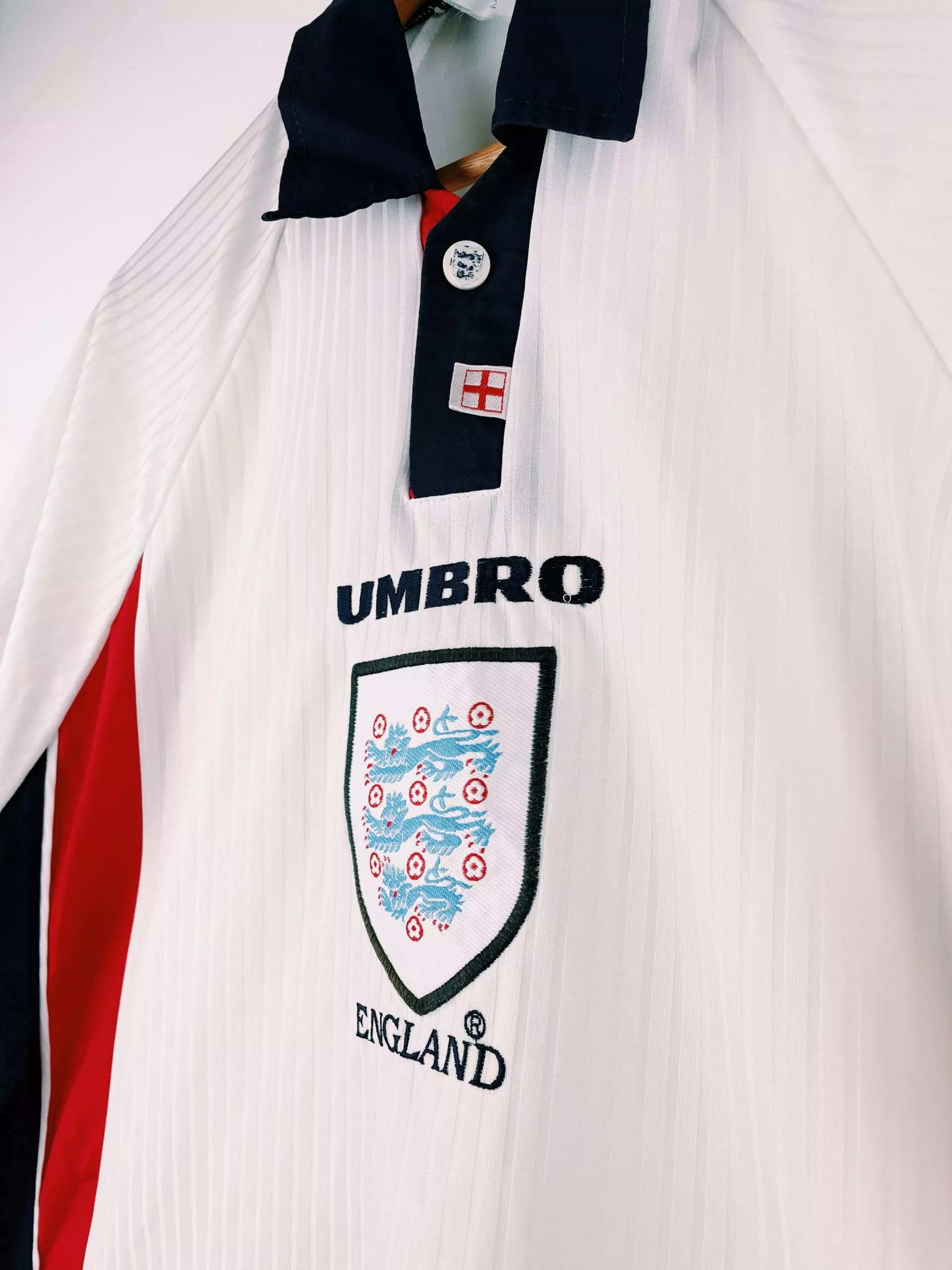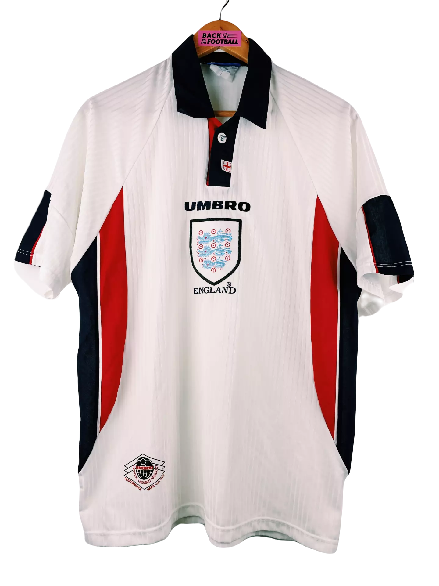 Taille : M Etat : très bon état général Le maillot : maillot vintage Umbro de l’Angleterre, 1997/1999. L’écusson et le logo Umbro sont brodés. Le bouton du col reprend l’écusson des Three Lions. Histoire : toujours maudits, les anglais seront éliminés en huitièmes de finale de la Coupe du Monde 98 face à l’Argentine, après une séance de tirs au but. Ils avaient pourtant un gros effectif : Campbell, Neville, Beckham, Scholes, Shearer, Owen…