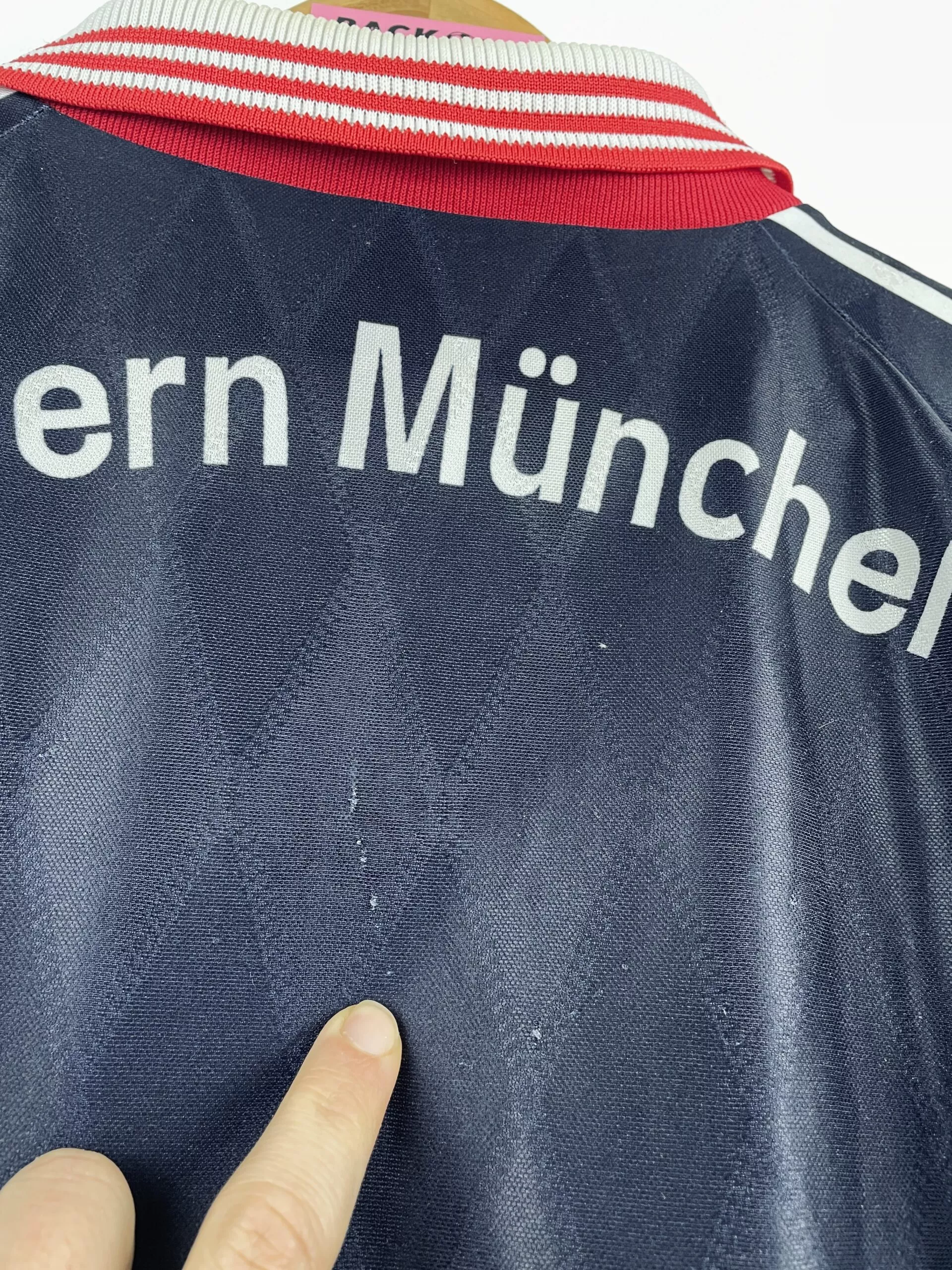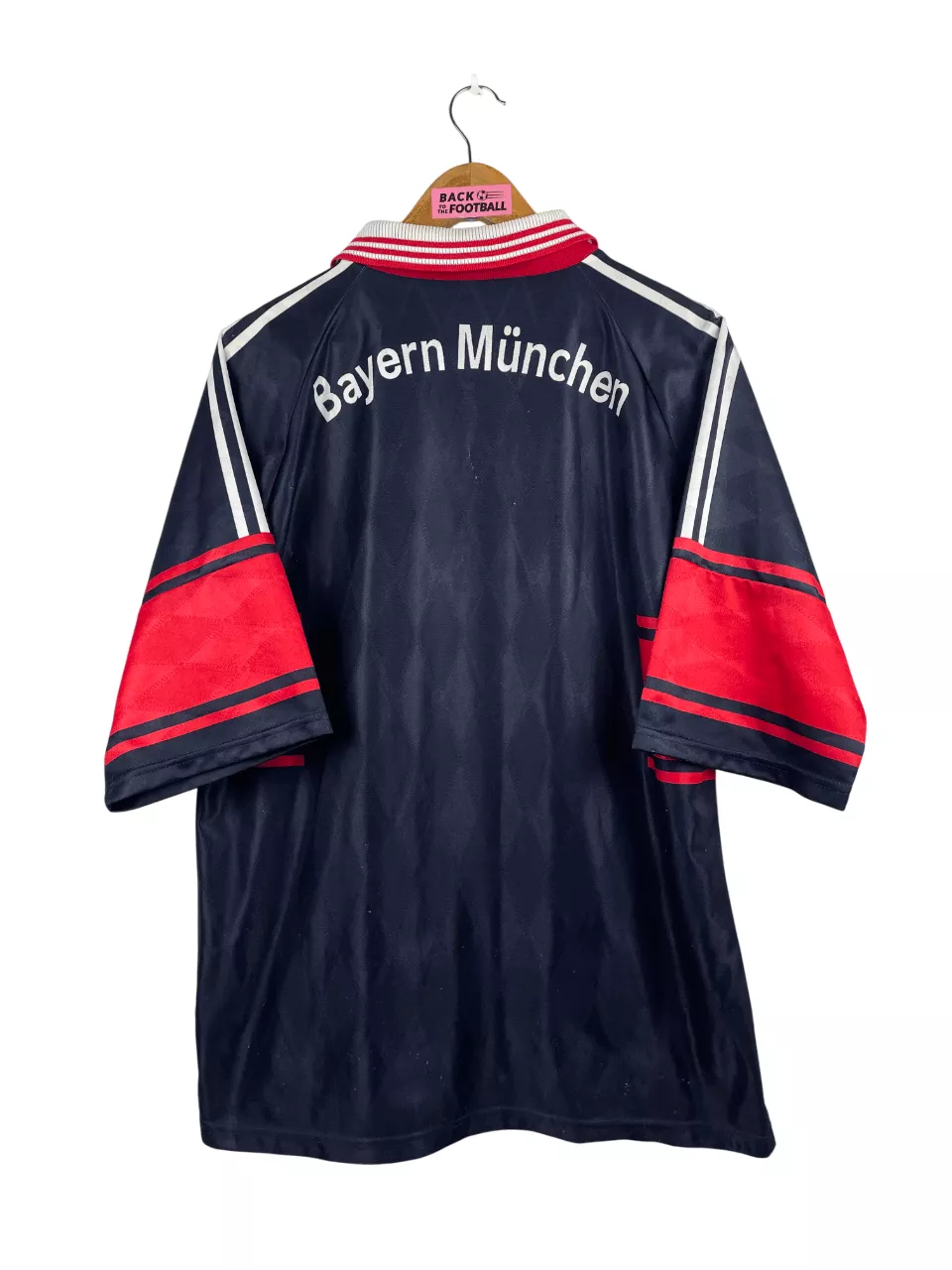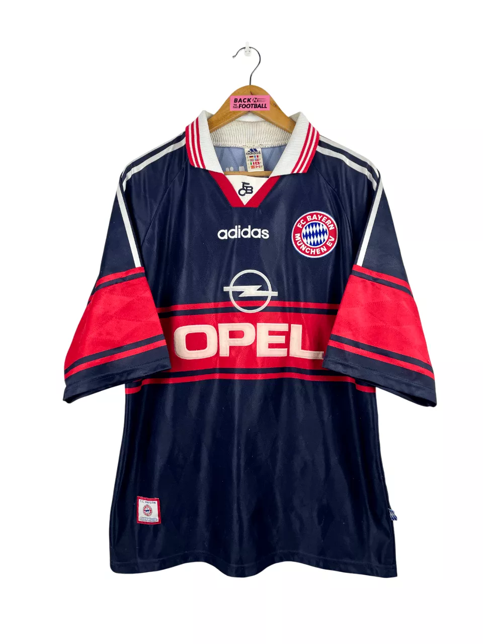 Taille : L Largeur : 58cm (aisselle à aisselle) Longueur : 73cm (base du col au bas) Si tu veux plus de détails, tu peux nous contacter par mail ou sur les réseaux 😉 Etat : 7.5/10, très bon état mais des bouloches, col légèrement jauni (voir photos) Le maillot : maillot vintage domicile du Bayern Munich 1997/1999. L’écusson et le logo Adidas sont brodés, le sponsor Opel est en feutrine. Très beau maillot rétro du Bayern ! Histoire : la 1ère saison, les bavarois finiront deuxièmes de Bundesliga mais remporteront la Coupe d’Allemagne et Coupe de la ligue d’Allemagne.…