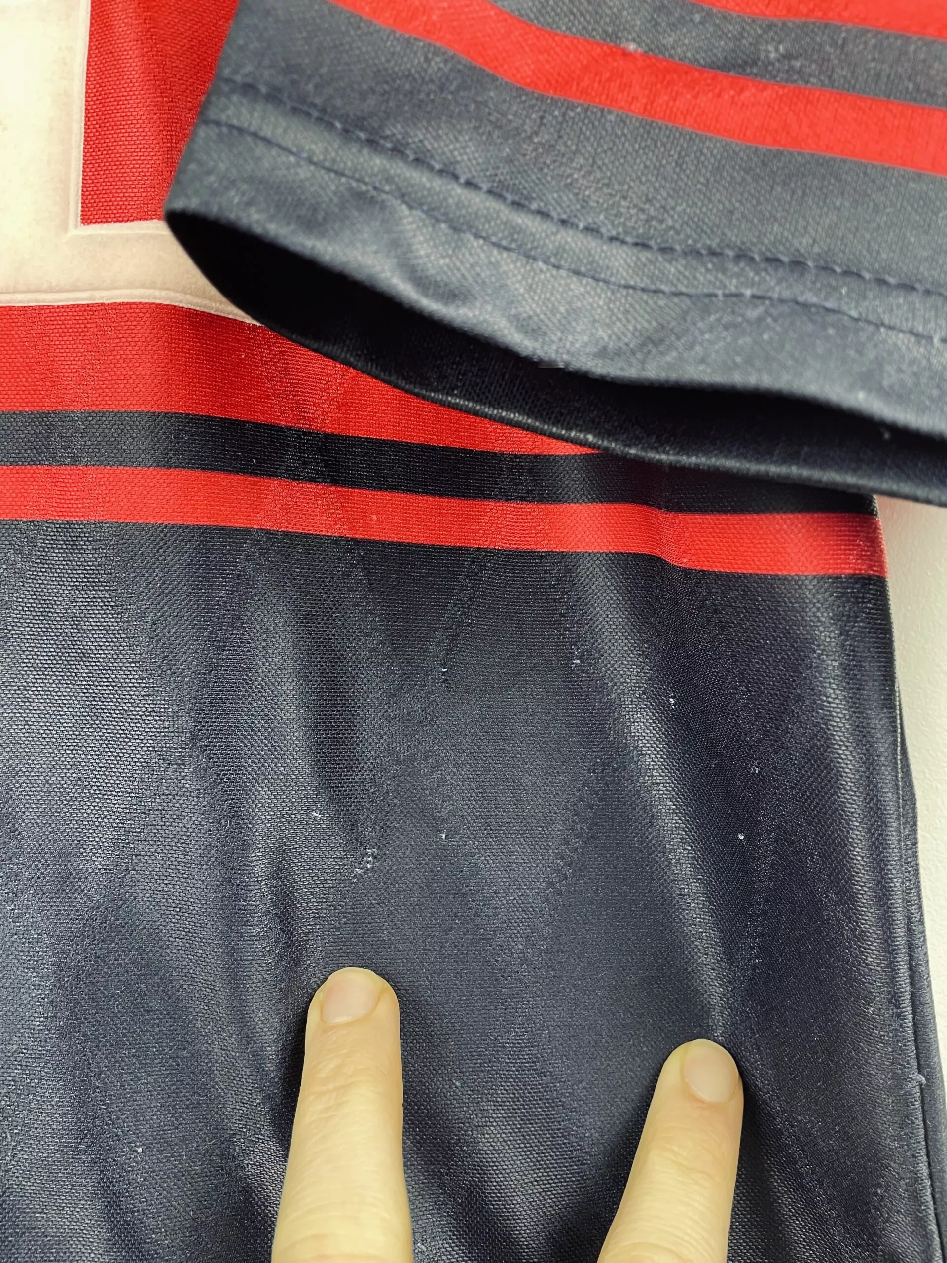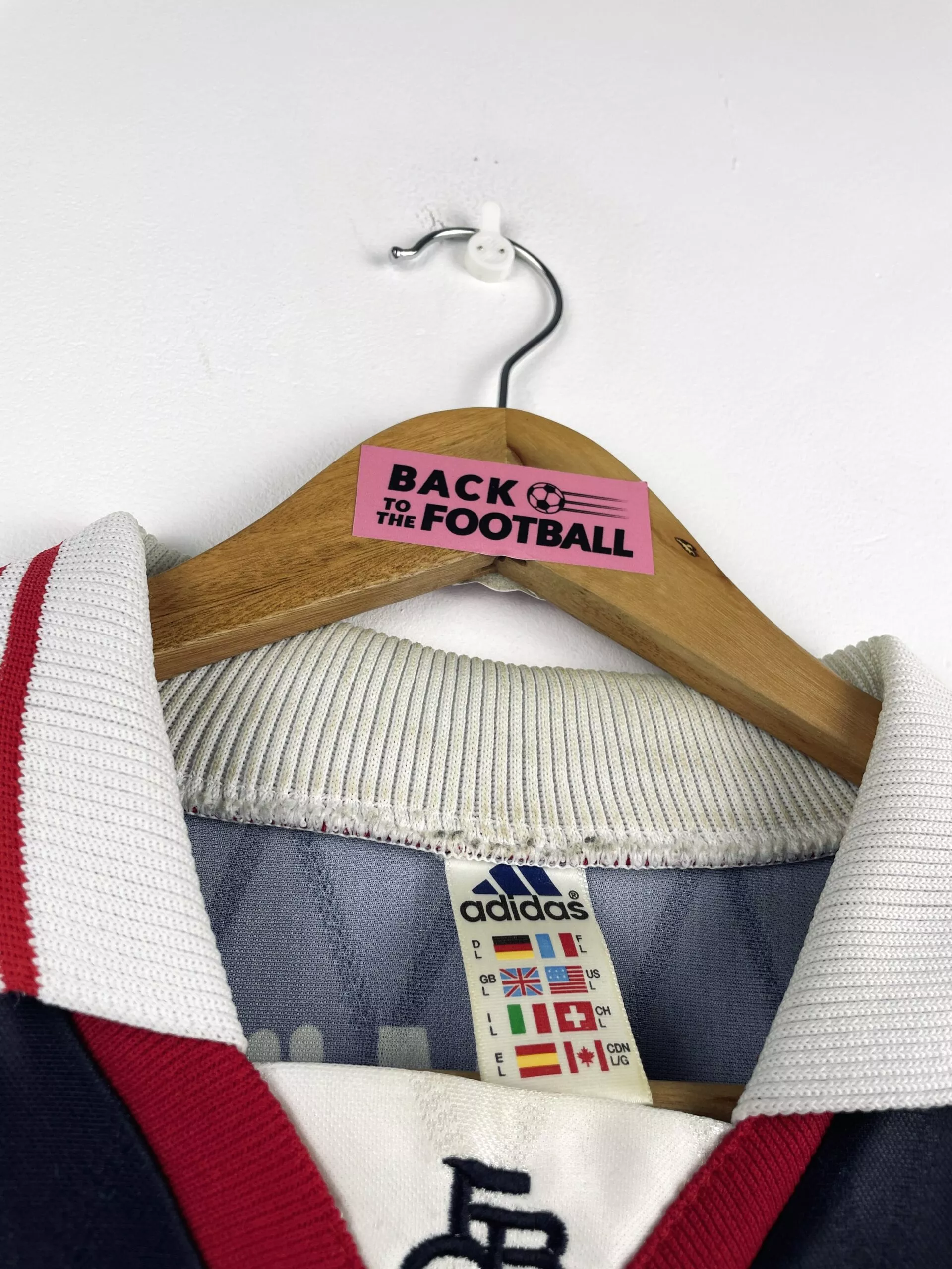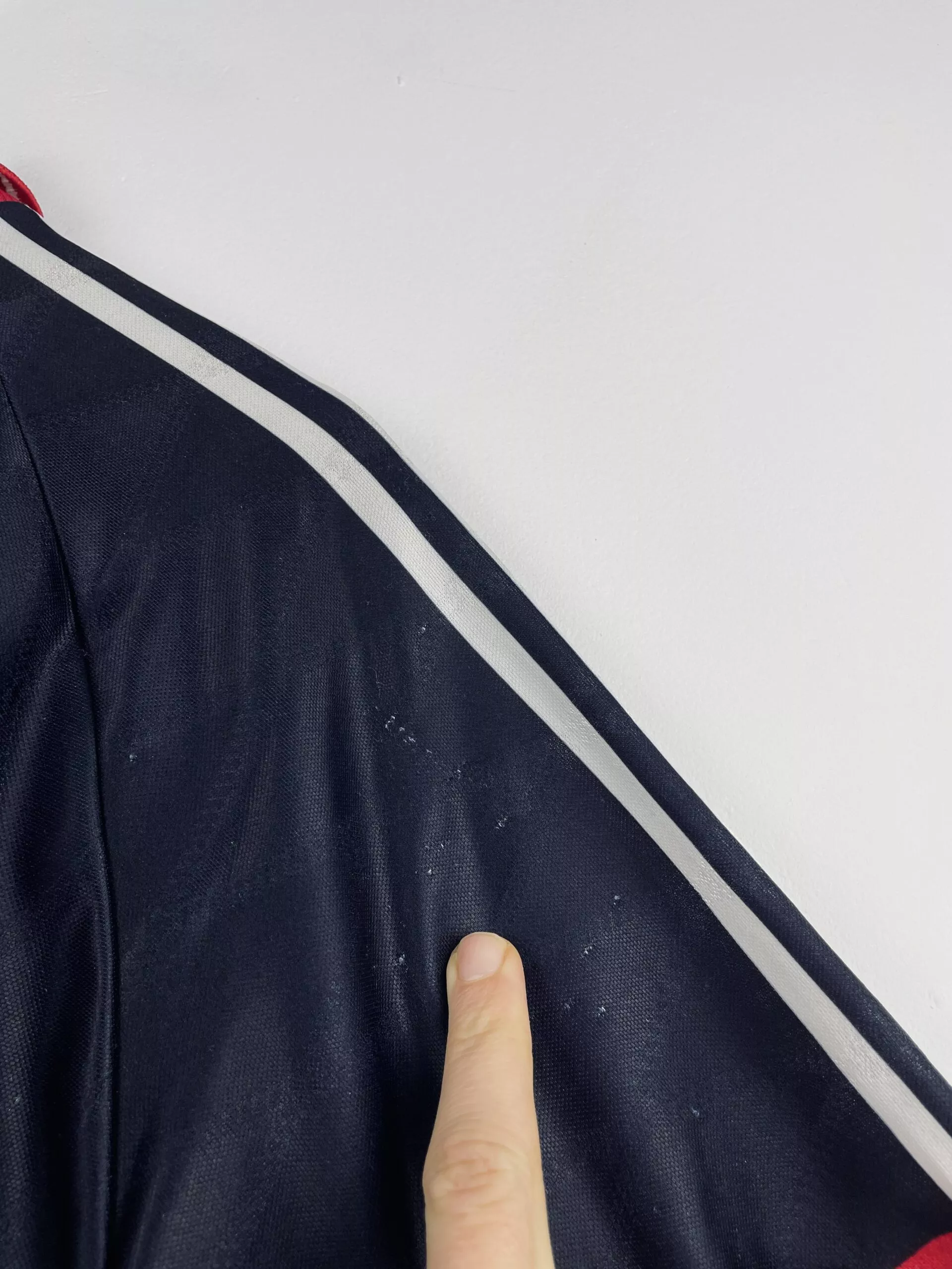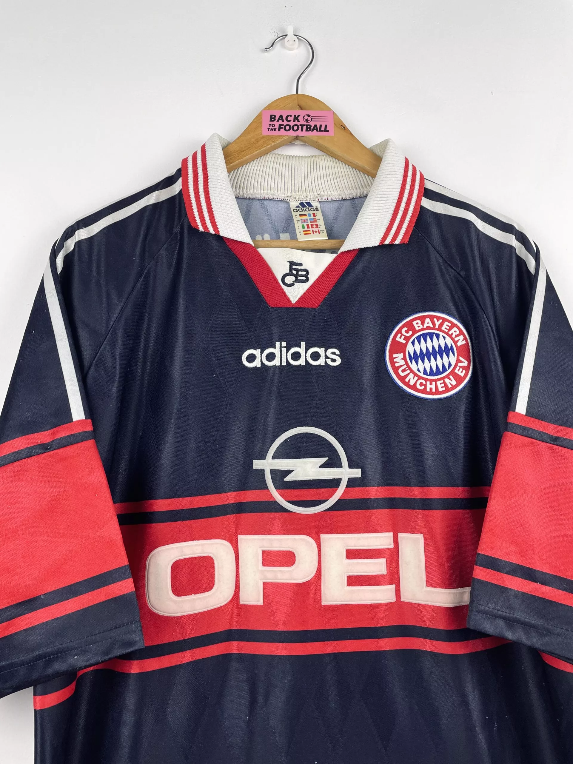 Taille : L Largeur : 58cm (aisselle à aisselle) Longueur : 73cm (base du col au bas) Si tu veux plus de détails, tu peux nous contacter par mail ou sur les réseaux 😉 Etat : 7.5/10, très bon état mais des bouloches, col légèrement jauni (voir photos) Le maillot : maillot vintage domicile du Bayern Munich 1997/1999. L’écusson et le logo Adidas sont brodés, le sponsor Opel est en feutrine. Très beau maillot rétro du Bayern ! Histoire : la 1ère saison, les bavarois finiront deuxièmes de Bundesliga mais remporteront la Coupe d’Allemagne et Coupe de la ligue d’Allemagne.…