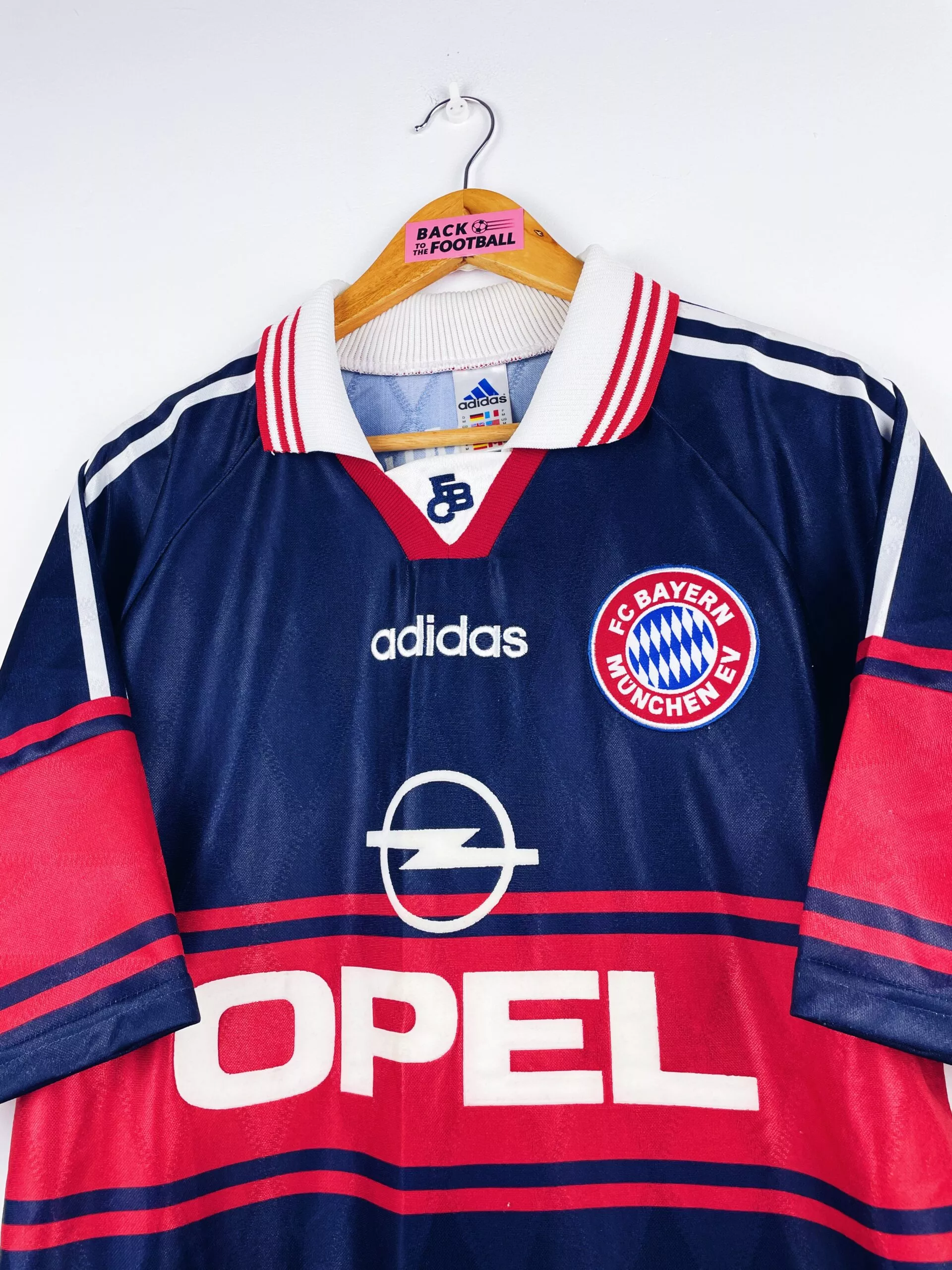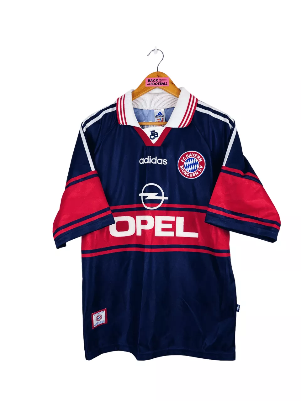 Taille : M Si tu veux plus de détails, tu peux nous contacter par mail ou sur les réseaux 😉 Etat : 8/10, très bon état Le maillot : maillot vintage domicile du Bayern Munich 1997/1999. L’écusson et le logo Adidas sont brodés, le sponsor Opel est en feutrine. Très beau maillot rétro du Bayern ! Histoire : la 1ère saison, les bavarois finiront deuxièmes de Bundesliga mais remporteront la Coupe d’Allemagne et Coupe de la ligue d’Allemagne. Elimination en quart de LDC contre Dortmund. La 2ème saison, le Bayern remporte la Bundesliga et la Coupe de la ligue. Les…