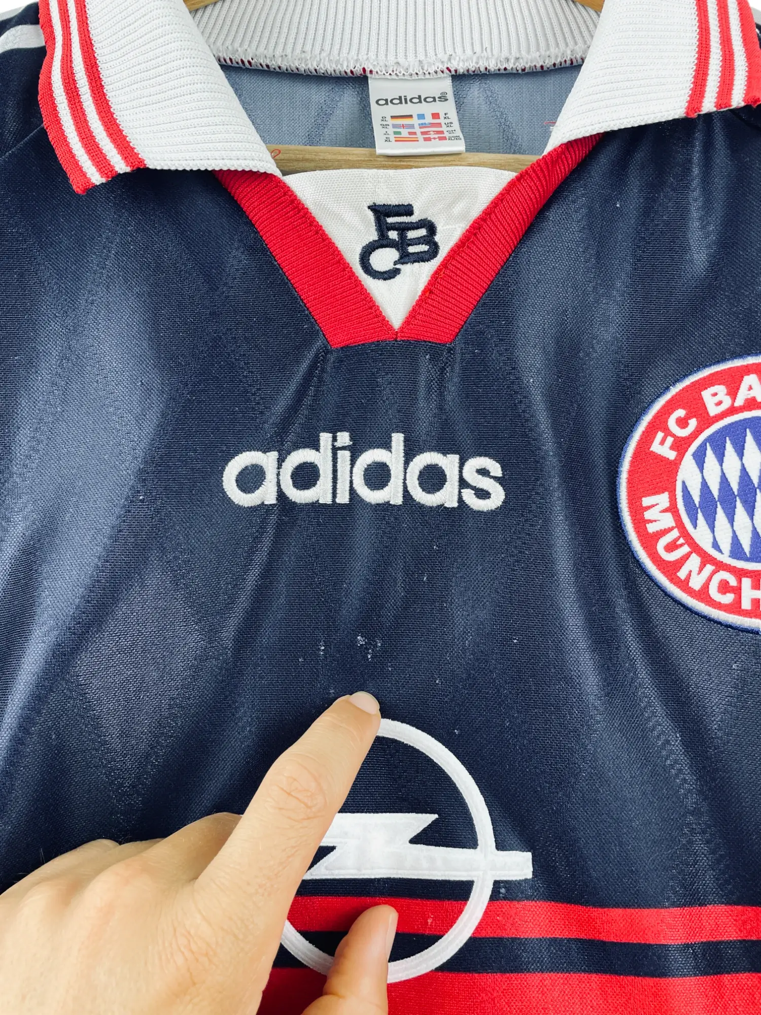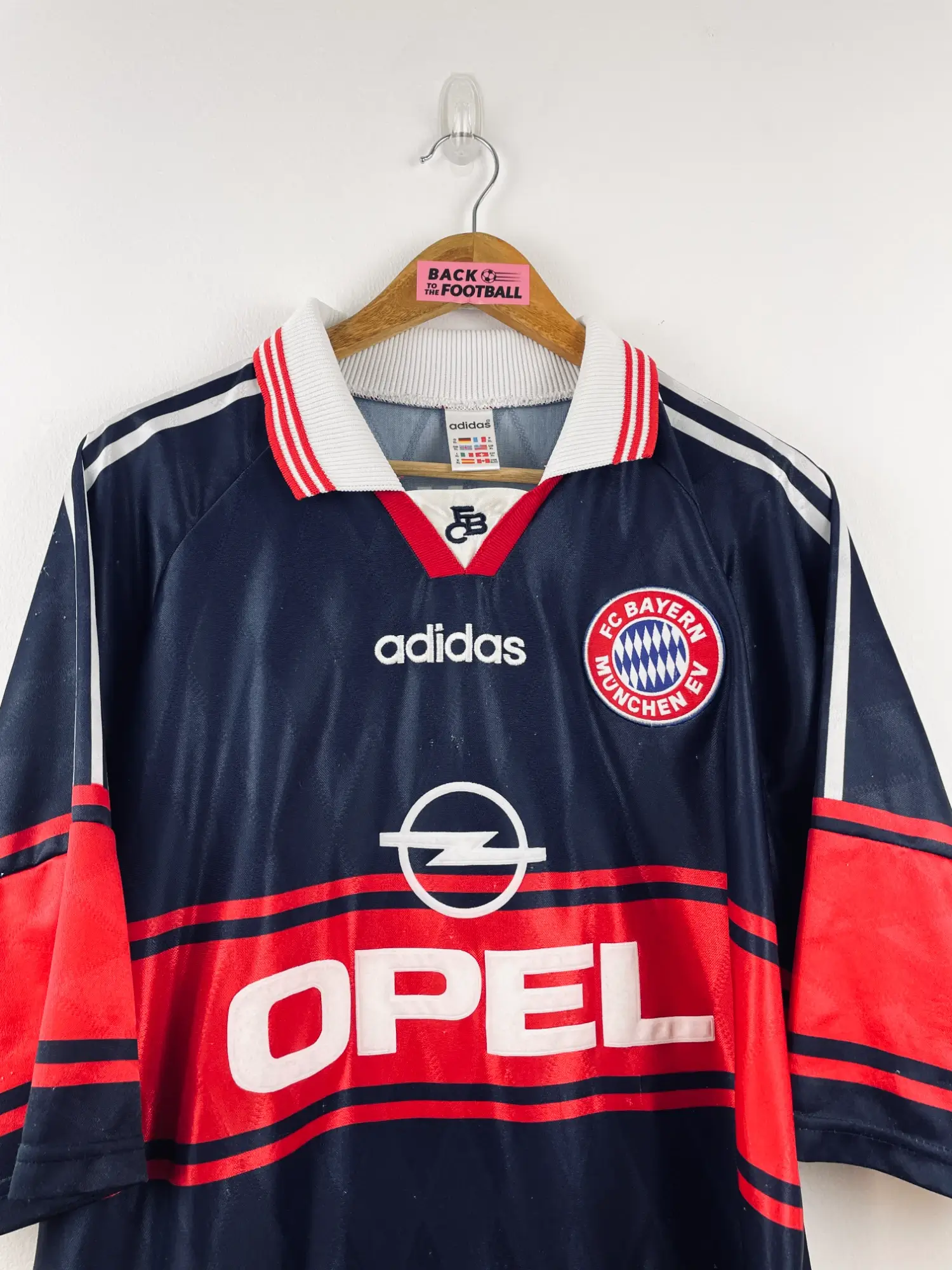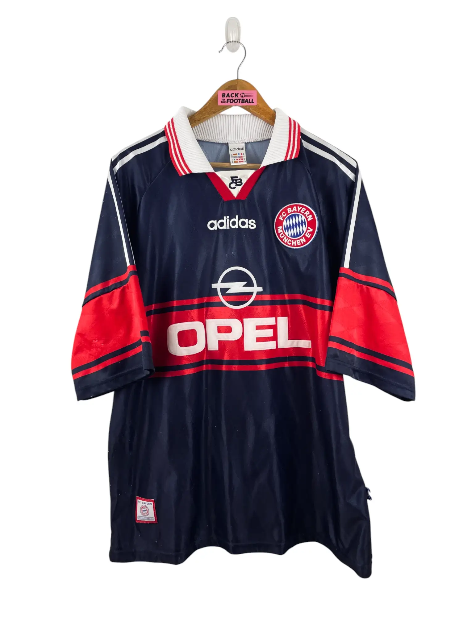 Taille : XL Largeur : 60cm (aisselle à aisselle) Longueur : 75cm (base du col au bas) Si tu veux plus de détails, tu peux nous contacter par mail ou sur les réseaux 😉 Etat : 6/10, bon état mais des bouloches (voir photos) Le maillot : maillot vintage domicile du Bayern Munich 1997/1999. L’écusson et le logo Adidas sont brodés, le sponsor Opel est en feutrine. Très beau maillot rétro du Bayern ! Histoire : la 1ère saison, les bavarois finiront deuxièmes de Bundesliga mais remporteront la Coupe d’Allemagne et Coupe de la ligue d’Allemagne. Elimination en quart de…