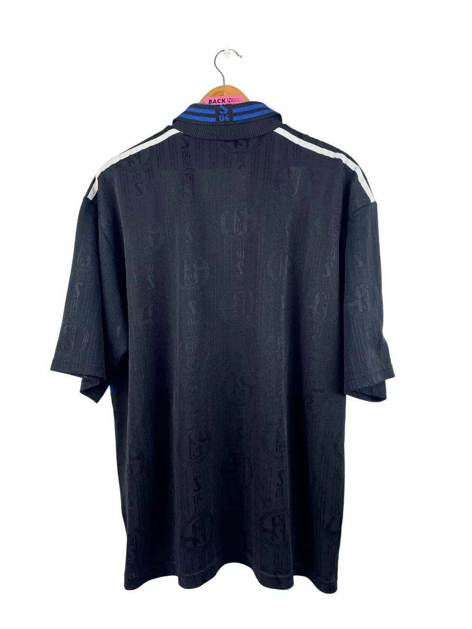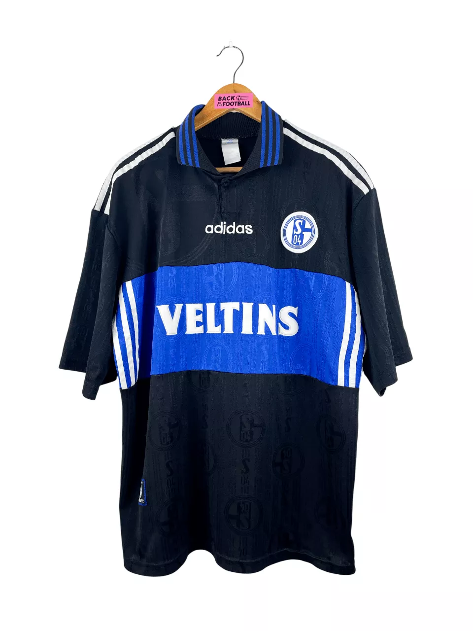 Taille : XL Largeur : 60cm (aisselle à aisselle) Longueur : 74cm (base du col au bas) Si tu veux plus d’infos, tu peux nous contacter par mail ou sur les réseaux 😉 Etat : 8.5/10, très bon état, quelques bouloches Le maillot : maillot vintage third de Schalke 04 1997/1999. L’écusson et le logo Adidas sont brodés, le sponsor Veltins est en feutrine. On peut voir l’écusson en tramé. Très beau maillot rétro de Schalke ! Histoire : la 1ère saison, le S04 termine à la 5ème place de Bundesliga. En Coupe UEFA, les joueurs iront jusqu’en quart, éliminés…