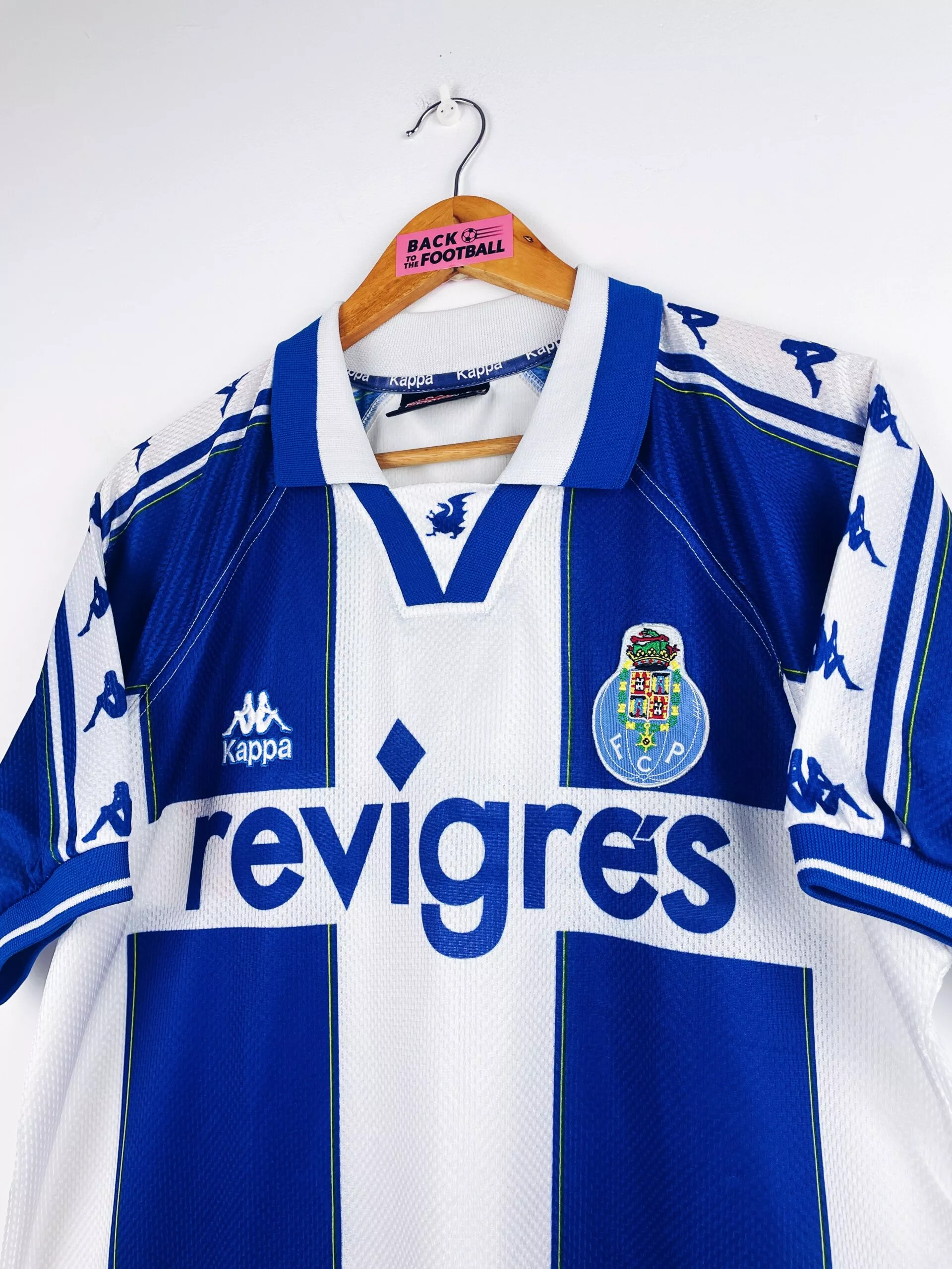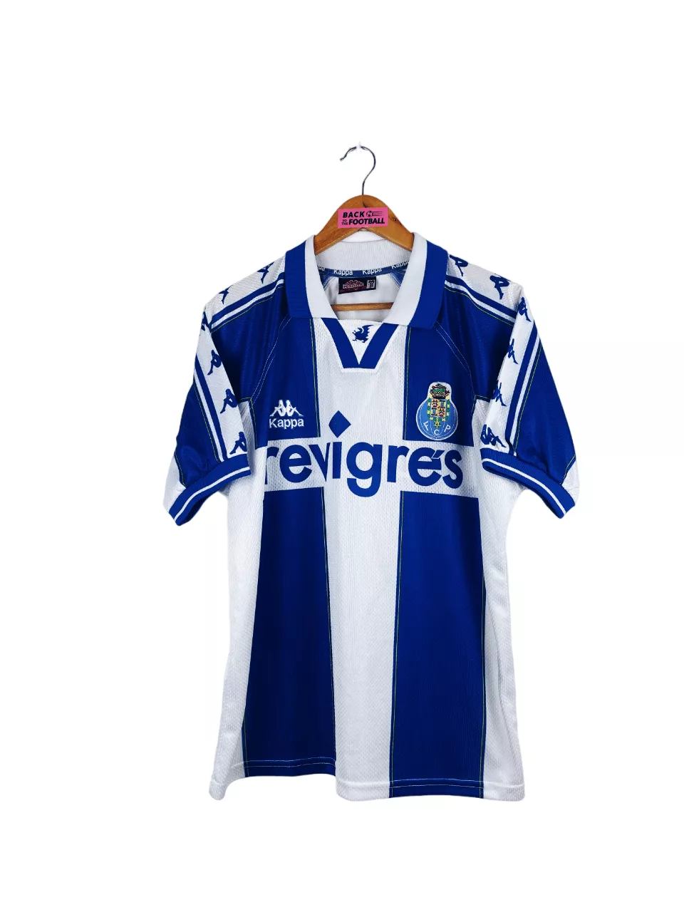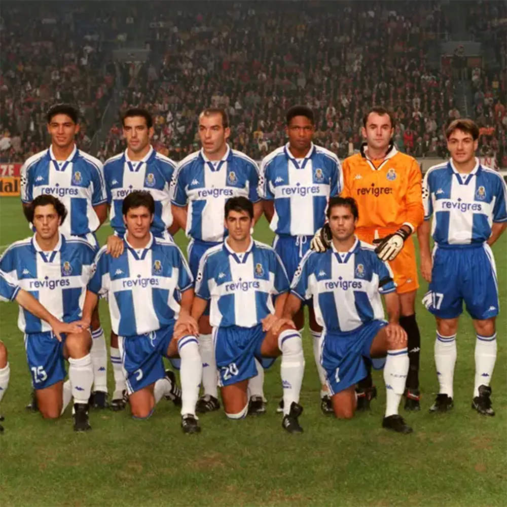 Taille : M Si tu veux plus d’infos, tu peux nous contacter par mail ou sur les réseaux 😉 Etat : 8/10, très bon état, l’écusson a perdu de sa brillance. Micro point bleu (voir photo) Le maillot : maillot vintage domicile du FC Porto 1997/1999. L’écusson et le logo Kappa sont brodés, le sponsor Revigres est incrusté. Très beau maillot rétro du FC Porto ! Histoire : deux belles saisons pour Porto qui remporte les deux championnats. Et Porto fera même le doublé lors de la saison 1997/1998 avec la coupe du Portugal. En Ligue des Champions, Porto butte…