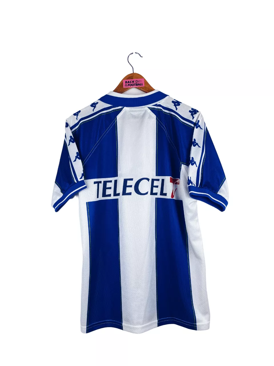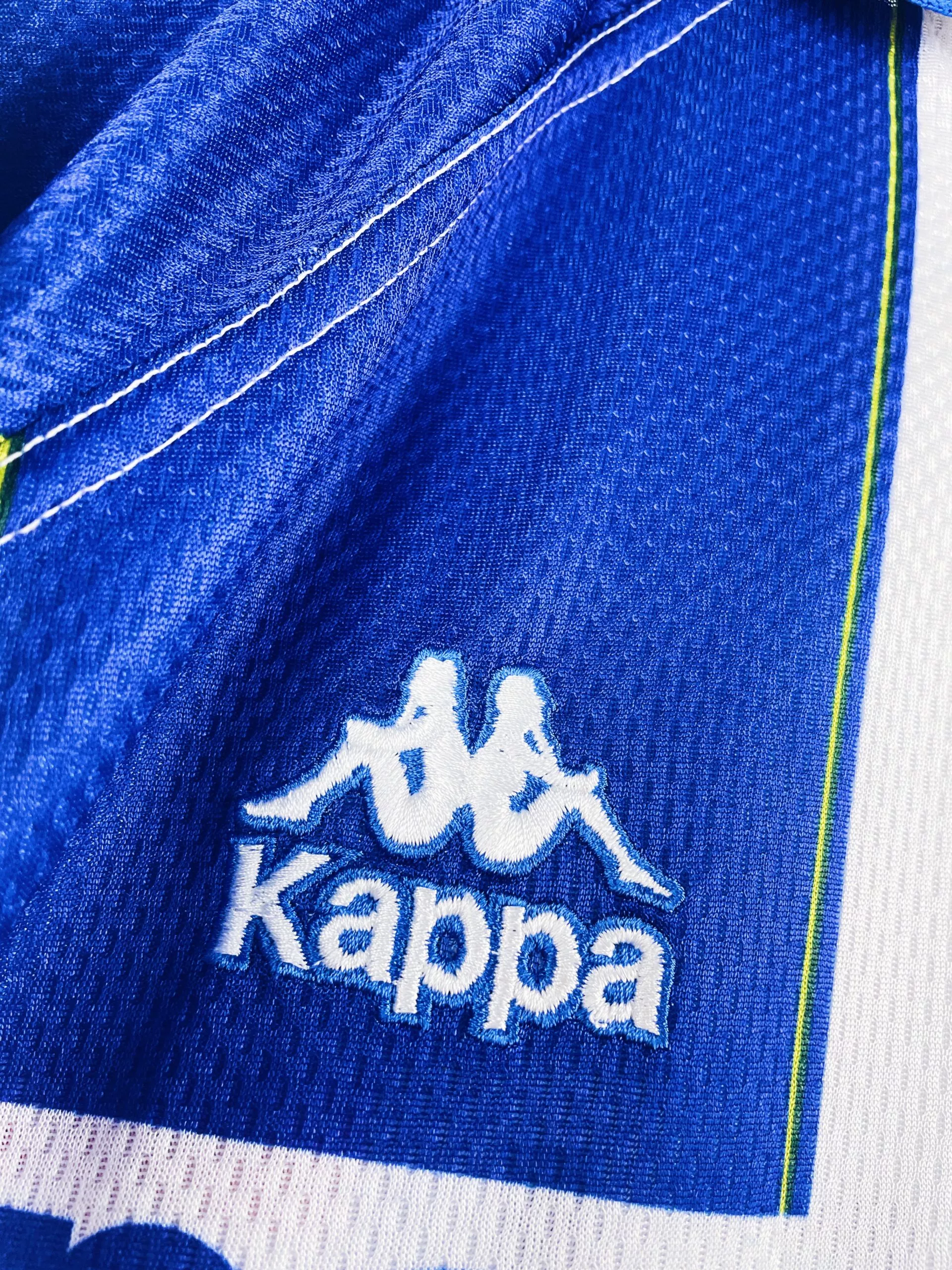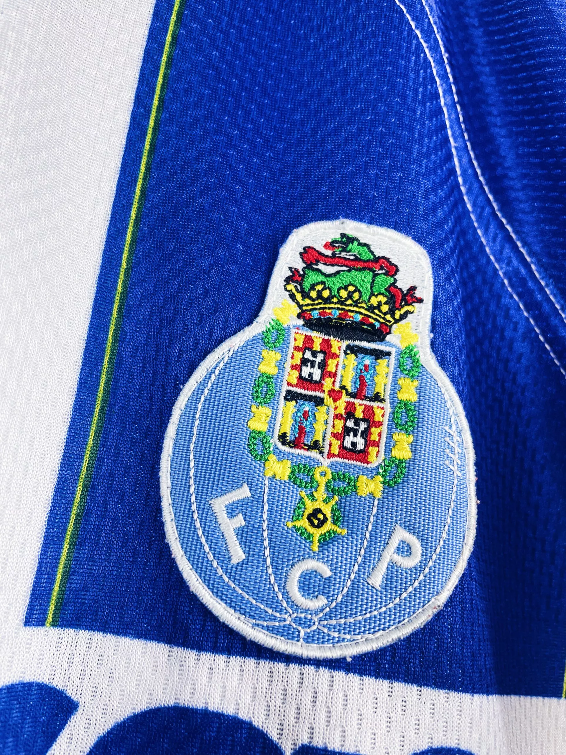 Taille : M Si tu veux plus d’infos, tu peux nous contacter par mail ou sur les réseaux 😉 Etat : 8/10, très bon état, l’écusson a perdu de sa brillance. Micro point bleu (voir photo) Le maillot : maillot vintage domicile du FC Porto 1997/1999. L’écusson et le logo Kappa sont brodés, le sponsor Revigres est incrusté. Très beau maillot rétro du FC Porto ! Histoire : deux belles saisons pour Porto qui remporte les deux championnats. Et Porto fera même le doublé lors de la saison 1997/1998 avec la coupe du Portugal. En Ligue des Champions, Porto butte…