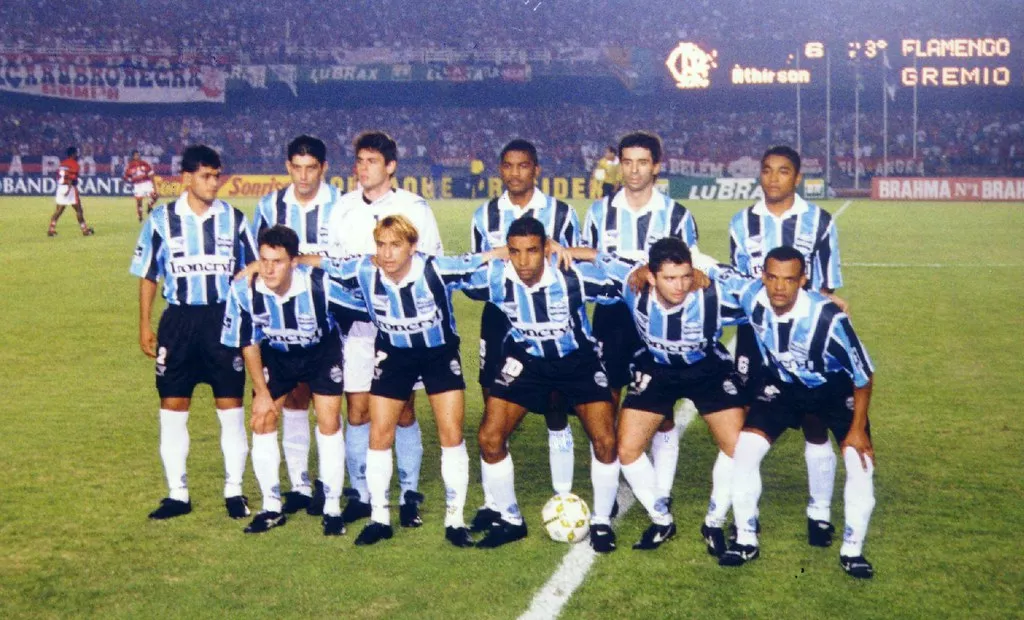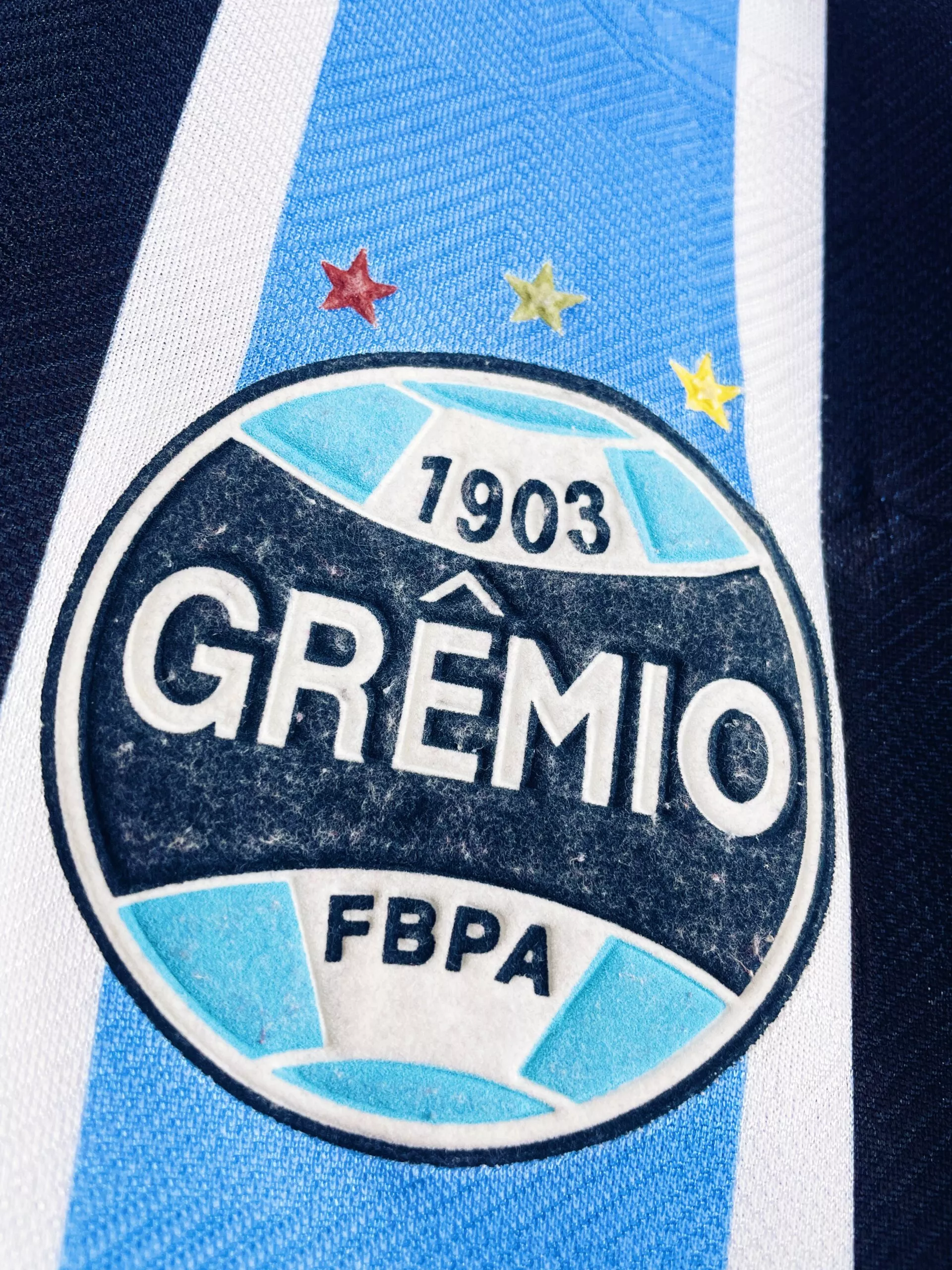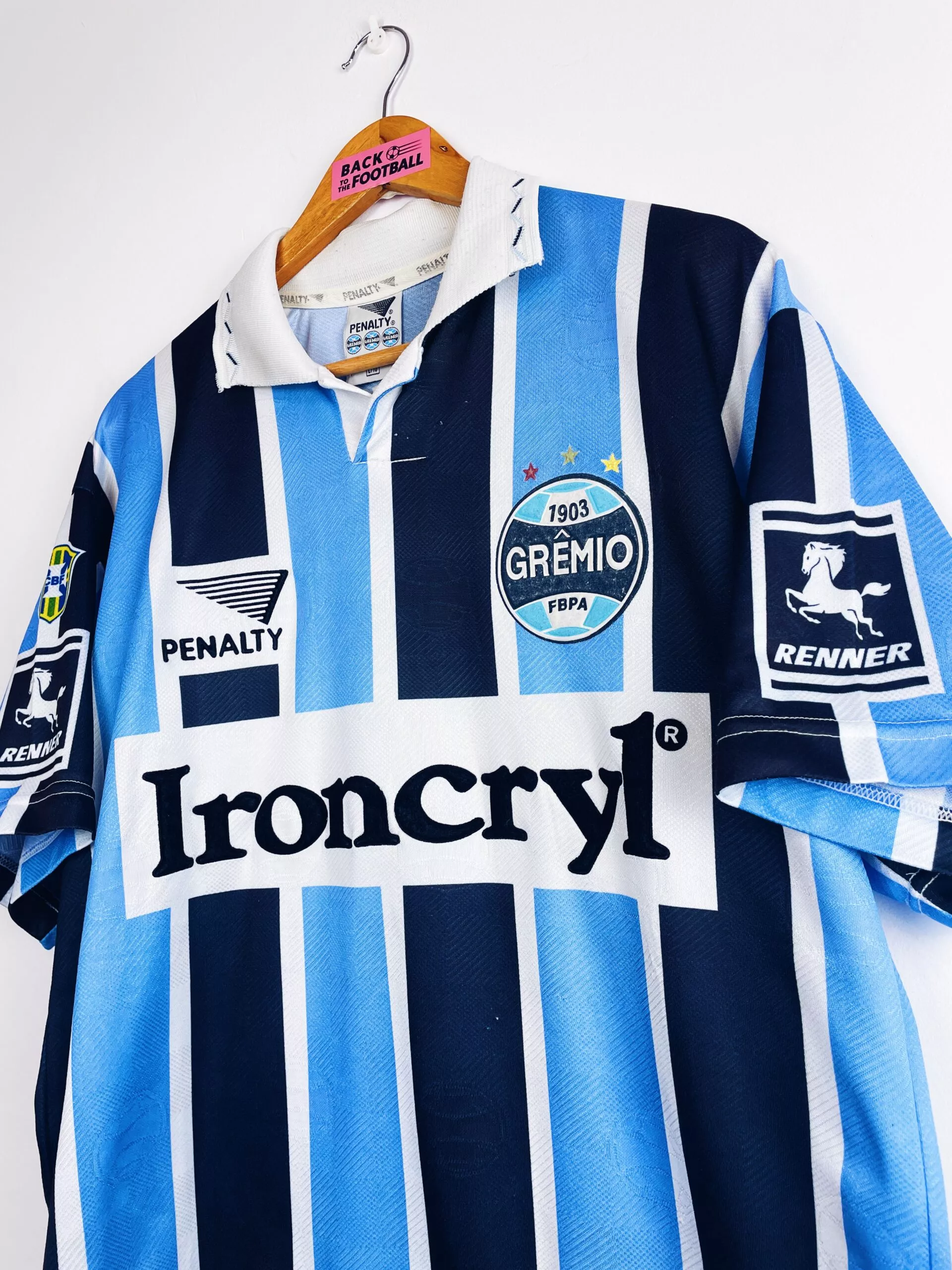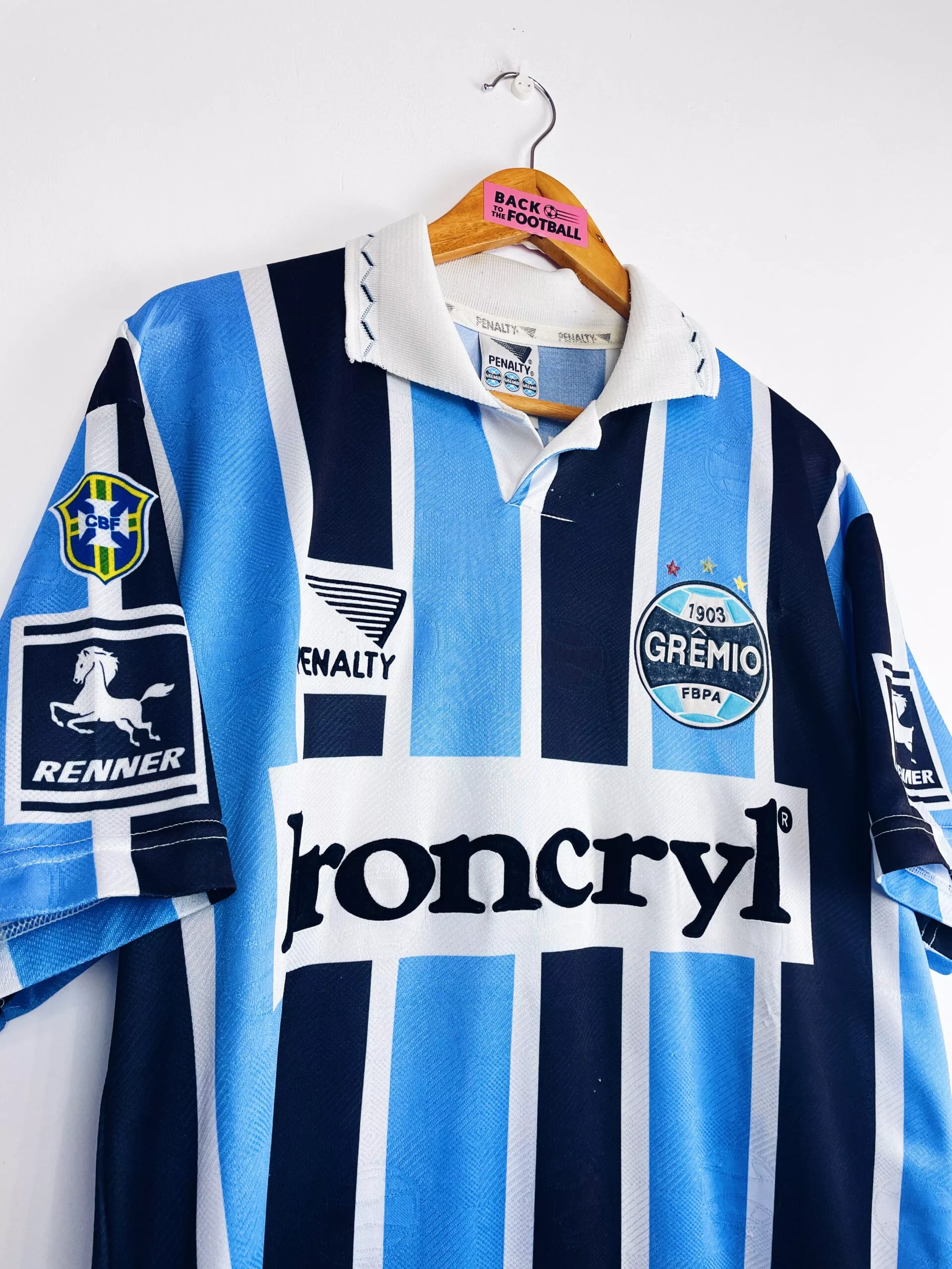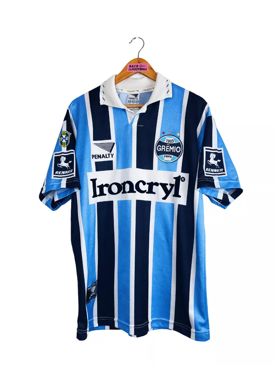 Taille : L Si tu veux plus de détails, tu peux nous contacter par mail ou sur les réseaux 😉 Etat : 8/10, très bon état Le maillot : maillot vintage domicile du Grêmio 1997 floqué du numéro 7. L’écusson, le logo Penalty et le sponsor Ironcryl sont en feutrine. Les autres éléments sont incrustés. Très beau maillot rétro du Grêmio ! Histoire : le club de Porto Alegre termine à la 14ème place du championnat brésilien (sur 26). Magnifique parcours en Coupe du Brésil avec une victoire en finale contre Flamengo. Les brésiliens seront éliminés en quart de Copa…