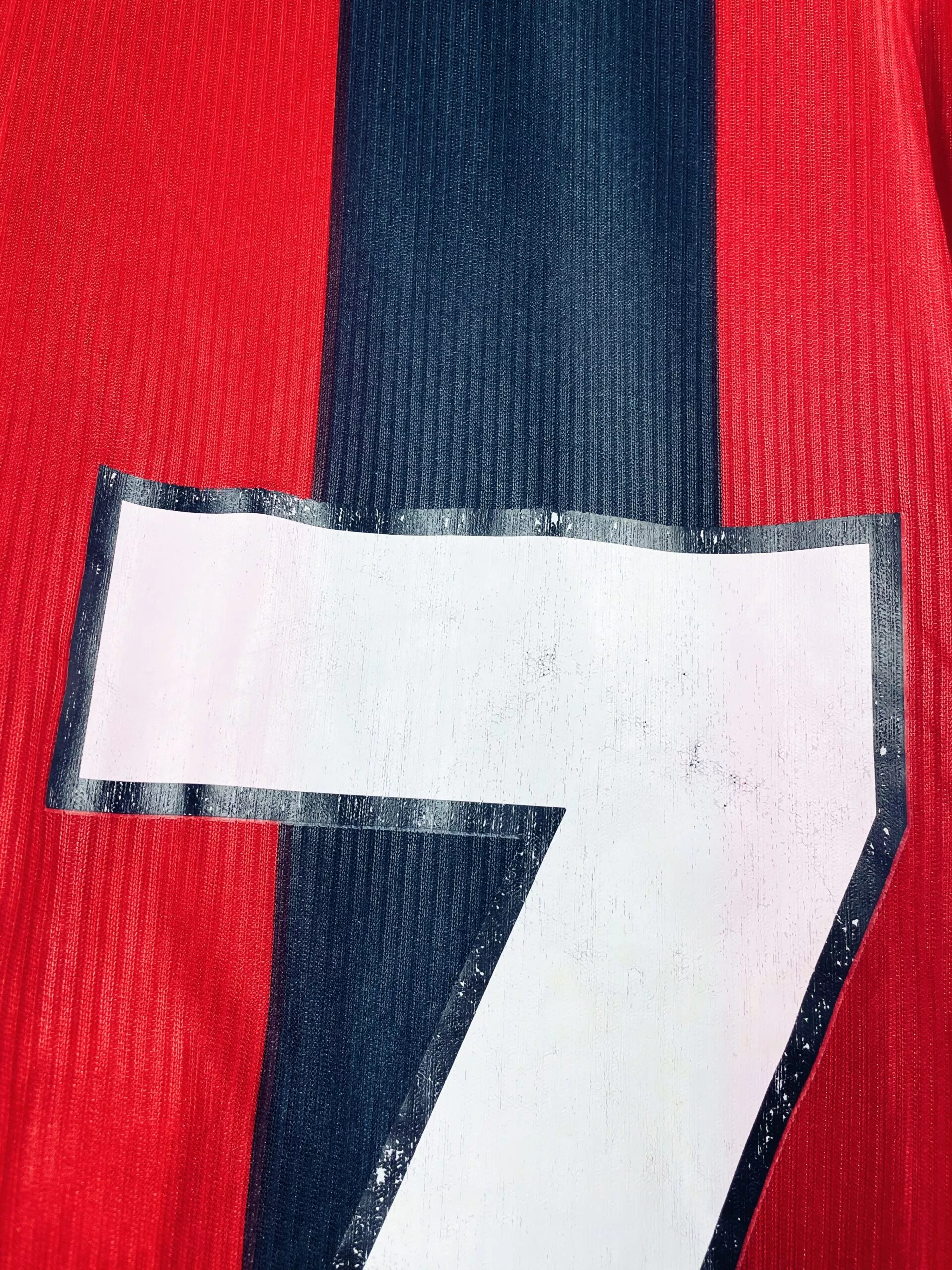 Taille : XL Si tu veux plus de détails, tu peux nous contacter par mail ou sur les réseaux 😉 Etat : 8/10, très bon état, flocage abimé (voir photo) Le maillot : maillot vintage domicile de l’AC Milan 1998/1999 porté (match worn) par le numéro 27. L’écusson et le logo Adidas sont brodés. Le sponsor Opel est en feutrine. Le 27 est floqué. Très beau maillot rétro de l’AC Milan ! Histoire : maillot porté par le numéro 27, sûrement Francesco Coco, lors d’un match amical : absence de patch, pas de nom au dos. Récupéré via un proche…