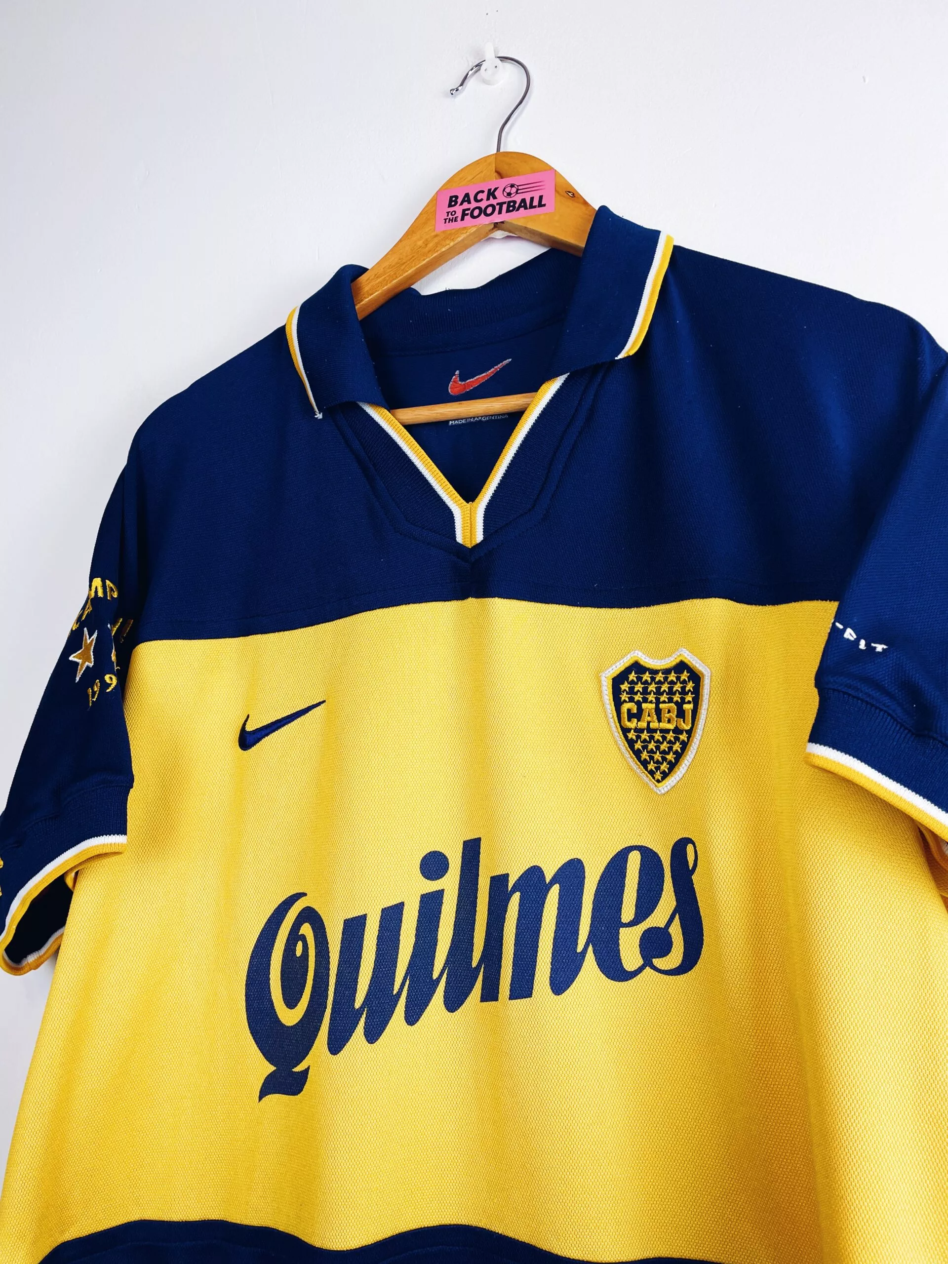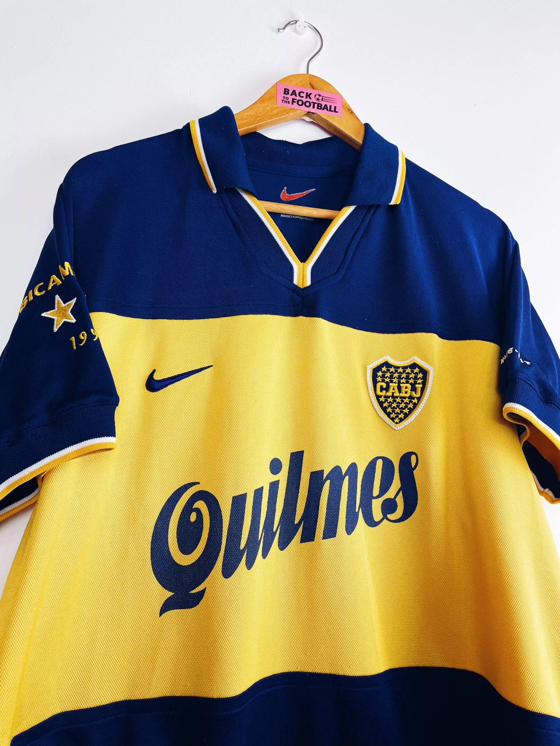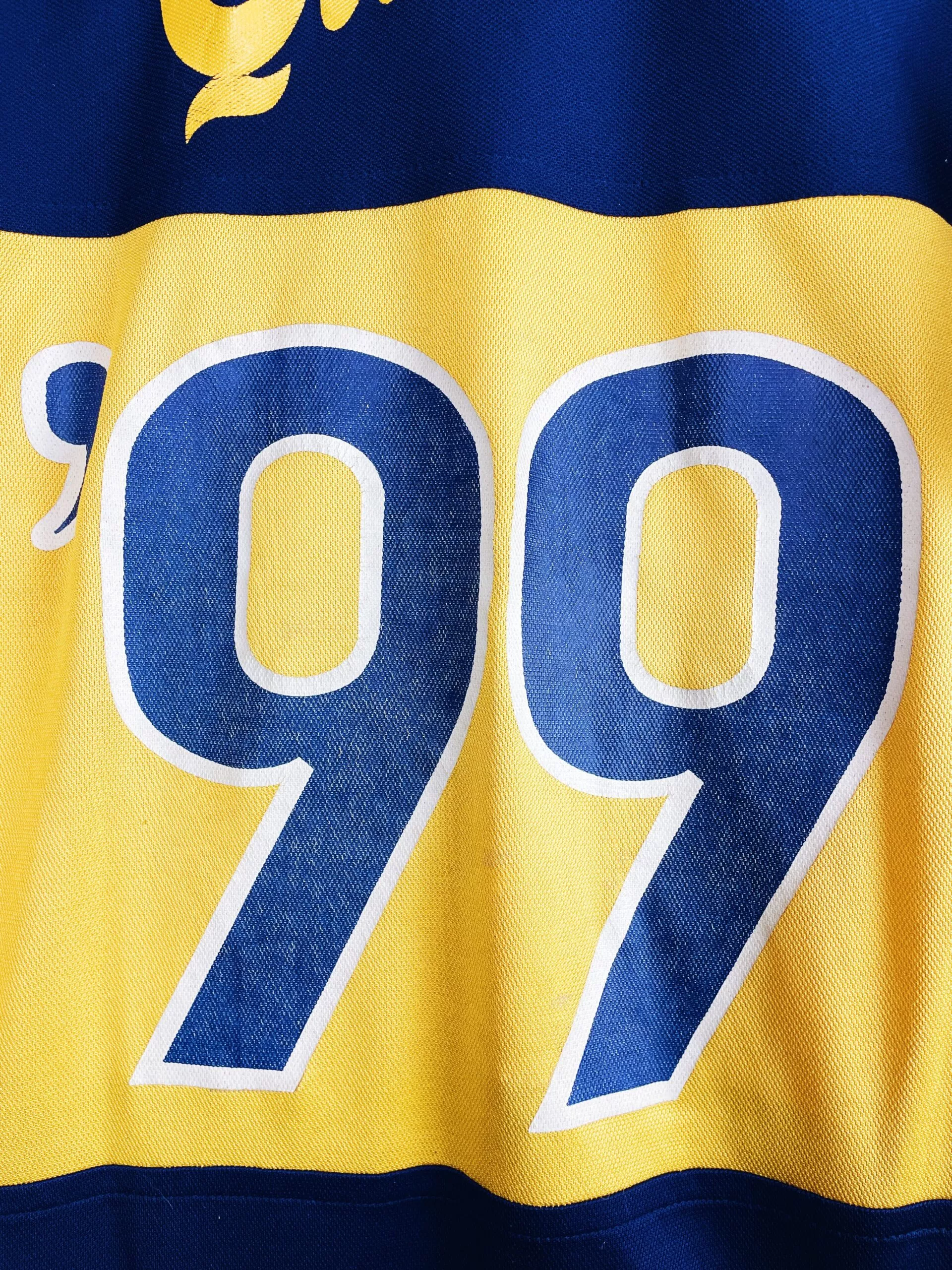 Taille : M Si tu veux plus d’infos, tu peux nous contacter par mail ou sur les réseaux 😉 Etat : 8/10, très bon état hormis quelques légères bouloches, le sponsor Quilmes dans le dos un peu craquelé (voir photos) Le maillot : maillot vintage domicile du Boca Juniors 1998/1999 floqué Bicampeónes #99. L’écusson du club est brodé, le logo Nike aussi. Les sponsors sont floqués. La mention Bicampeón 1999 sur la manche est brodé. Très beau maillot rétro du Boca Juniors ! Histoire : très grosse saison du Boca Juniors avec un titre de champion sur le tournoi d’ouverture…