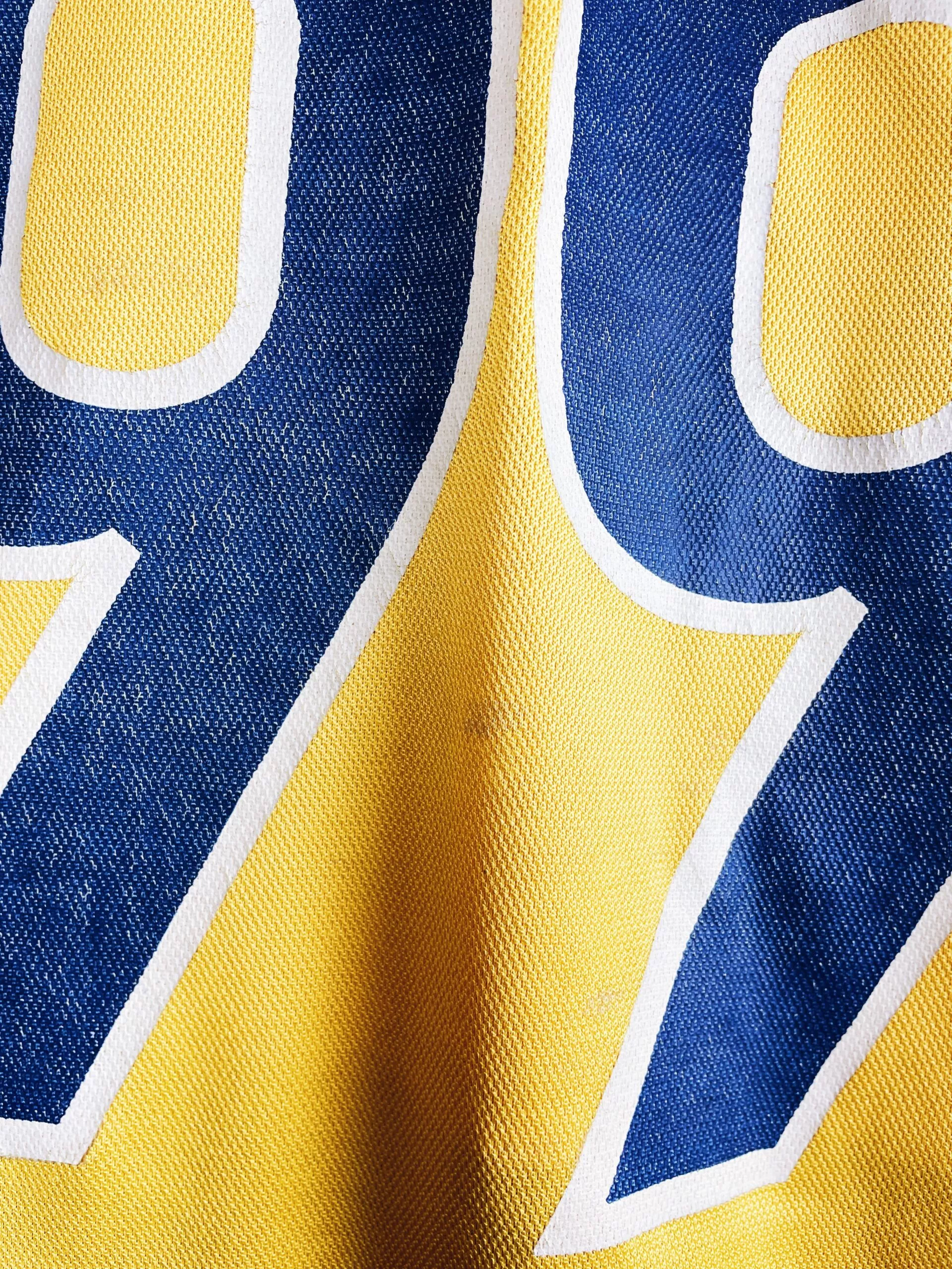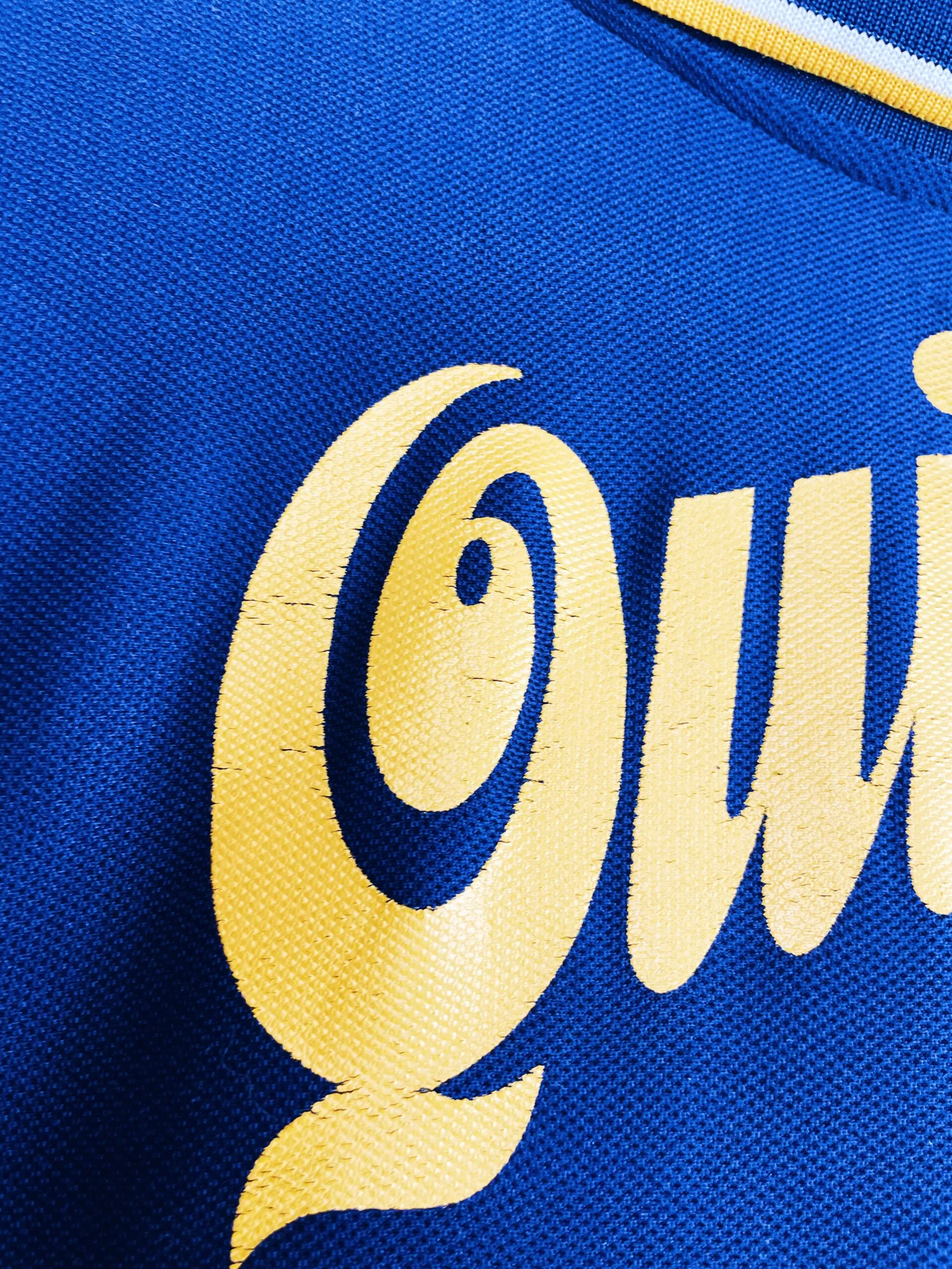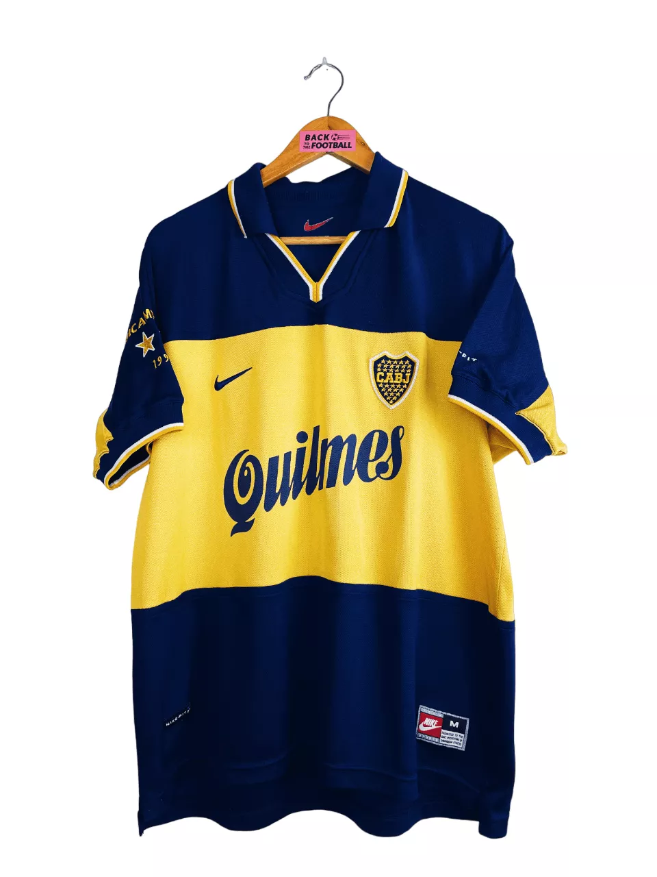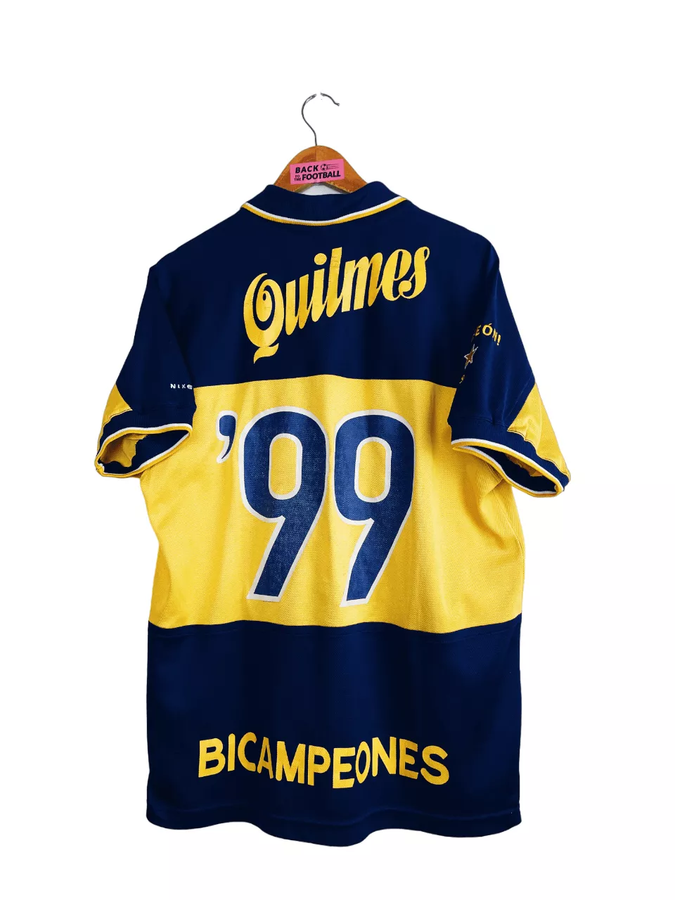 Taille : M Si tu veux plus d’infos, tu peux nous contacter par mail ou sur les réseaux 😉 Etat : 8/10, très bon état hormis quelques légères bouloches, le sponsor Quilmes dans le dos un peu craquelé (voir photos) Le maillot : maillot vintage domicile du Boca Juniors 1998/1999 floqué Bicampeónes #99. L’écusson du club est brodé, le logo Nike aussi. Les sponsors sont floqués. La mention Bicampeón 1999 sur la manche est brodé. Très beau maillot rétro du Boca Juniors ! Histoire : très grosse saison du Boca Juniors avec un titre de champion sur le tournoi d’ouverture…