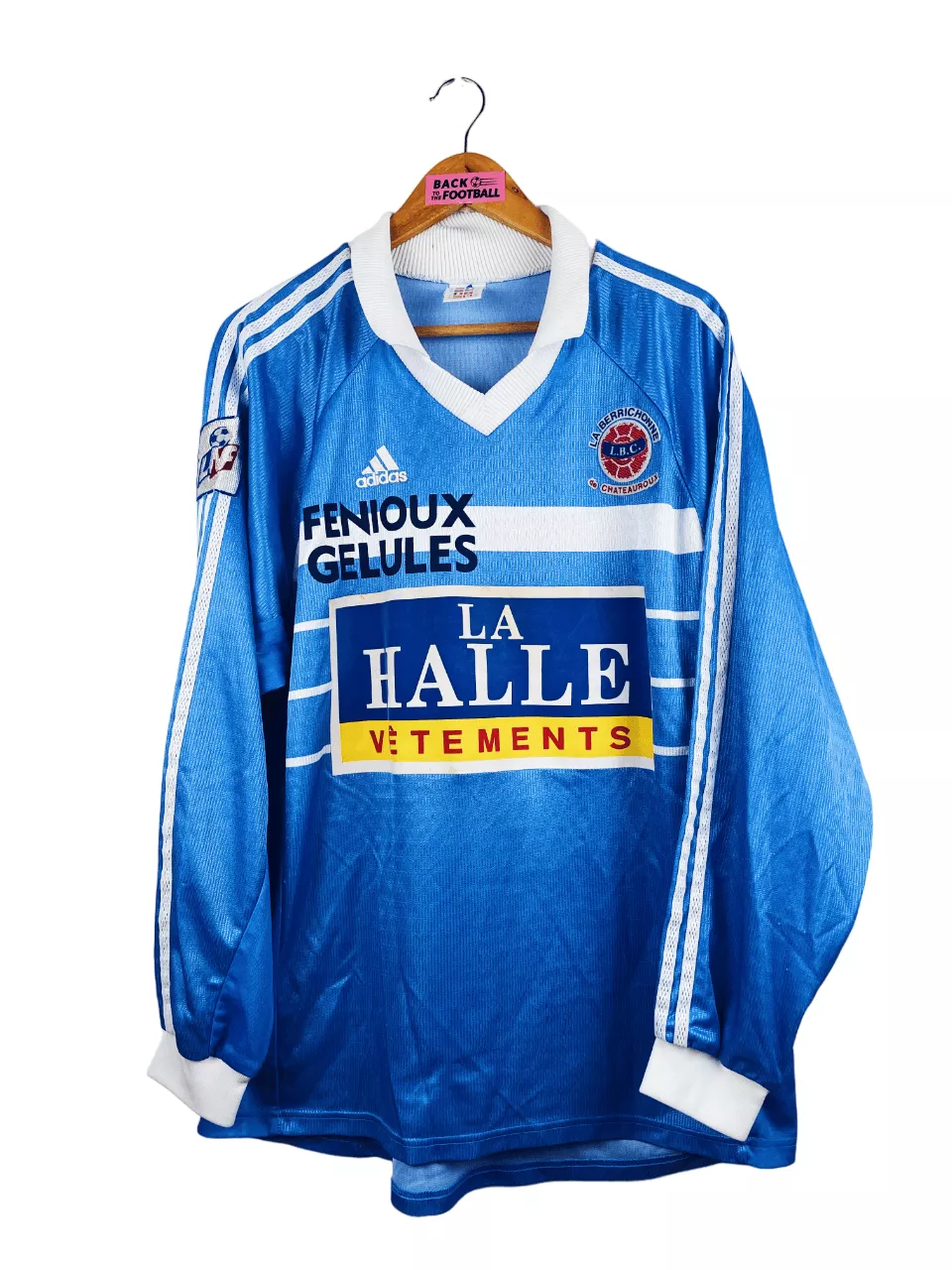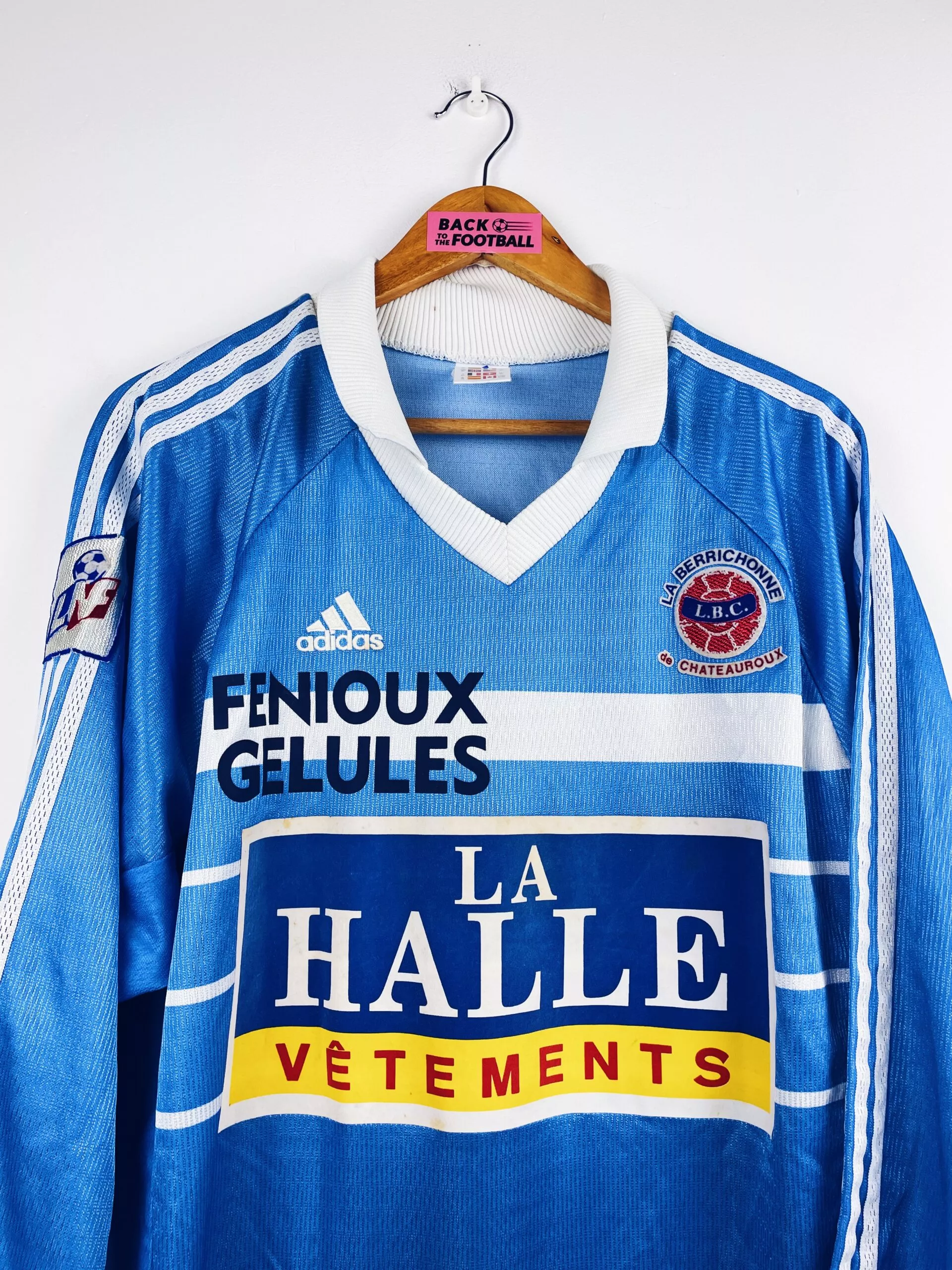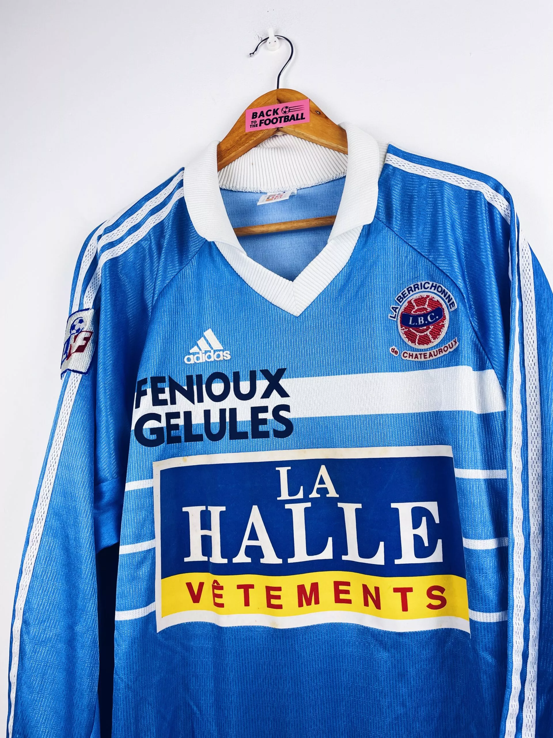 Taille : XL Si tu veux plus de détails, tu peux nous contacter par mail ou sur les réseaux 😉 Etat : 8/10, très bon état général, minis traces dans le col, petite trace sur le sponsor (voir photos) Le maillot : maillot vintage third de Châteauroux 1998/1999 manches longues porté (match worn) par le numéro 2. L’écusson et le sponsor La Halle vêtements sont en feutrine, le logo Adidas brodé, le sponsor Fenioux Gelules et le numéro 2 sont floqués. Le patch LNF est en feutrine. Joli maillot rétro de la Berrichonne ! Histoire : la Berrichonne termine à…