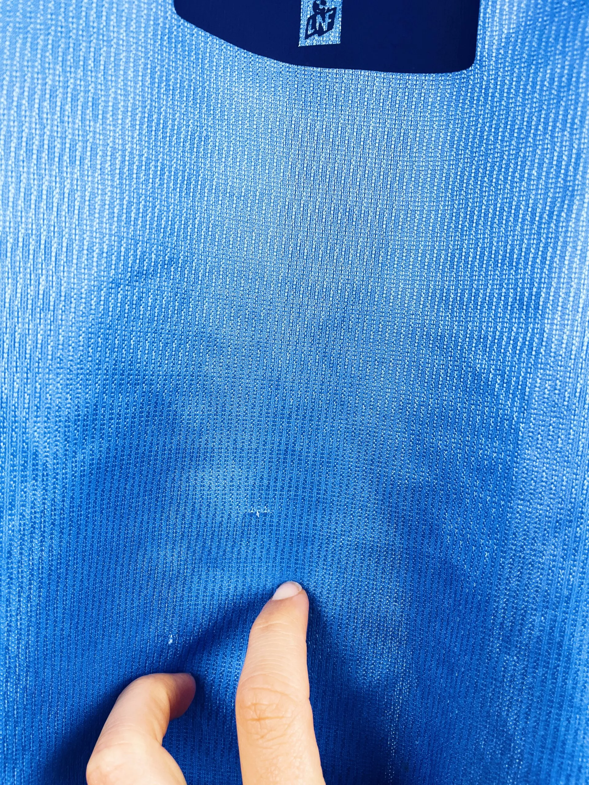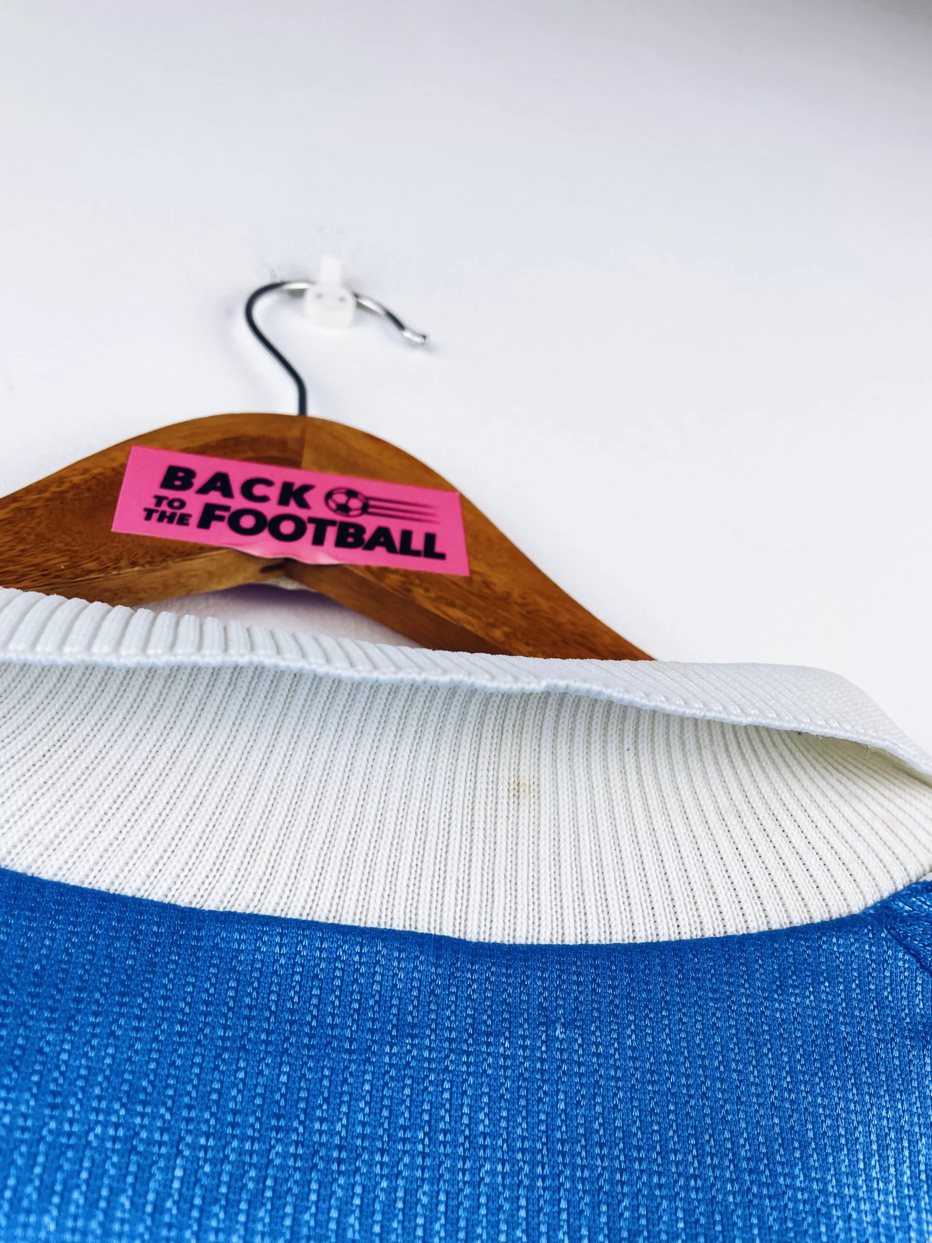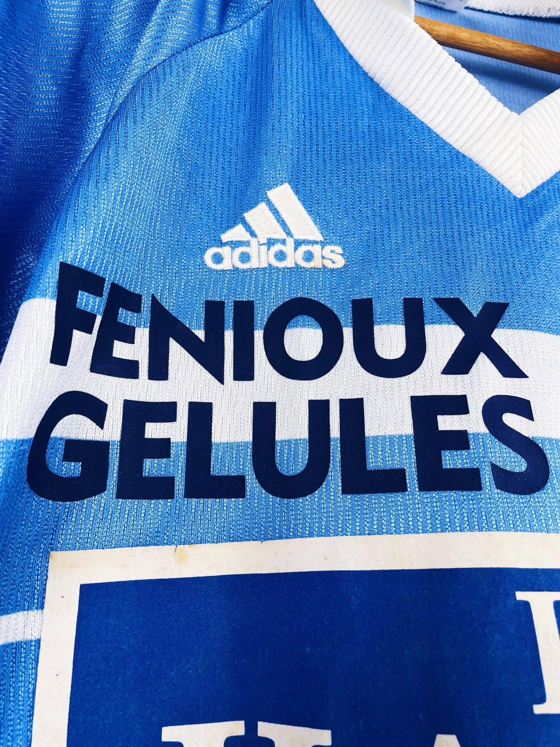 Taille : XL Si tu veux plus de détails, tu peux nous contacter par mail ou sur les réseaux 😉 Etat : 8/10, très bon état général, minis traces dans le col, petite trace sur le sponsor (voir photos) Le maillot : maillot vintage third de Châteauroux 1998/1999 manches longues porté (match worn) par le numéro 2. L’écusson et le sponsor La Halle vêtements sont en feutrine, le logo Adidas brodé, le sponsor Fenioux Gelules et le numéro 2 sont floqués. Le patch LNF est en feutrine. Joli maillot rétro de la Berrichonne ! Histoire : la Berrichonne termine à…