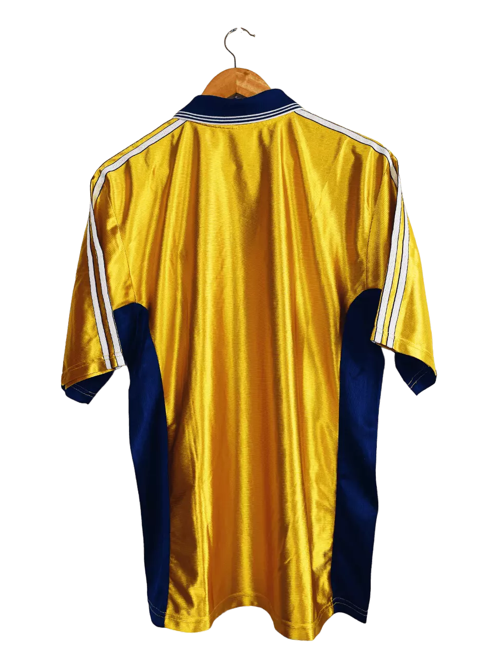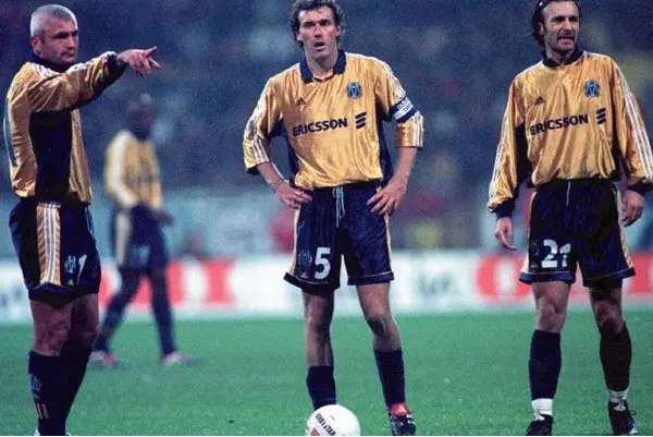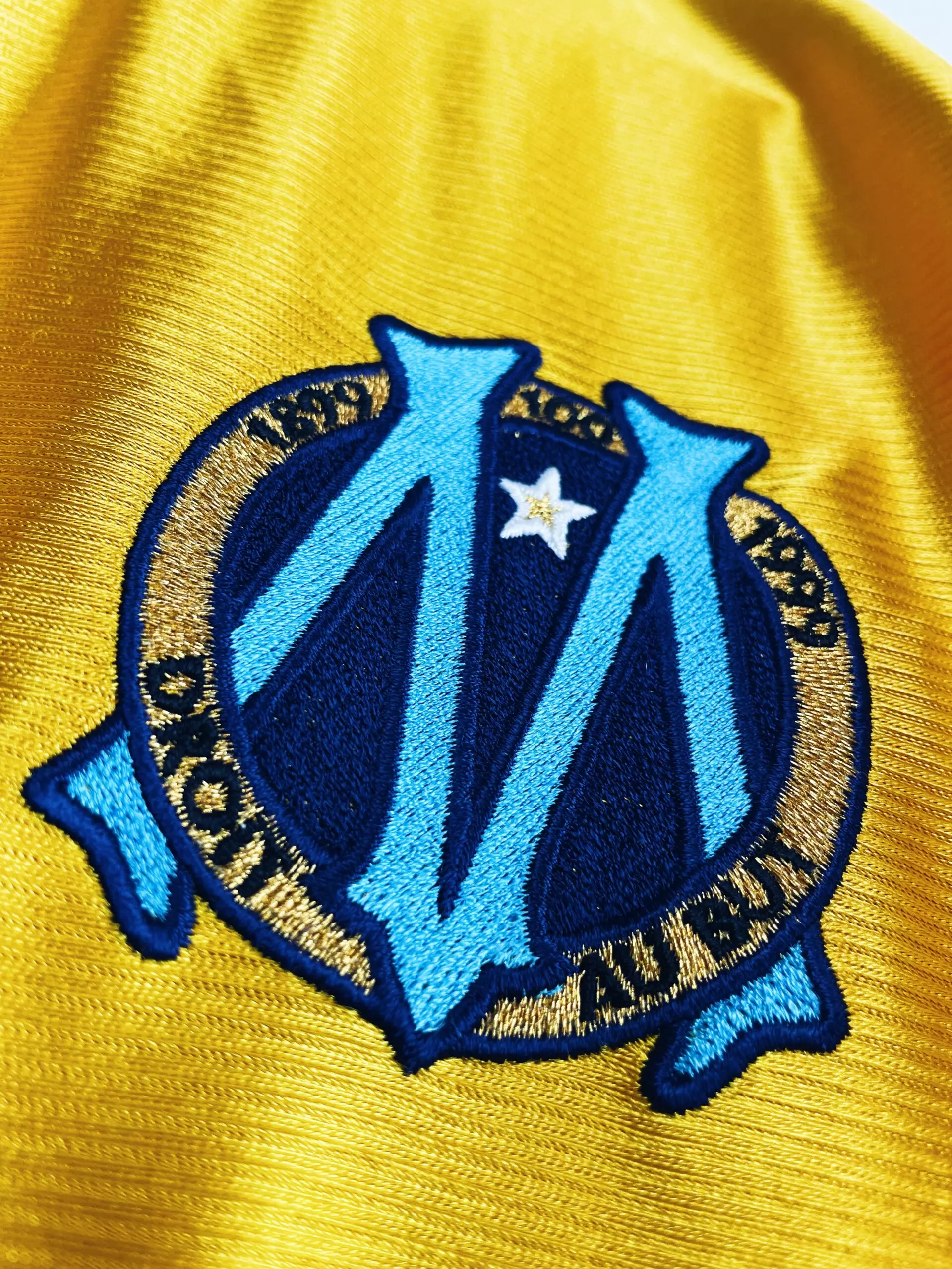 Taille : XL Etat : 8/10, très bon état, quelques légères bouloches Le maillot : maillot vintage third de l’Olympique de Marseille 1998/1999, pour les 100 ans du club. L’écusson spécial Centenaire et le logo Adidas sont brodés. Le sponsor Ericsson est en feutrine. Très beau maillot rétro de l’OM ! Histoire : pour les 100 ans du club, les Olympiens de Rolland Courbis passent très proches d’un doublé historique. En championnat, l’OM termine à la 2ème place, à un point derrière les Girondins de Bordeaux qui iront gagner le PSG 3-2 à la dernière journée… En Coupe UEFA, Marseille…