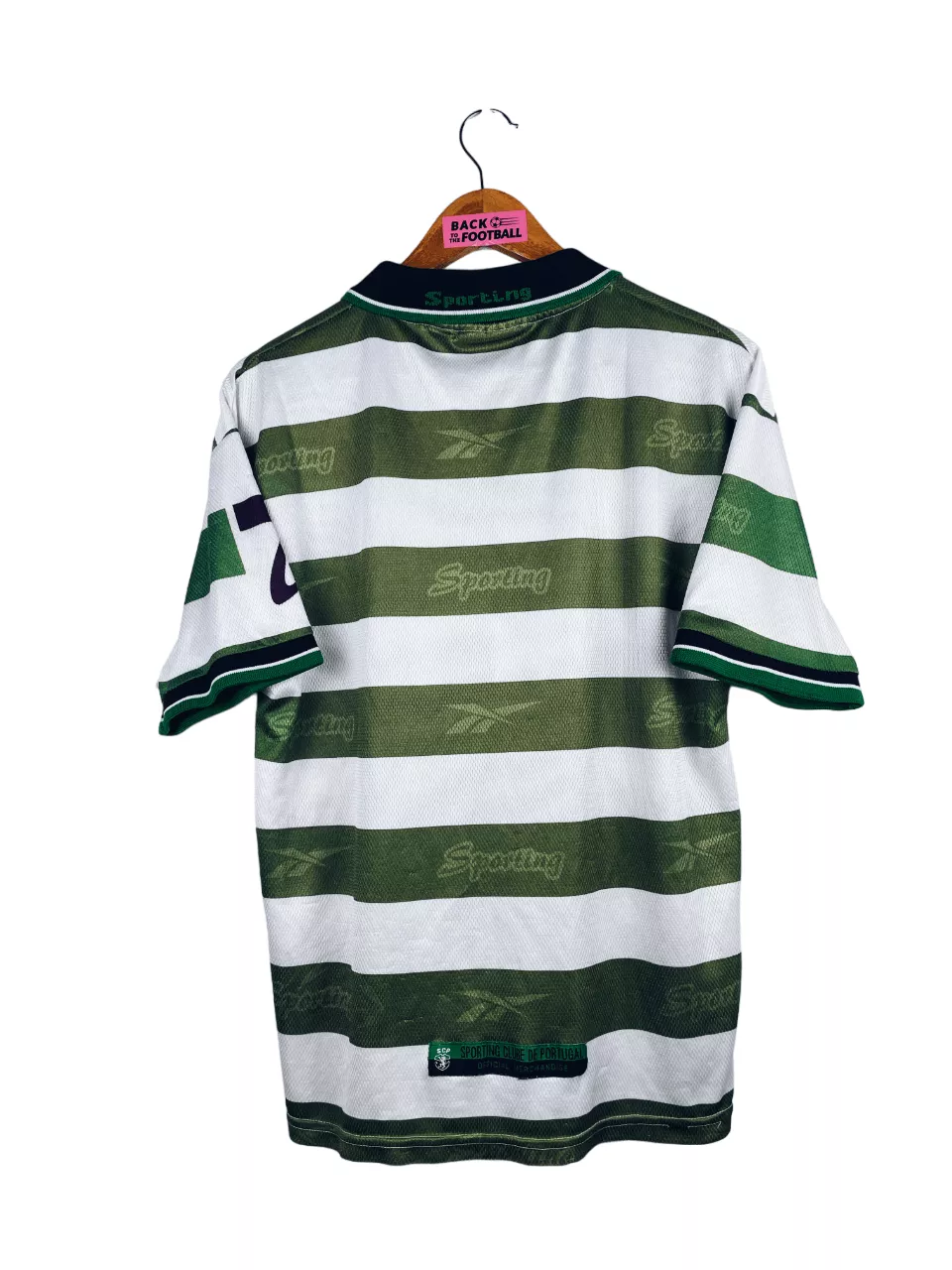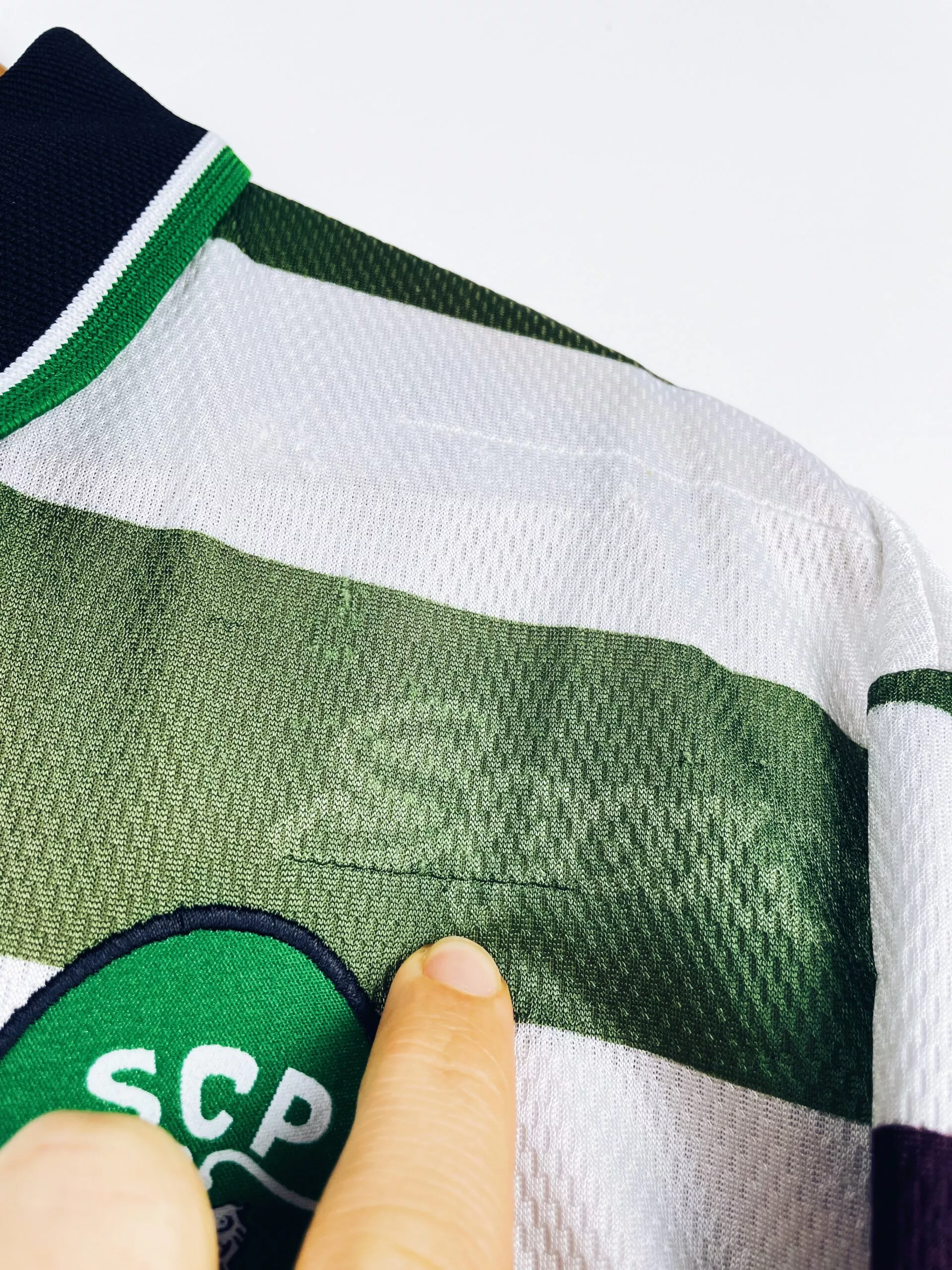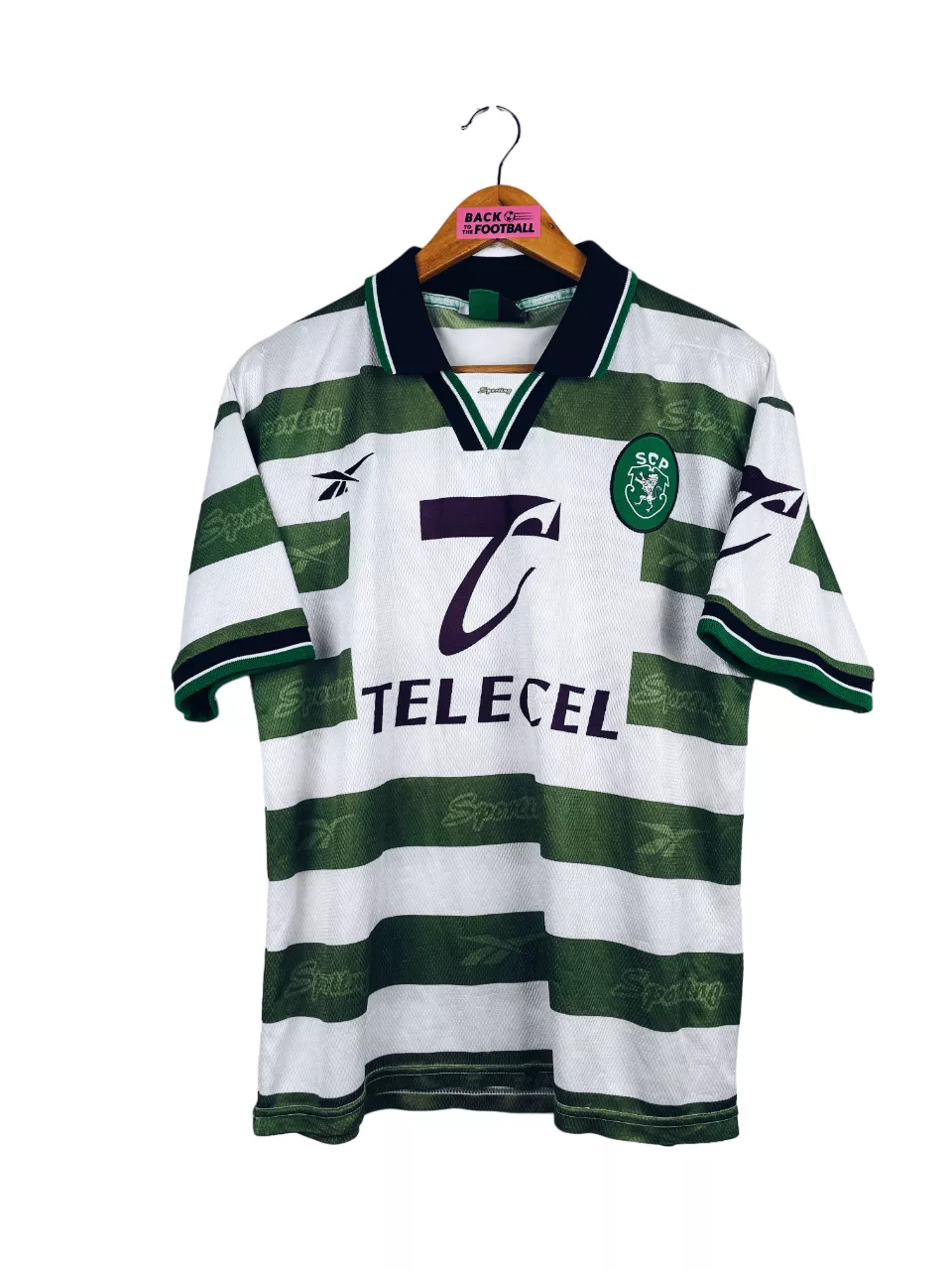 Taille : M Largeur : 54cm (aisselle à aisselle) Longueur : 63cm (haut de l’épaule au bas du maillot) Si tu veux plus d’infos, tu peux nous contacter par mail ou sur les réseaux 😉 Etat : 7/10. bon état général mais beaucoup de petits accrocs et le vert est moins brillant (voir photos) Le maillot : maillot vintage domicile du Sporting Lisbonne 1998/1999. L’écusson et le logo Reebok sont brodés, le sponsor Telecel est incrusté. On peut voir en tramé le logo Reebok et l’inscription « Sporting ». Très beau maillot rétro du Sporting CP ! Histoire : le Sporting termine…
