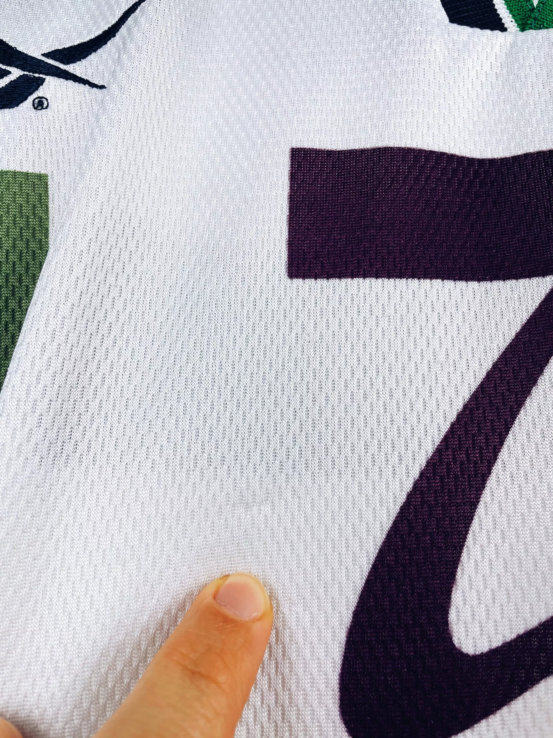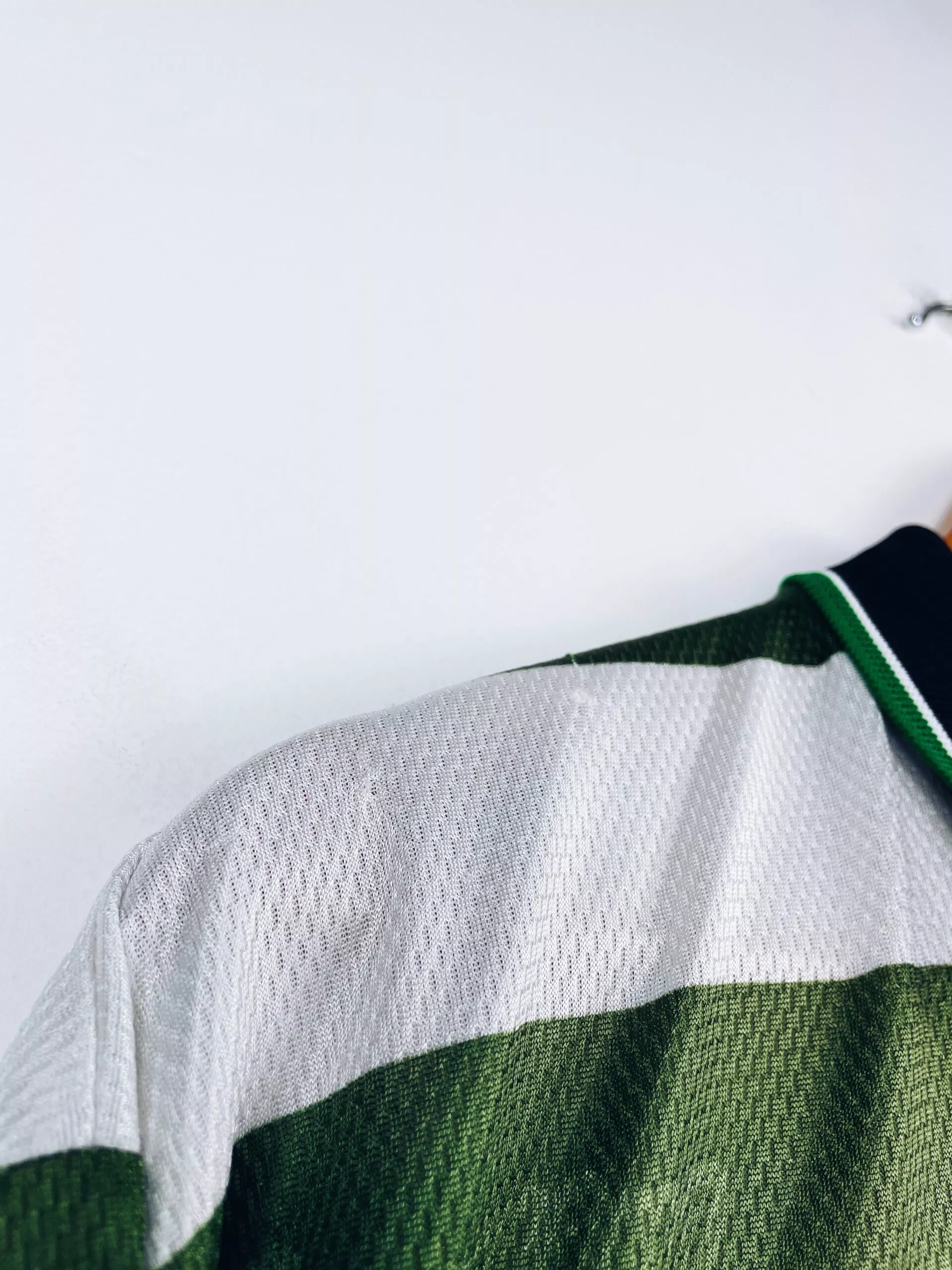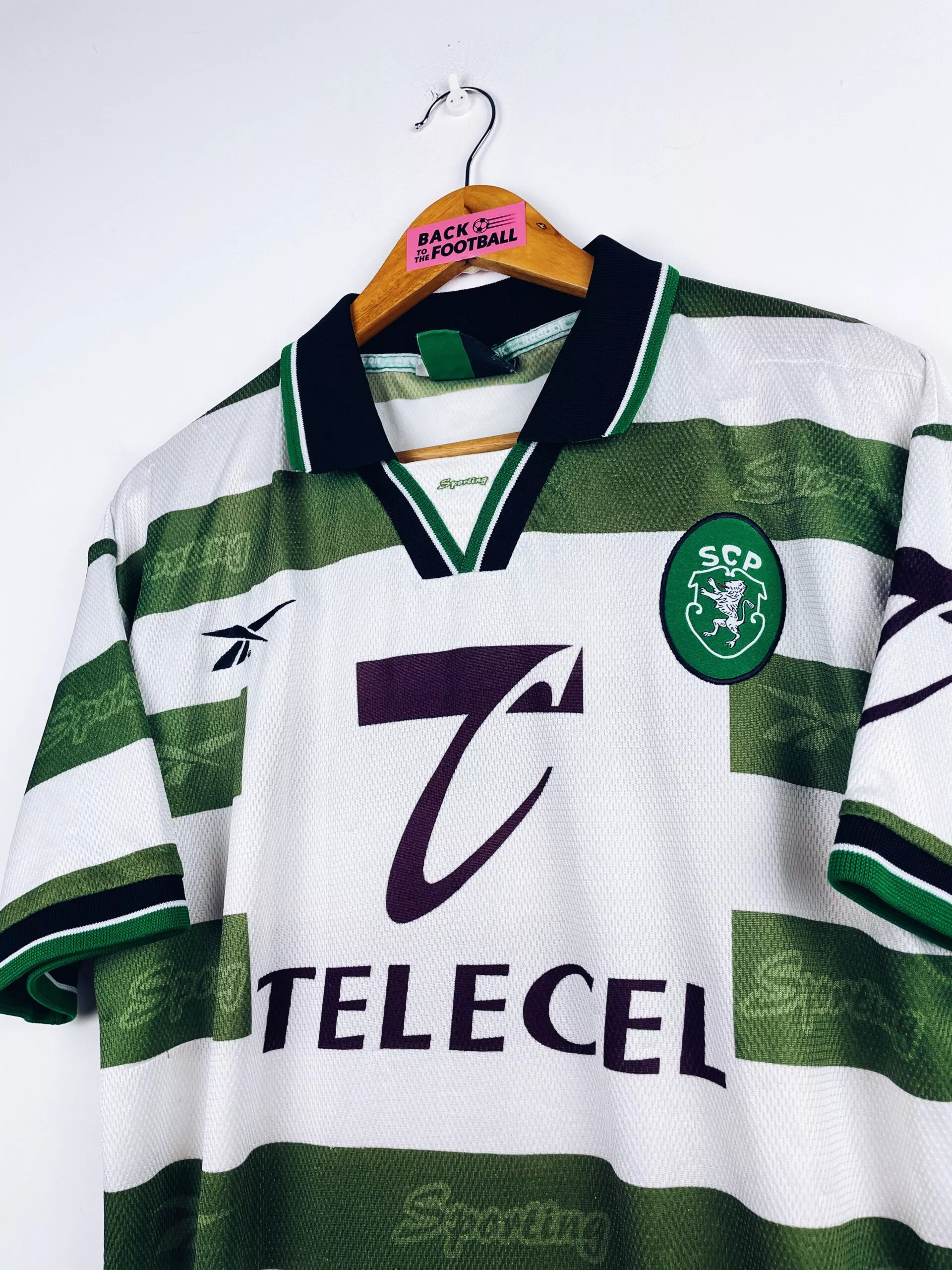 Taille : M Largeur : 54cm (aisselle à aisselle) Longueur : 63cm (haut de l’épaule au bas du maillot) Si tu veux plus d’infos, tu peux nous contacter par mail ou sur les réseaux 😉 Etat : 7/10. bon état général mais beaucoup de petits accrocs et le vert est moins brillant (voir photos) Le maillot : maillot vintage domicile du Sporting Lisbonne 1998/1999. L’écusson et le logo Reebok sont brodés, le sponsor Telecel est incrusté. On peut voir en tramé le logo Reebok et l’inscription « Sporting ». Très beau maillot rétro du Sporting CP ! Histoire : le Sporting termine…
