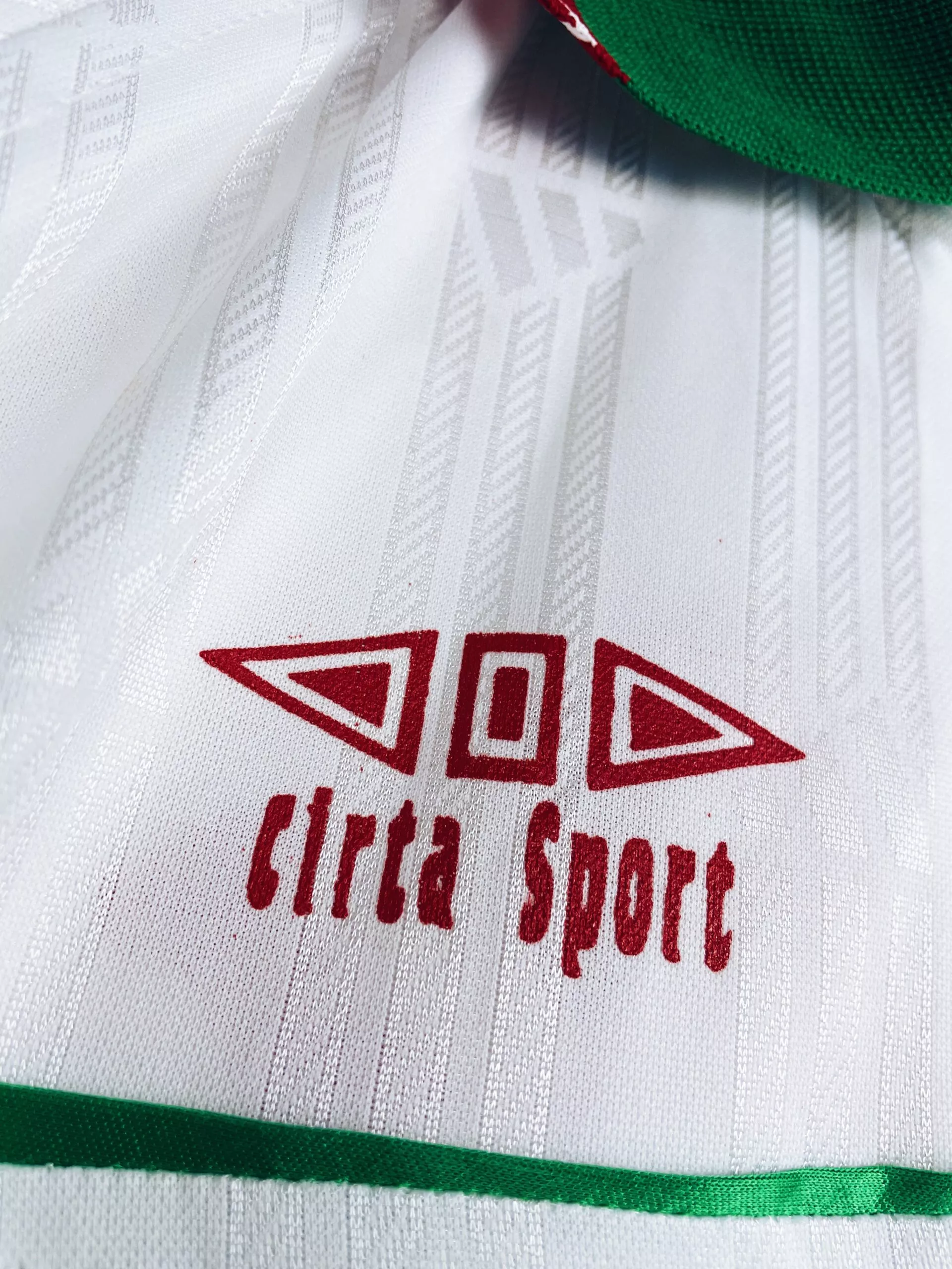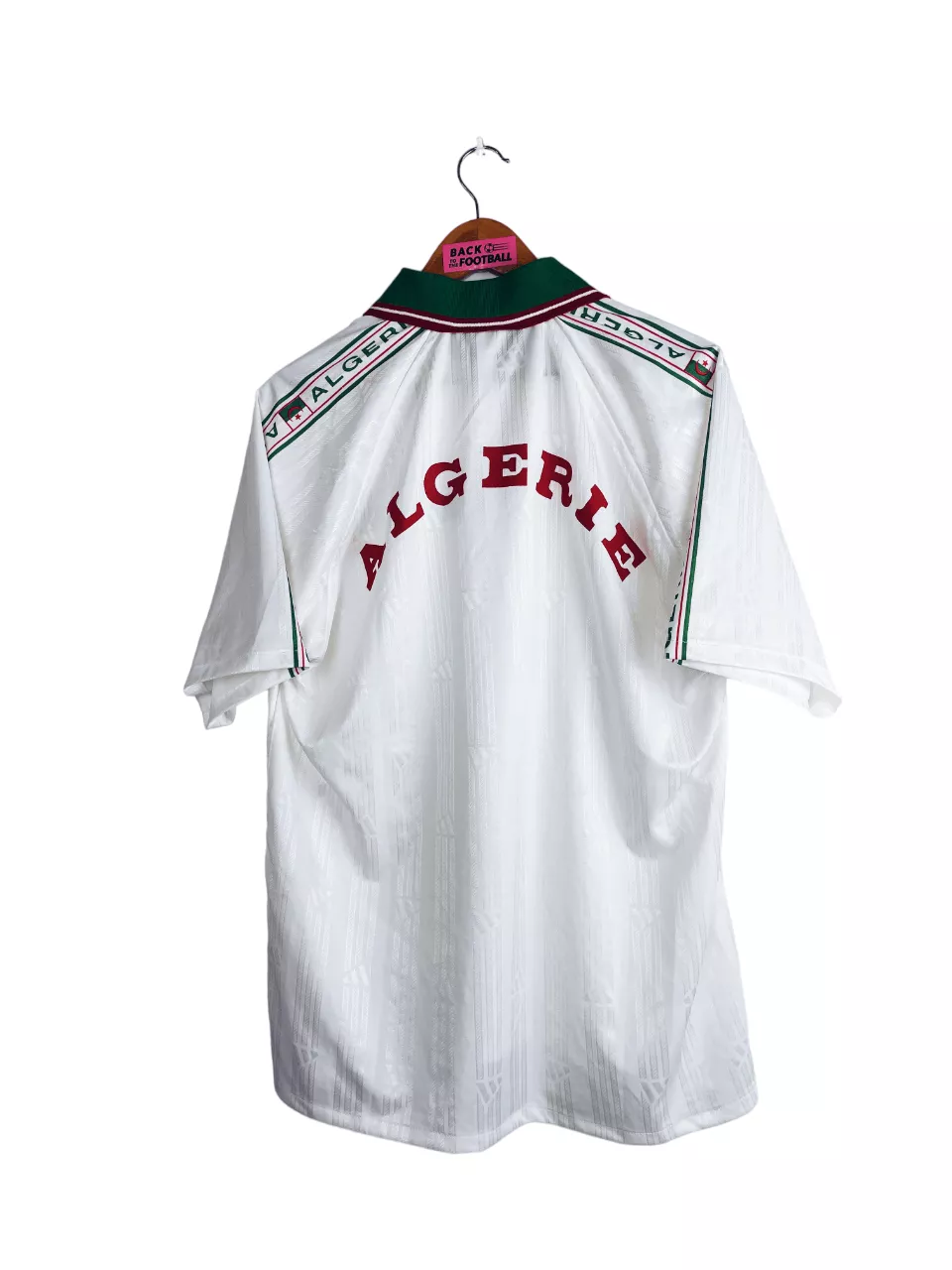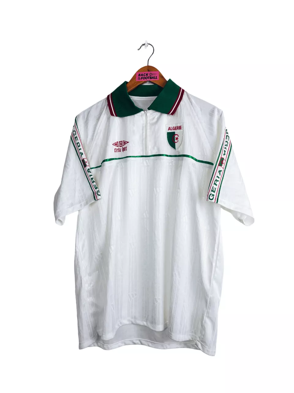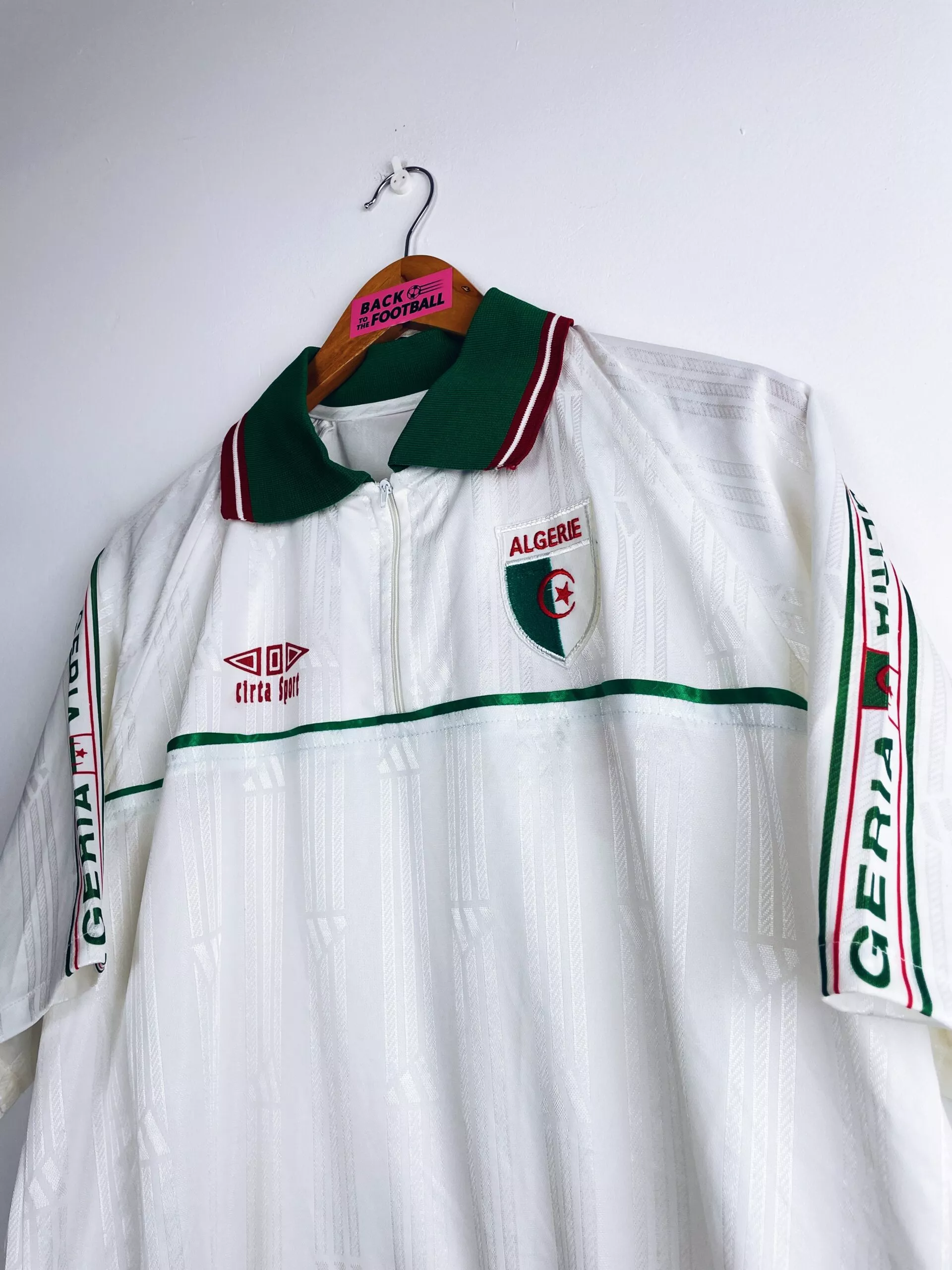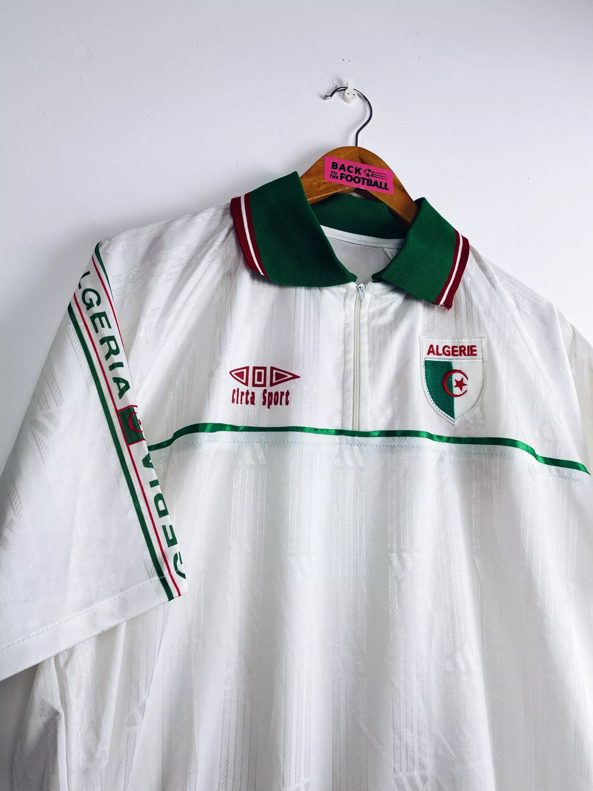 Taille : L Largeur : 54cm (aisselle à aisselle) Longueur : 68cm (base du col au bas) Etat : 8/10, très bon état général Le maillot : maillot vintage d’entrainement de l’Algérie 1998/2000. On n’est pas sûr de l’année, si t’as plus d’infos on est preneur ! L’écusson est brodé, le logo Cirta Sport est floqué. Très beau maillot rétro de l’Algérie ! Histoire : les Fennecs participent à la CAN 1998 mais ce n’est pas une réussite avec une dernière place et 3 défaites. Ils font mieux à la CAN 2000 après leur qualification de justesse. Ils passent la…