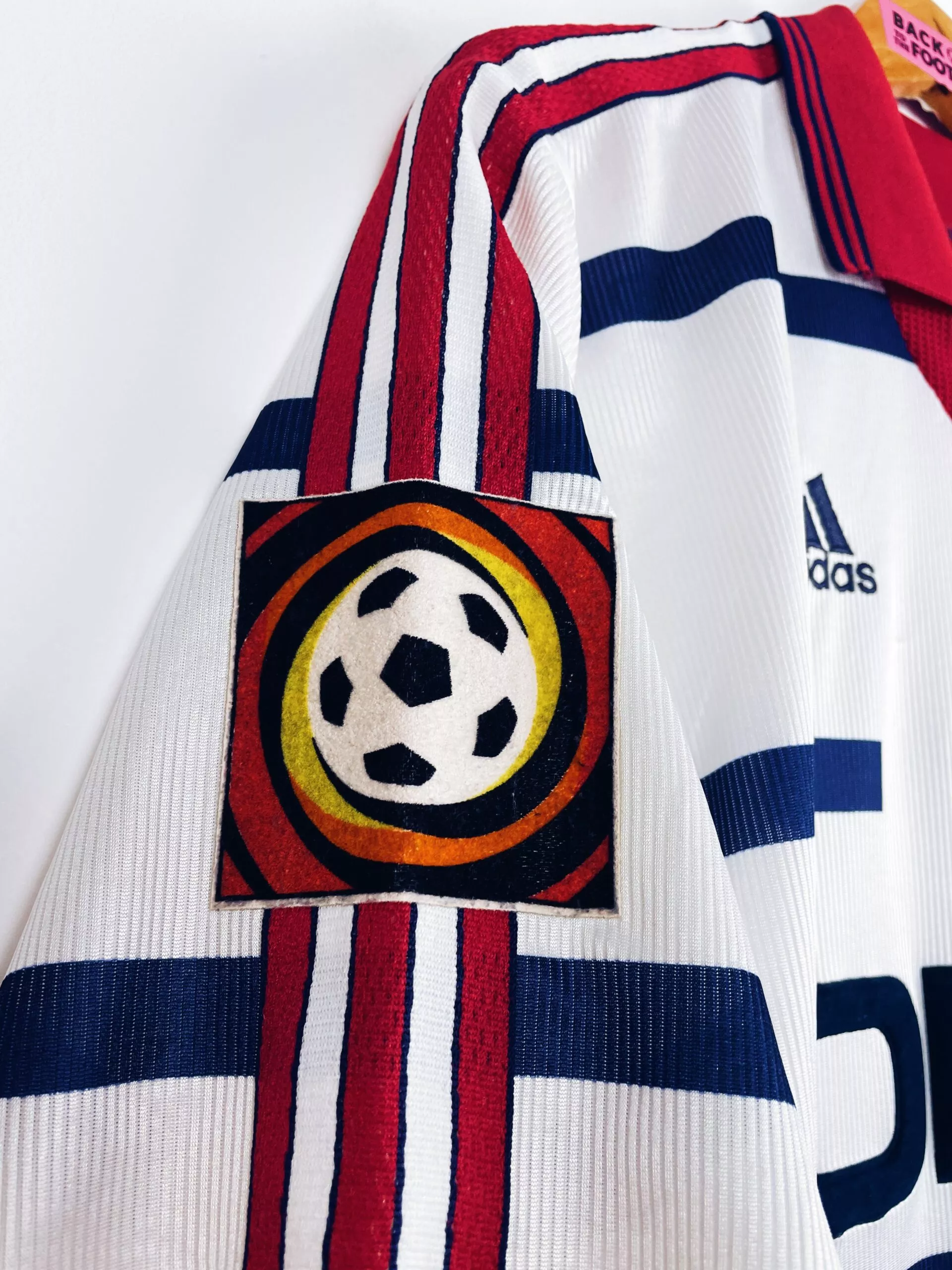 Taille : S mais taille large, plutôt un M Largeur : 50cm (aisselle à aisselle) Longueur : 68cm (base du col au bas) Etat : 8/10, très bon état, quelques bouloches Le maillot : maillot vintage extérieur du Bayern Munich 1998/2000 floqué #14 Basler. L’écusson et le logo Adidas sont brodés, le sponsor Opel est en feutrine. Basler au dos est en feutrine. Très beau maillot rétro du Bayern ! Histoire : deux saisons très prolifiques des bavarois qui gagneront le championnat à deux reprises, ainsi que la coupe de la Ligue Allemande, une coupe d’Allemagne, une finale et une…