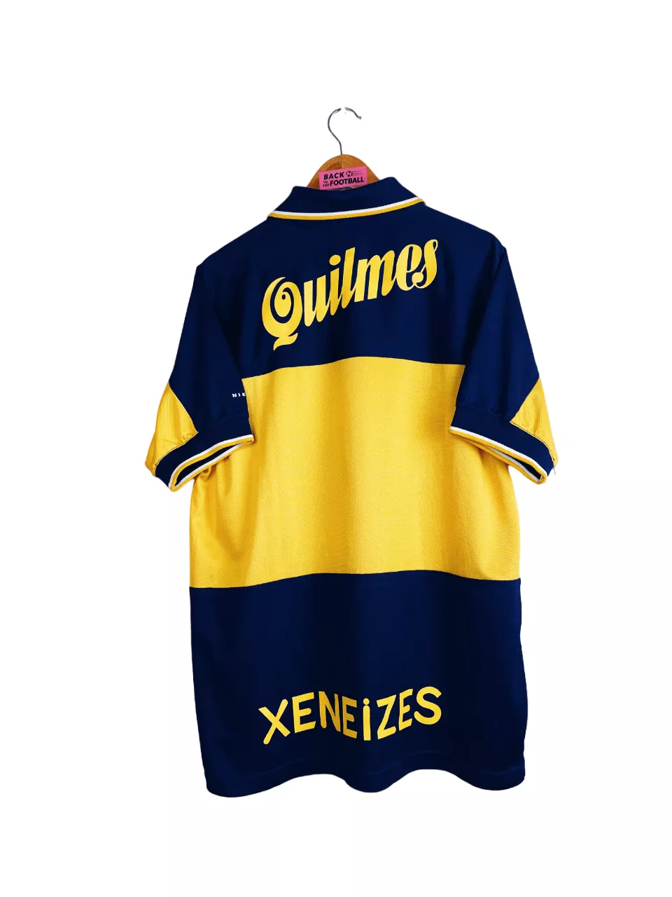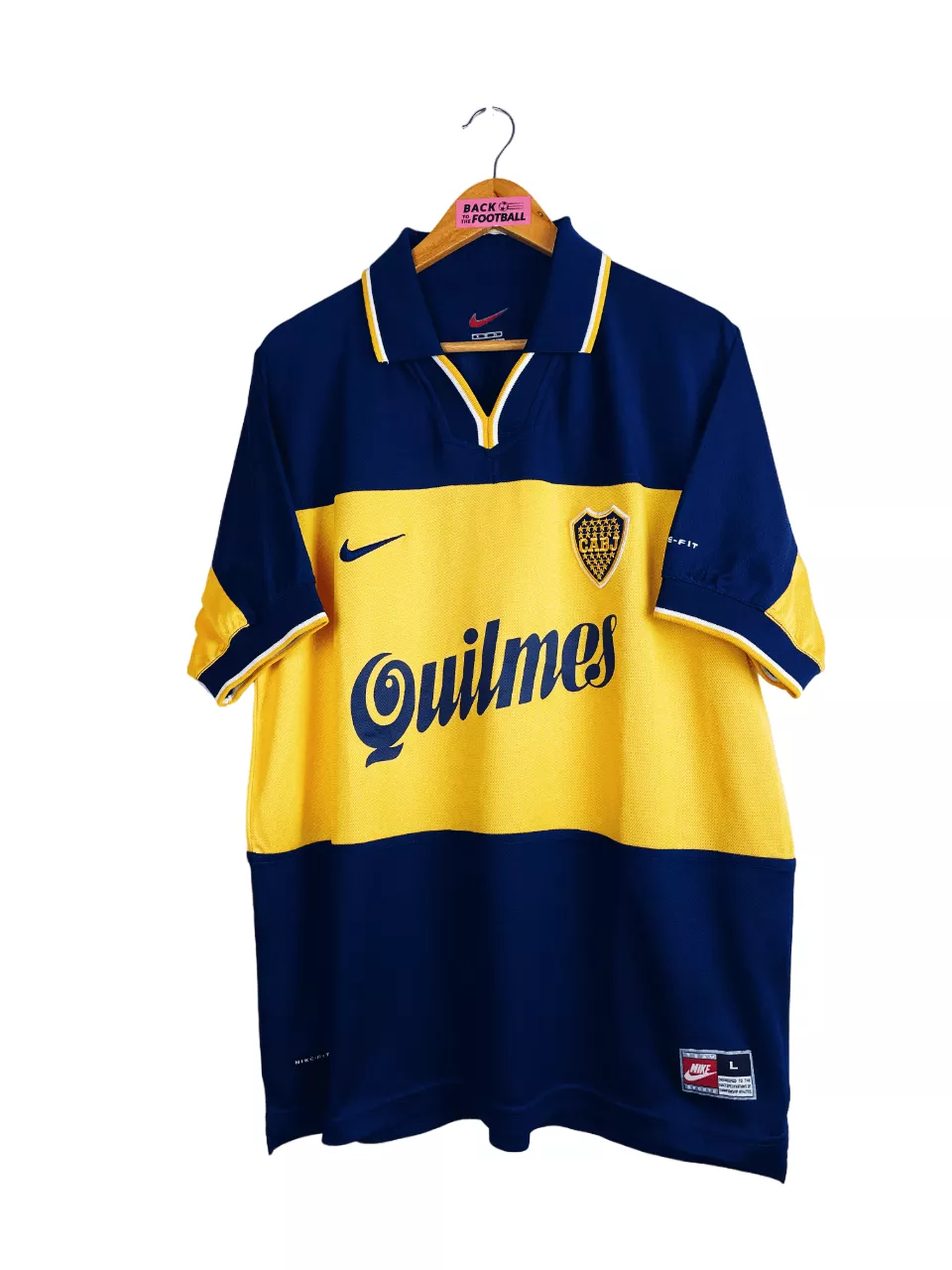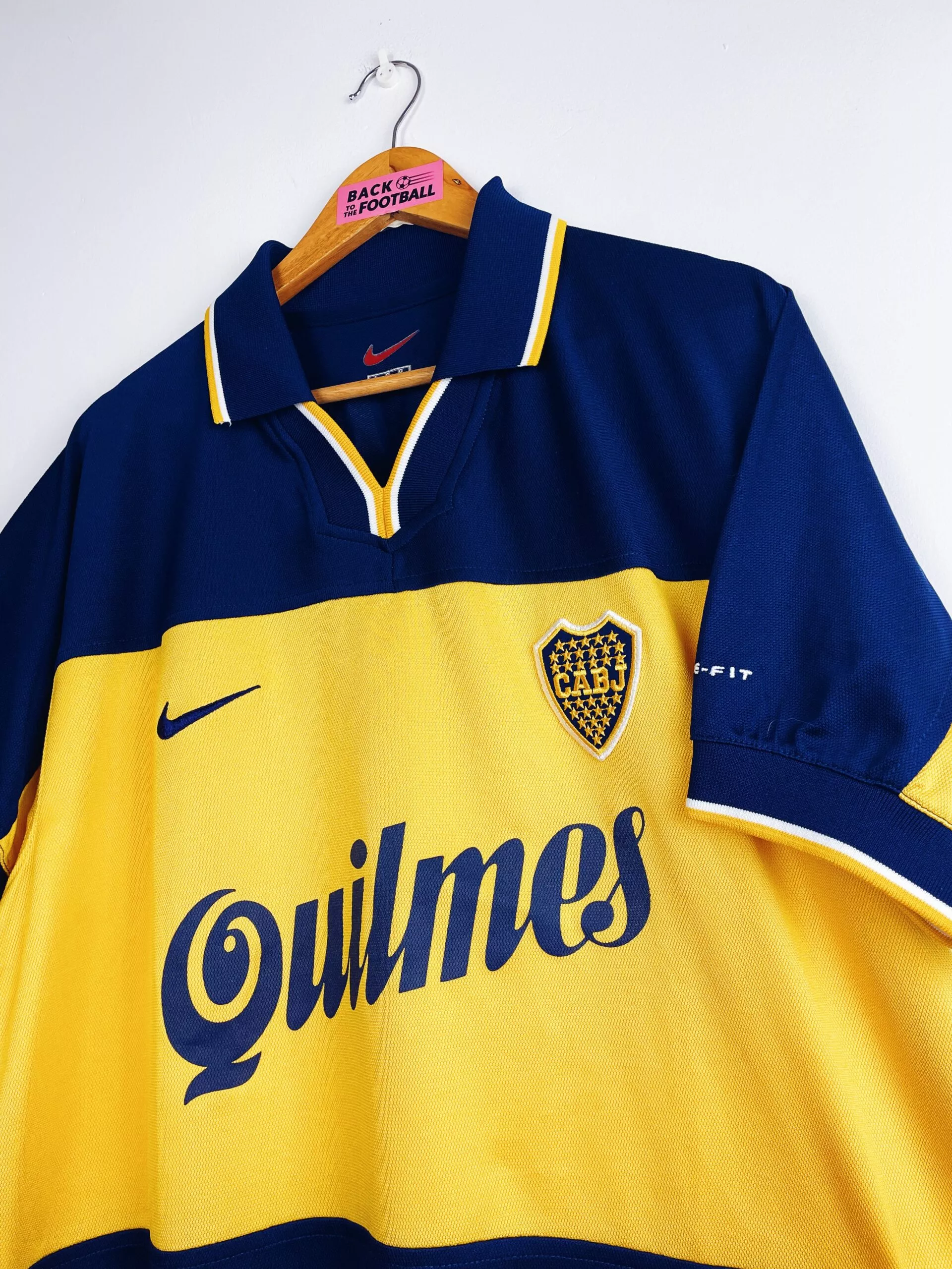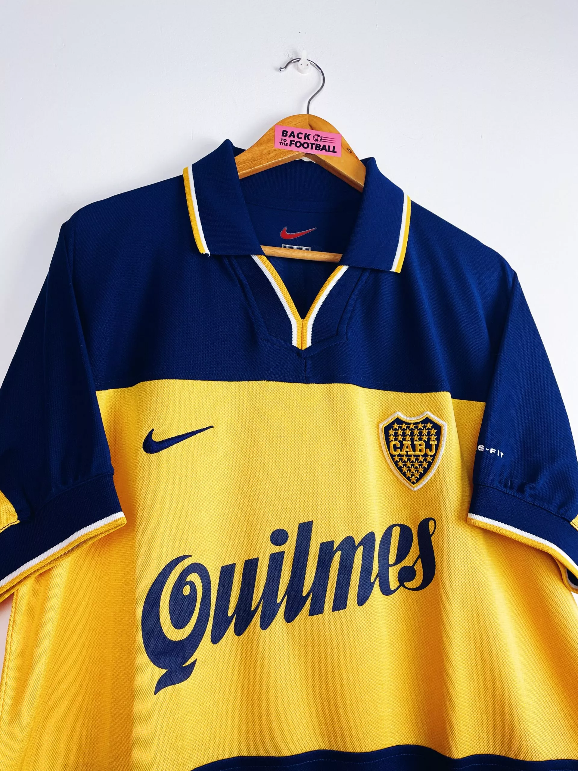 Taille : L Si tu veux plus d’infos, tu peux nous contacter par mail ou sur les réseaux 😉 Etat : 8/10, très bon état Le maillot : maillot vintage domicile de Boca Juniors 1998/2000. L’écusson est brodé, le logo Nike aussi. Les sponsors Quilmes sont floqués. Très beau maillot rétro du Boca Juniors ! Histoire : très grosse première saison du Boca avec un titre de champion sur le tournoi d’ouverture et de fermeture, devant le Gimnasia y Esgrima La Plata et River Plate, avec 1 seule défaite sur les 38 matchs. Martin Palermo sera le meilleur buteur avec…