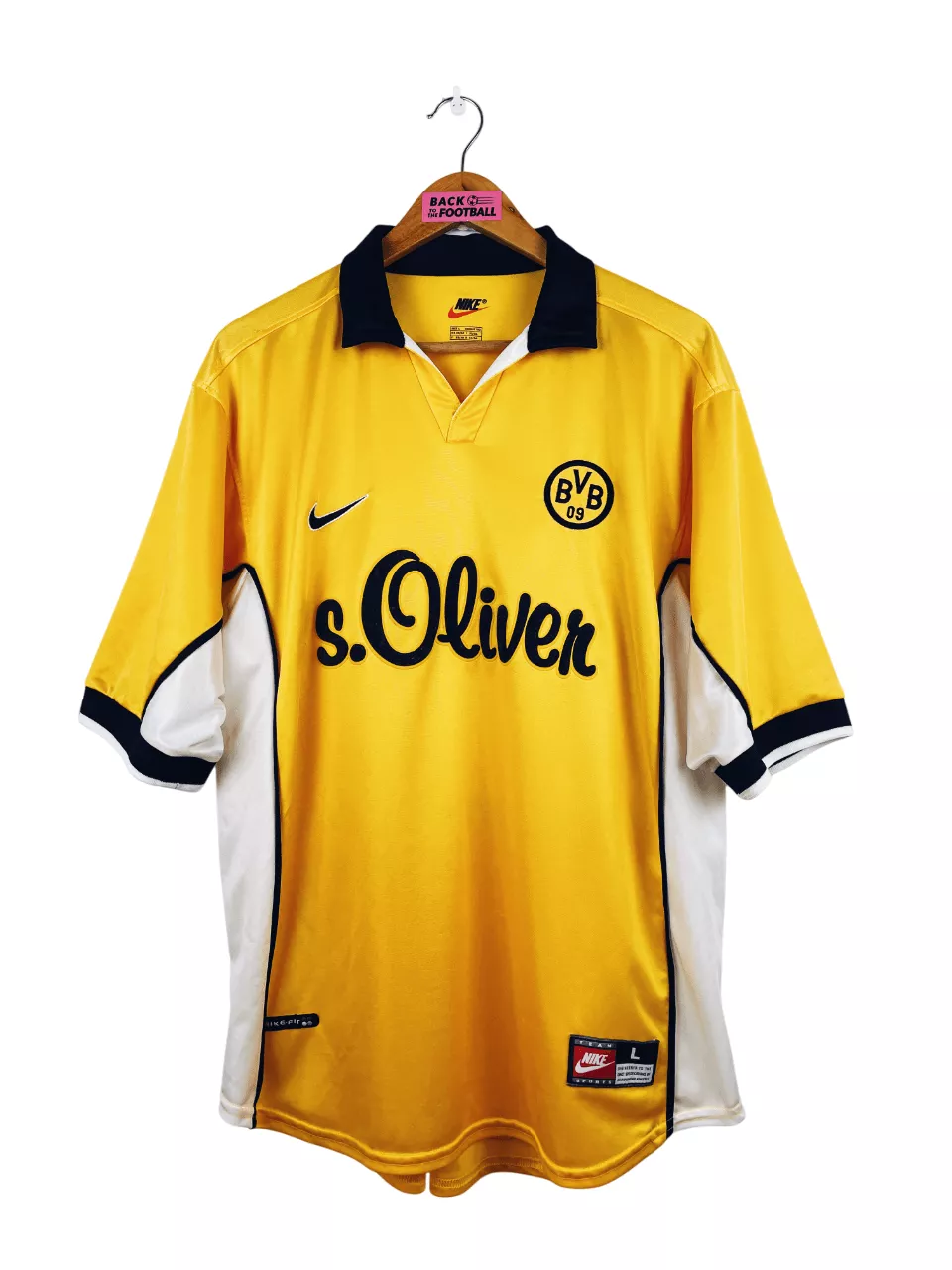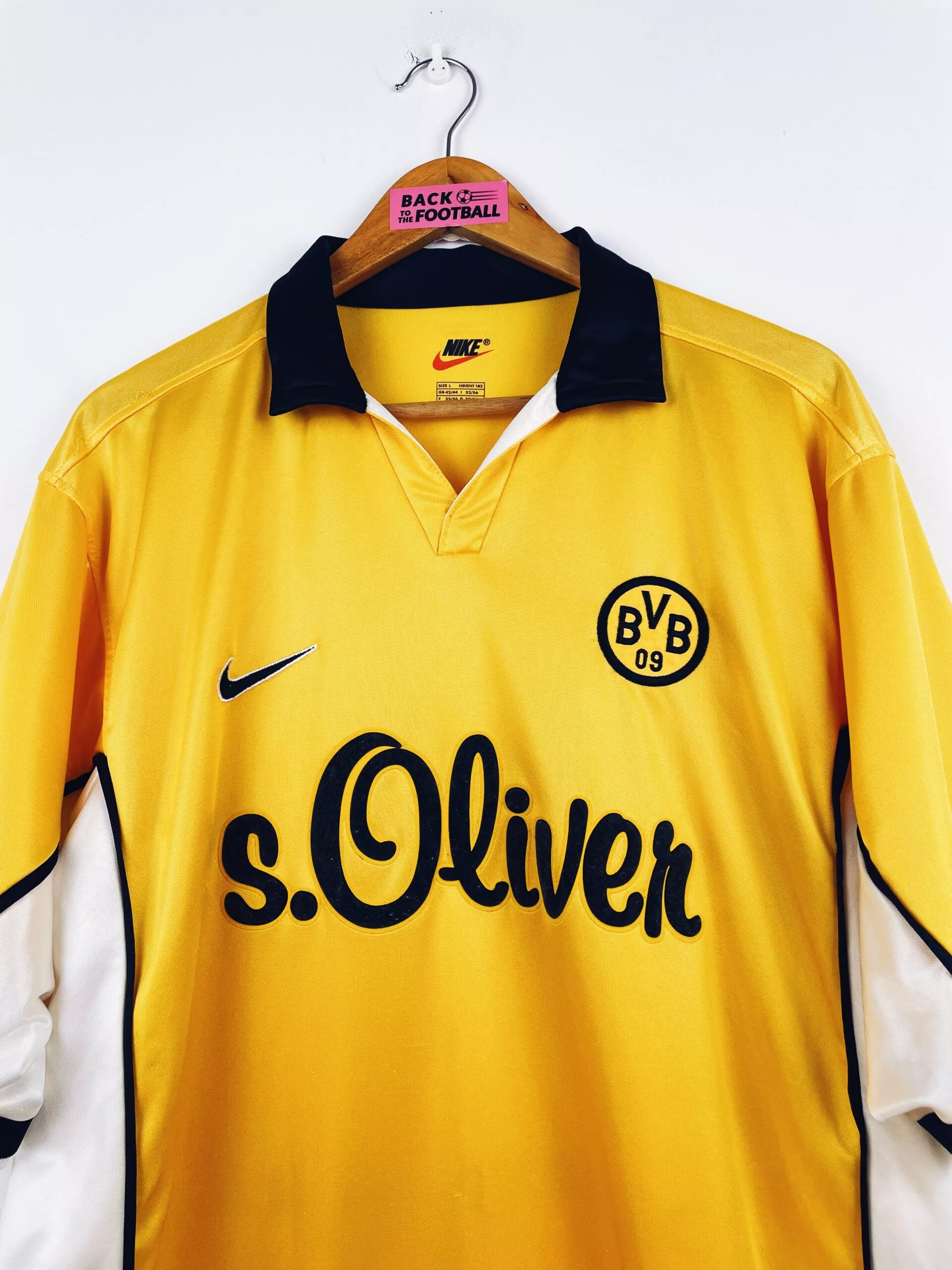 Taille : L Largeur : 55cm (aisselle à aisselle) Longueur : 72cm (base du col au bas) Si tu veux plus d’infos, tu peux nous contacter par mail ou sur les réseaux 😉 Etat : 8.5/10, excellent état, 2/3 minis bouloches, le flocage Dortmund en bas du dos est légèrement craquelé (voir photo) Le maillot : maillot vintage domicile du Borussia Dortmund 1998/2000. L’écusson et le logo Nike sont brodés, le sponsor s. Oliver est en feutrine. Très beau maillot rétro de Dortmund ! Histoire : bonne première saison du BVB avec une 4ème place en Bundesliga. Chapuisat sera le…