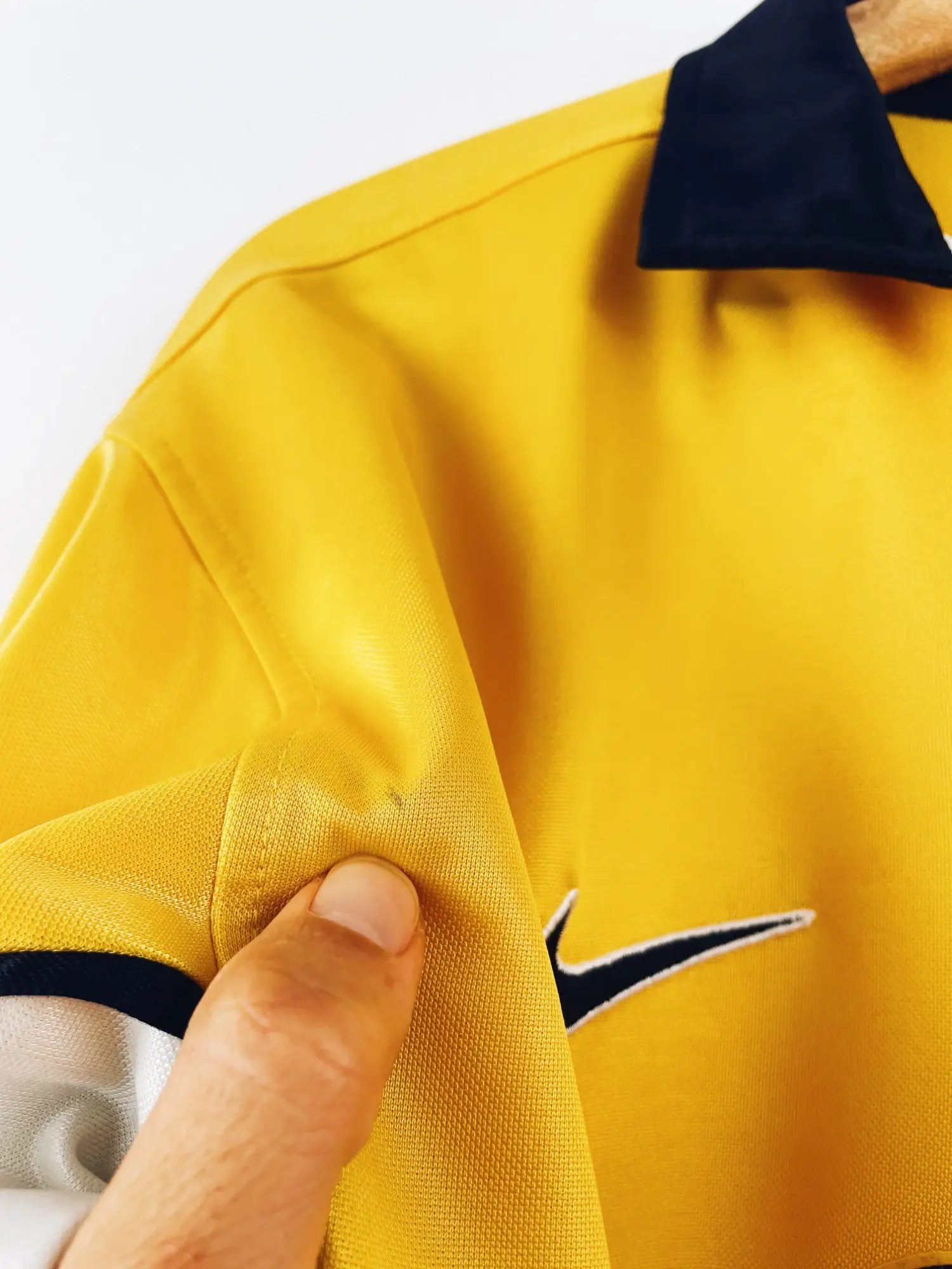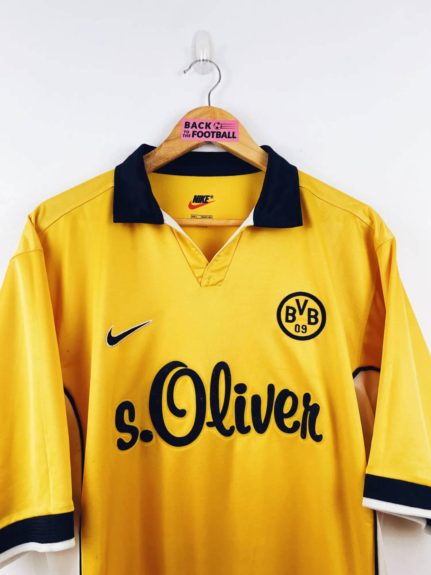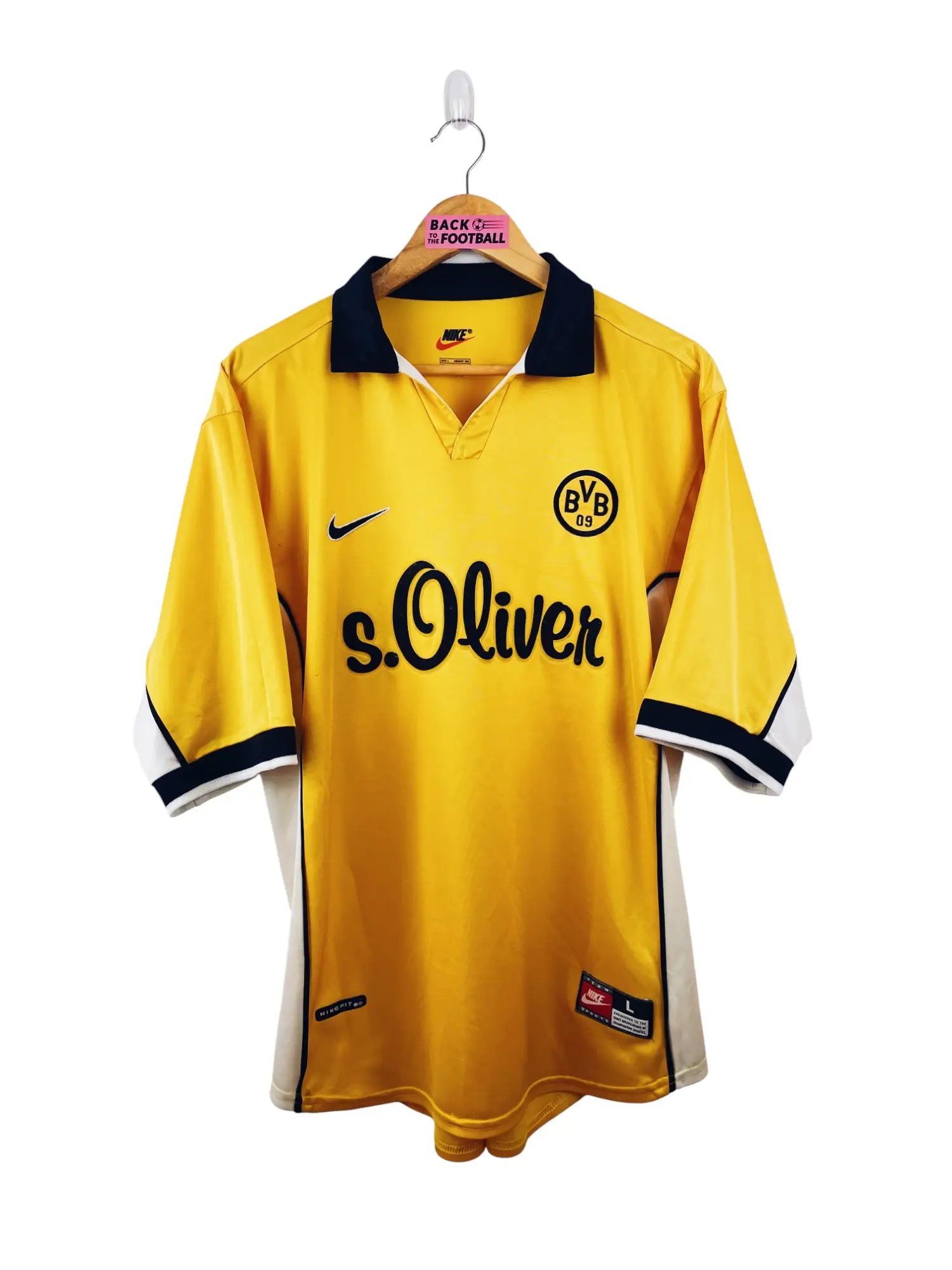 Taille : L Largeur : 56cm (aisselle à aisselle) Longueur : 72cm (base du col au bas) Si tu veux plus d’infos, tu peux nous contacter par mail ou sur les réseaux 😉 Etat : 7/10, très bon état mais quelques minis traces, un accroc en haut du dos (voir photos) Le maillot : maillot vintage domicile du Borussia Dortmund 1998/2000. L’écusson et le logo Nike sont brodés, le sponsor s. Oliver est en feutrine. Très beau maillot rétro de Dortmund ! Histoire : bonne première saison du BVB avec une 4ème place en Bundesliga. Chapuisat sera le meilleur buteur…