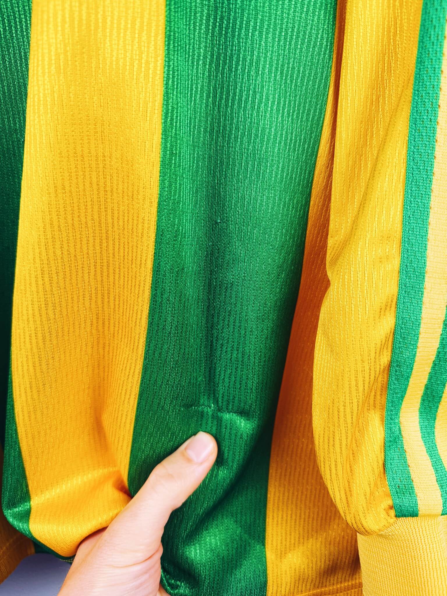 Taille : XL Largeur : 60cm (aisselle à aisselle) Longueur : 77cm (base du col au bas) Si tu veux plus de détails, tu peux nous contacter par mail ou sur les réseaux 😉 Etat : 8/10, très bon état hormis 2 accrocs et une mini trace (voir photos) Le maillot : maillot vintage domicile du FC Nantes 1998/2000 en manches longues. L’écusson et le logo Adidas sont brodés, le sponsor Synergie est floqué. Le tissu est légèrement satiné, c’est splendide. Très beau maillot rétro de Nantes ! Histoire : belle 1ère saison des Canaris qui terminent 7èmes de D1…