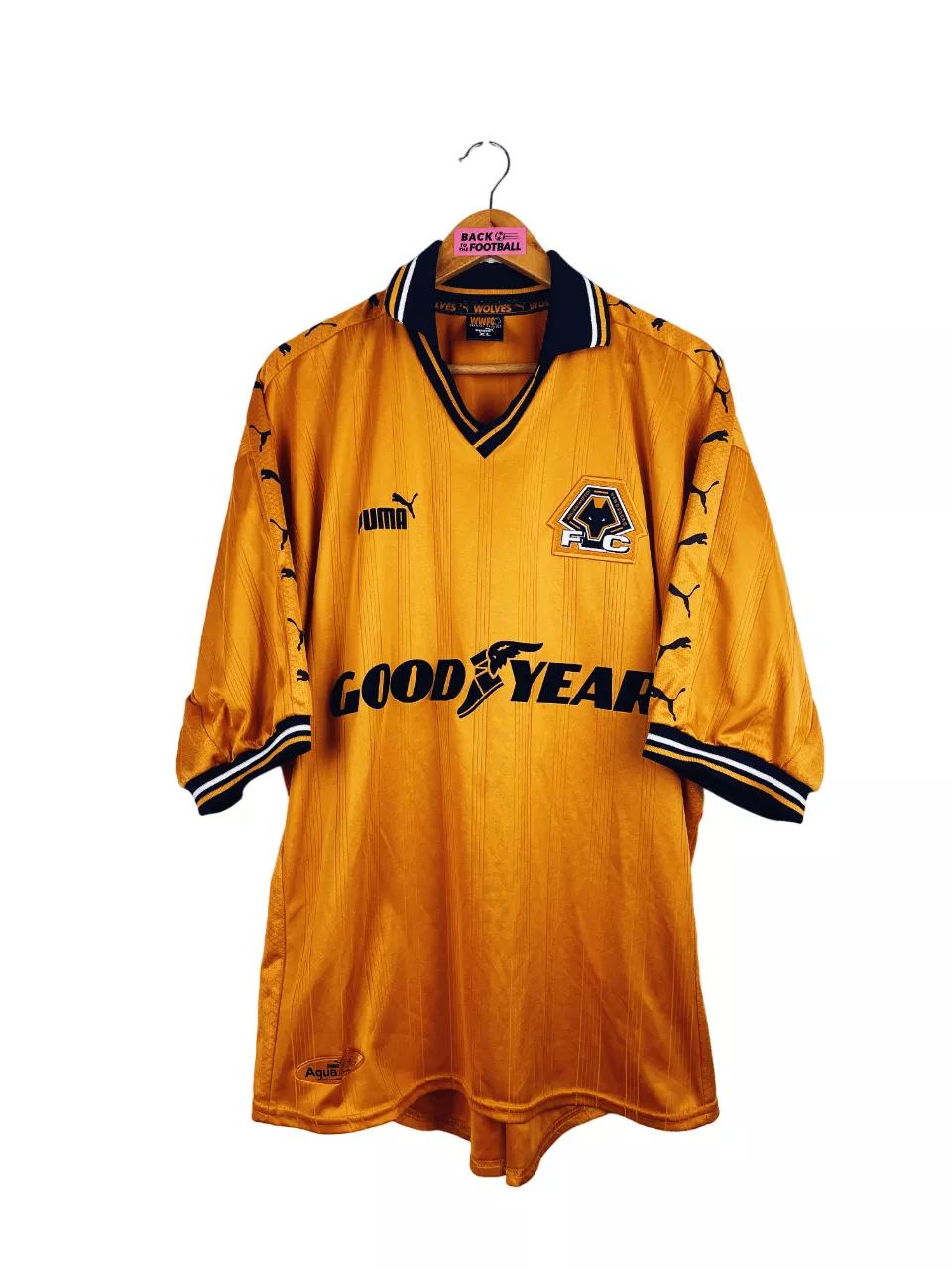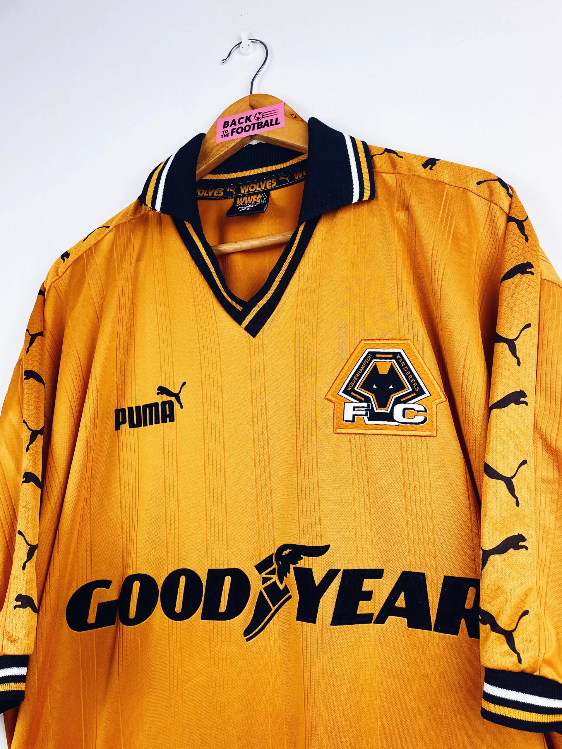 Taille : XL Si tu veux plus de détails, tu peux nous contacter par mail ou sur les réseaux 😉 Etat : 8/10, très bon état hormis une micro trace, quasi invisible (voir photo). Le maillot : maillot vintage domicile de Wolverhampton 1998/2000. L’écusson est brodé, le logo Puma et le sponsor Goodyear sont en feutrine. Les manches Puma sont incroyables. Très beau maillot rétro de Wolverhampton ! Histoire : la première saison, les Wolves terminent à la 7ème place de deuxième division anglaise. Ils seront éliminés au 4ème tour de FA Cup face à Arsenal. La deuxième saison est…