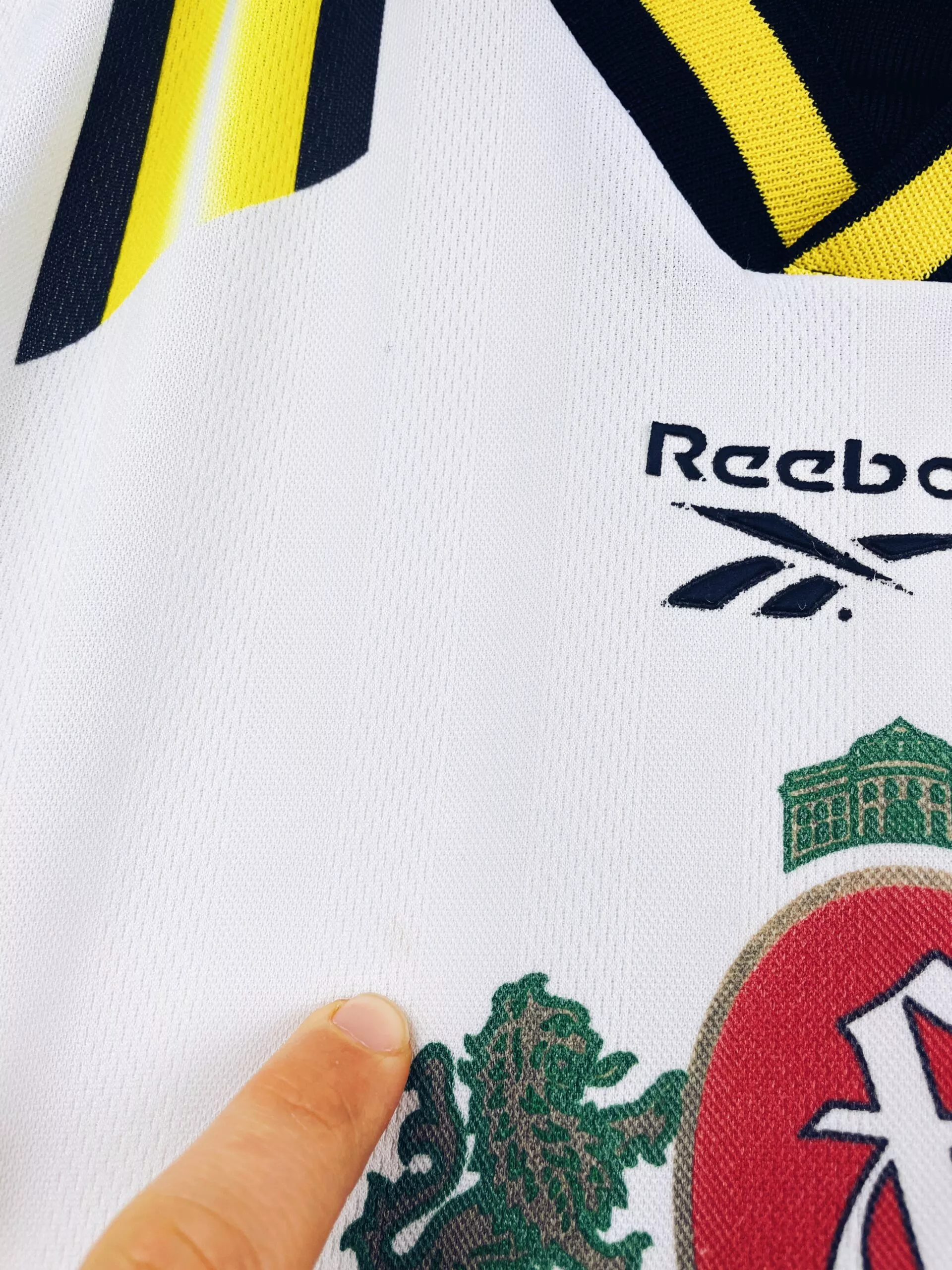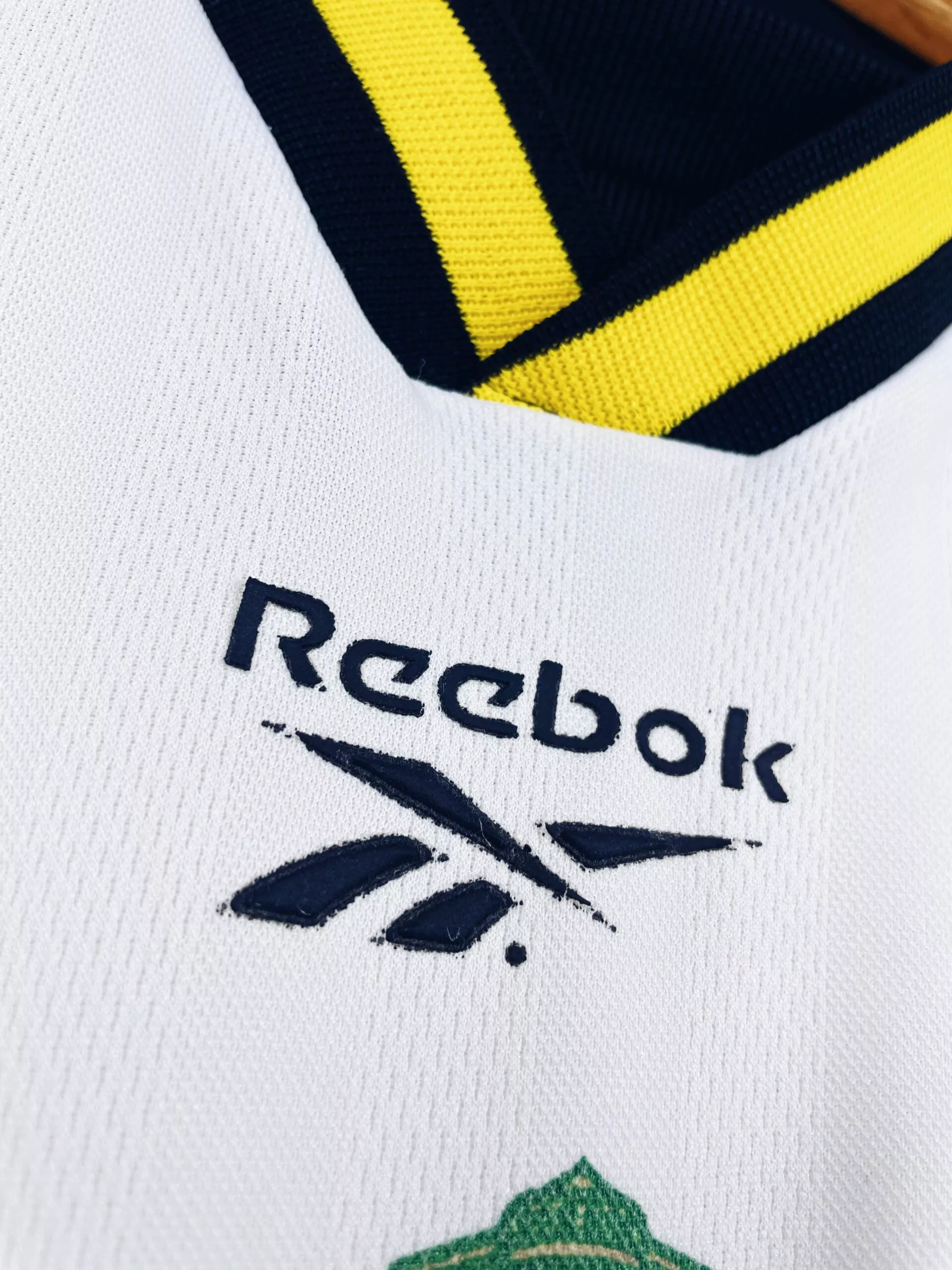 Taille : L Largeur : 55cm (aisselle à aisselle) Largeur : 74cm (base du col au bas) Si tu veux plus d’infos, tu peux nous contacter par mail ou sur les réseaux 😉 Etat : 8/10, très bon état, le logo Reebok est un peu abimé, quelques légères bouloches (voir photos) Le maillot : maillot vintage domicile du Dynamo Dresden 1998/2001. L’écusson est brodé, le logo Reebok en feutrine et le sponsor incrusté. Très beau maillot rétro de Dresden ! Histoire : après plusieurs années en Bundesliga, le club allemand végète en 3ème division allemande.