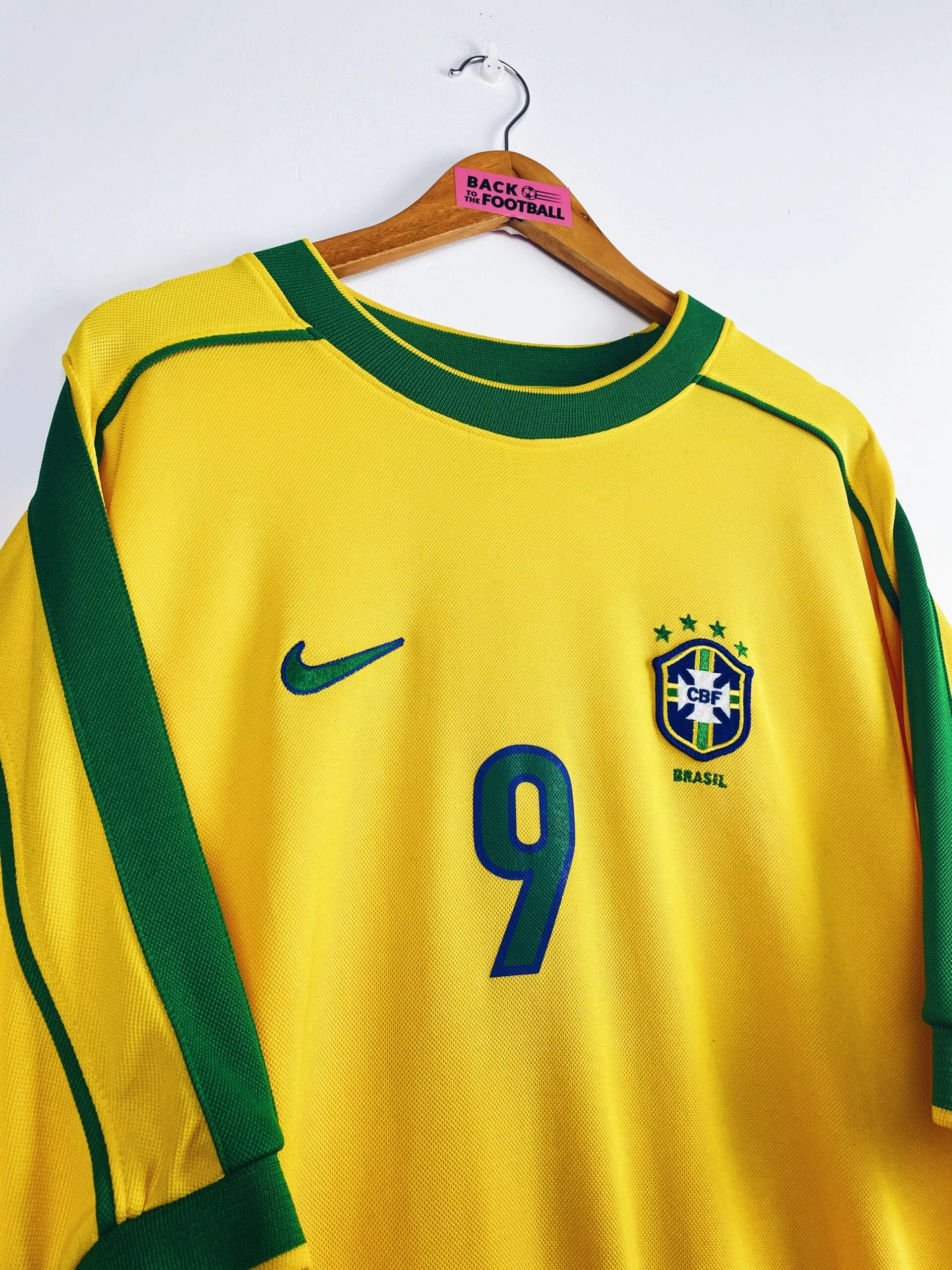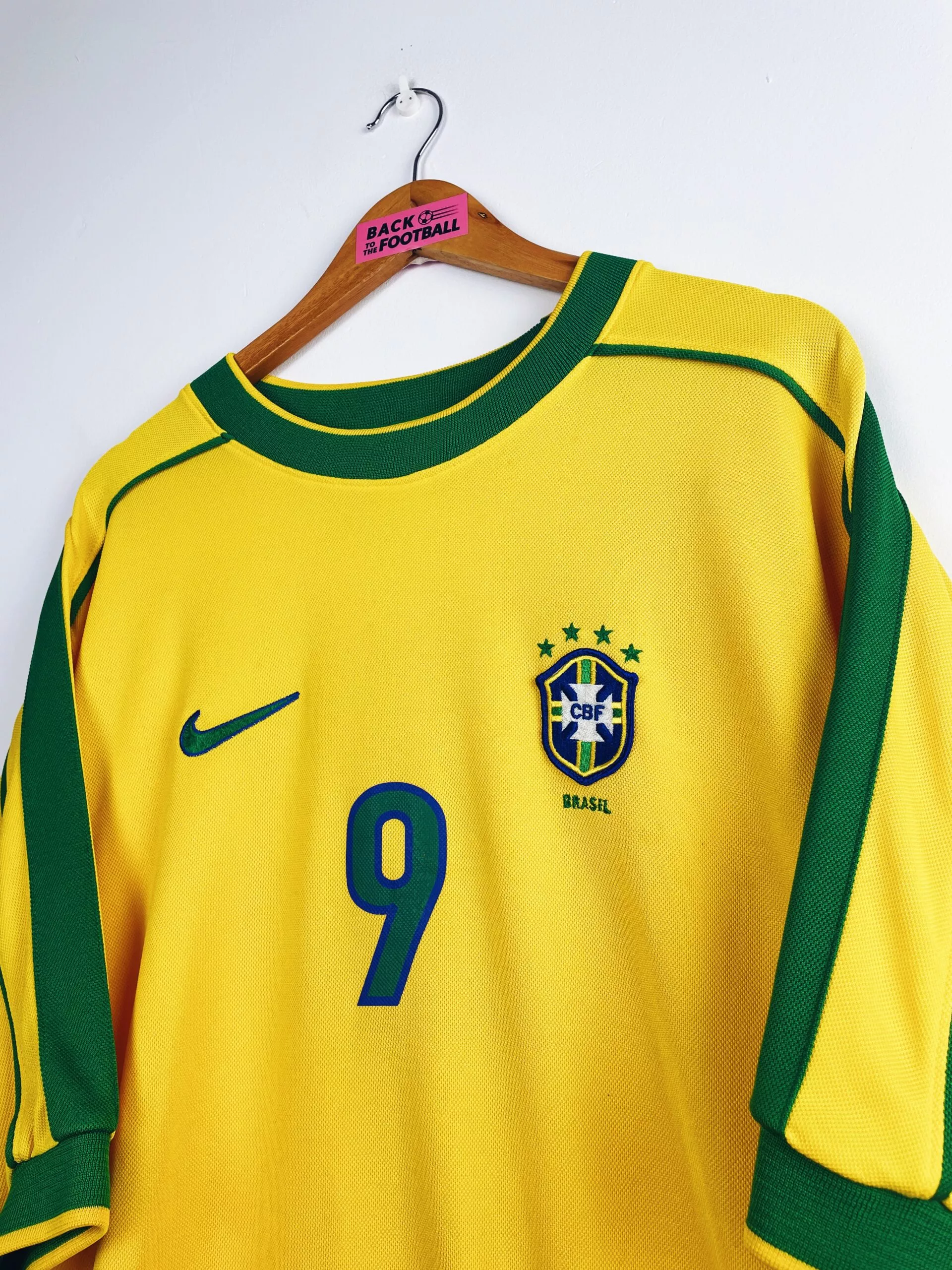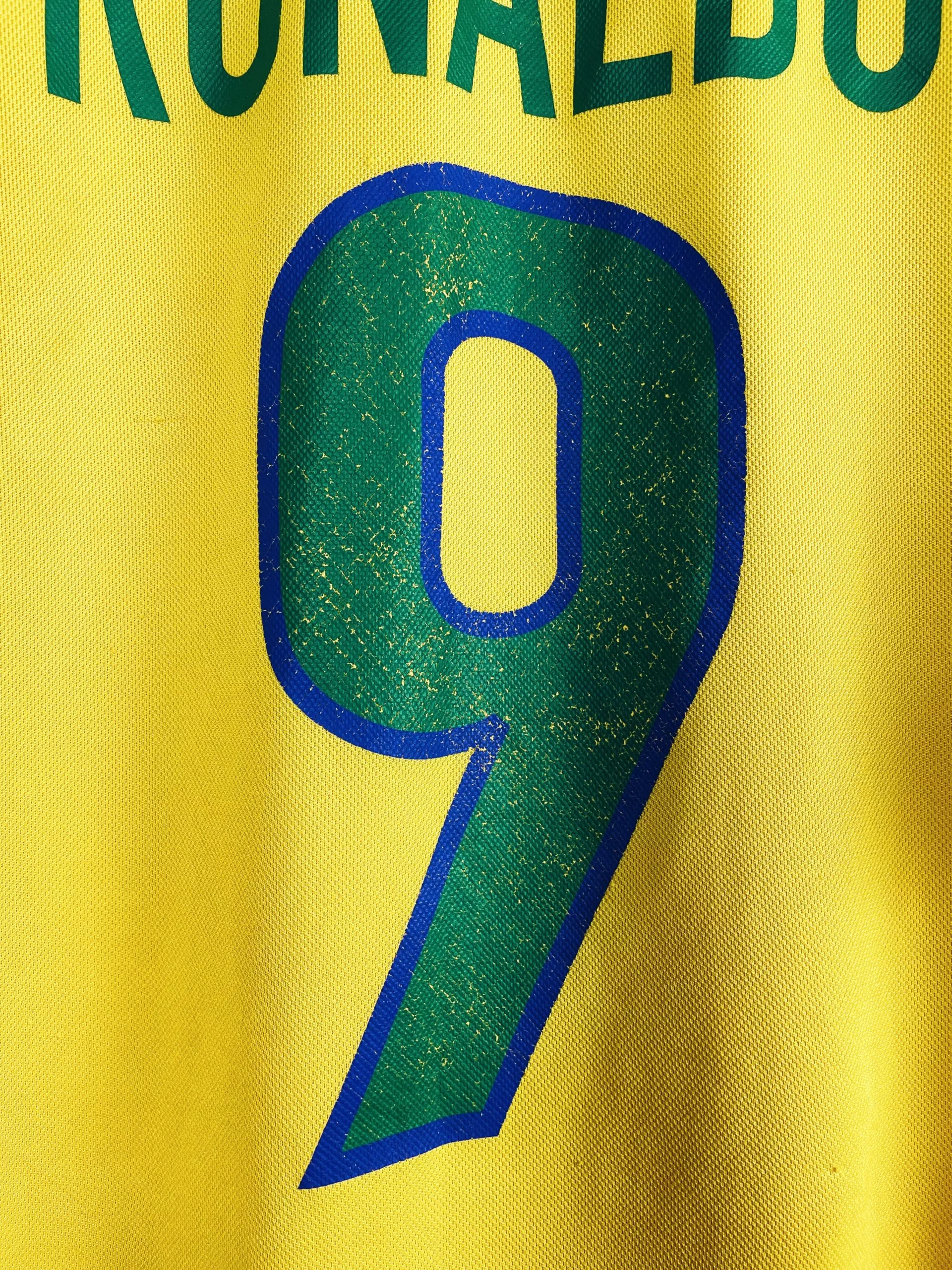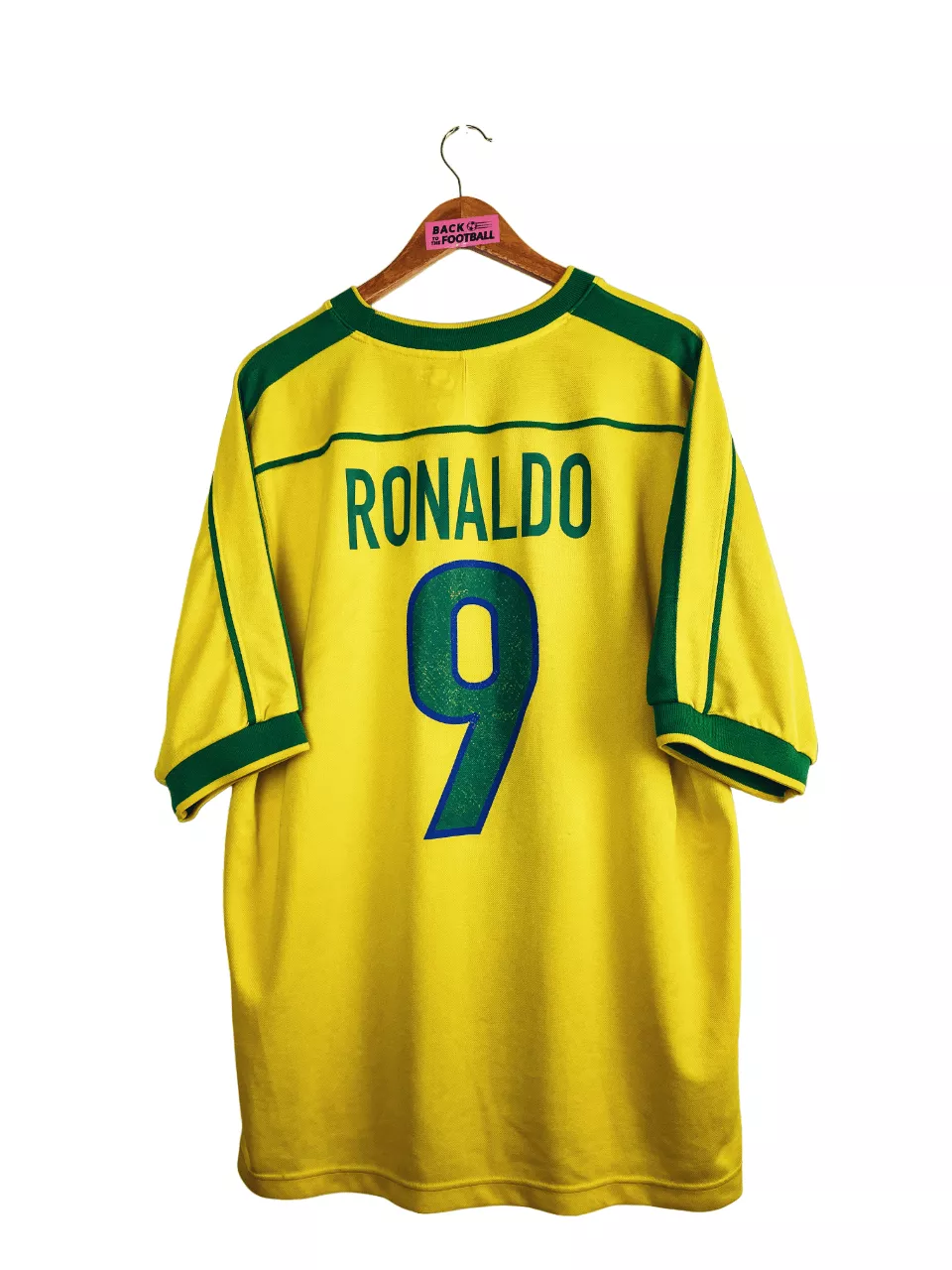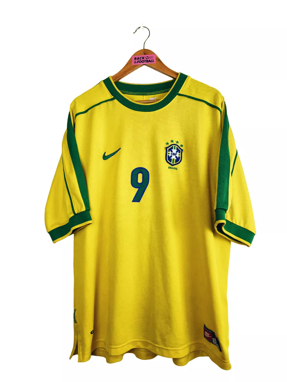 Taille : XL Si tu veux plus d’infos, tu peux nous contacter par mail ou sur les réseaux 😉 Etat : 7/10, très bon état, mais le flocage est abimé (voir photos) Le maillot : maillot iconique du Brésil pour la Coupe du Monde 1998, floqué d’un certain numéro 9 Ronaldo. L’écusson avec les 4 étoiles est brodé, comme le logo Nike. Le numéro 9 est floqué à l’avant et au dos. Quel maillot rétro du Brésil ! Histoire : on connait bien l’histoire, avec la finale perdue 3-0 face aux français. Pourtant la Seleçao avait une sacré équipe :…