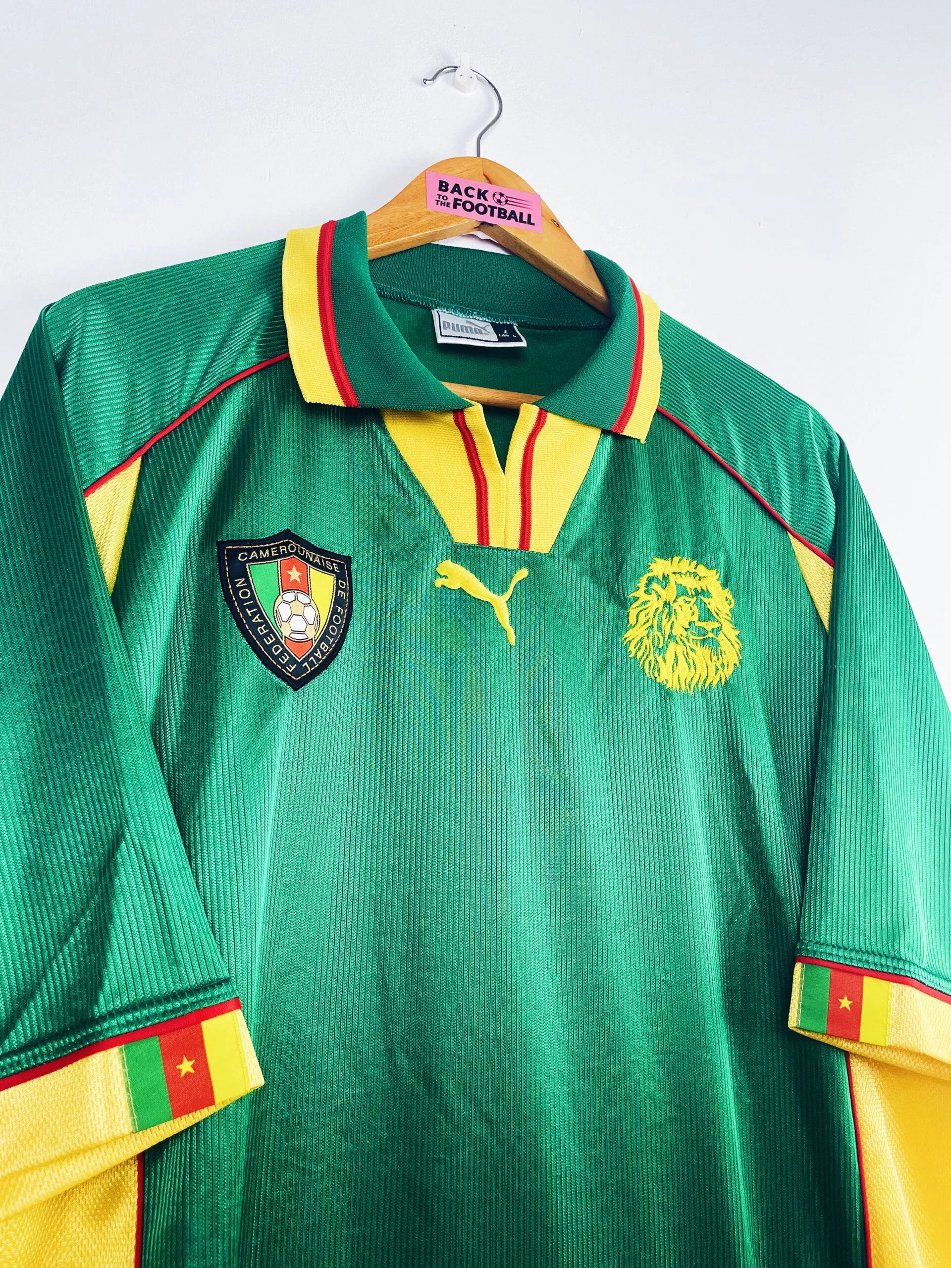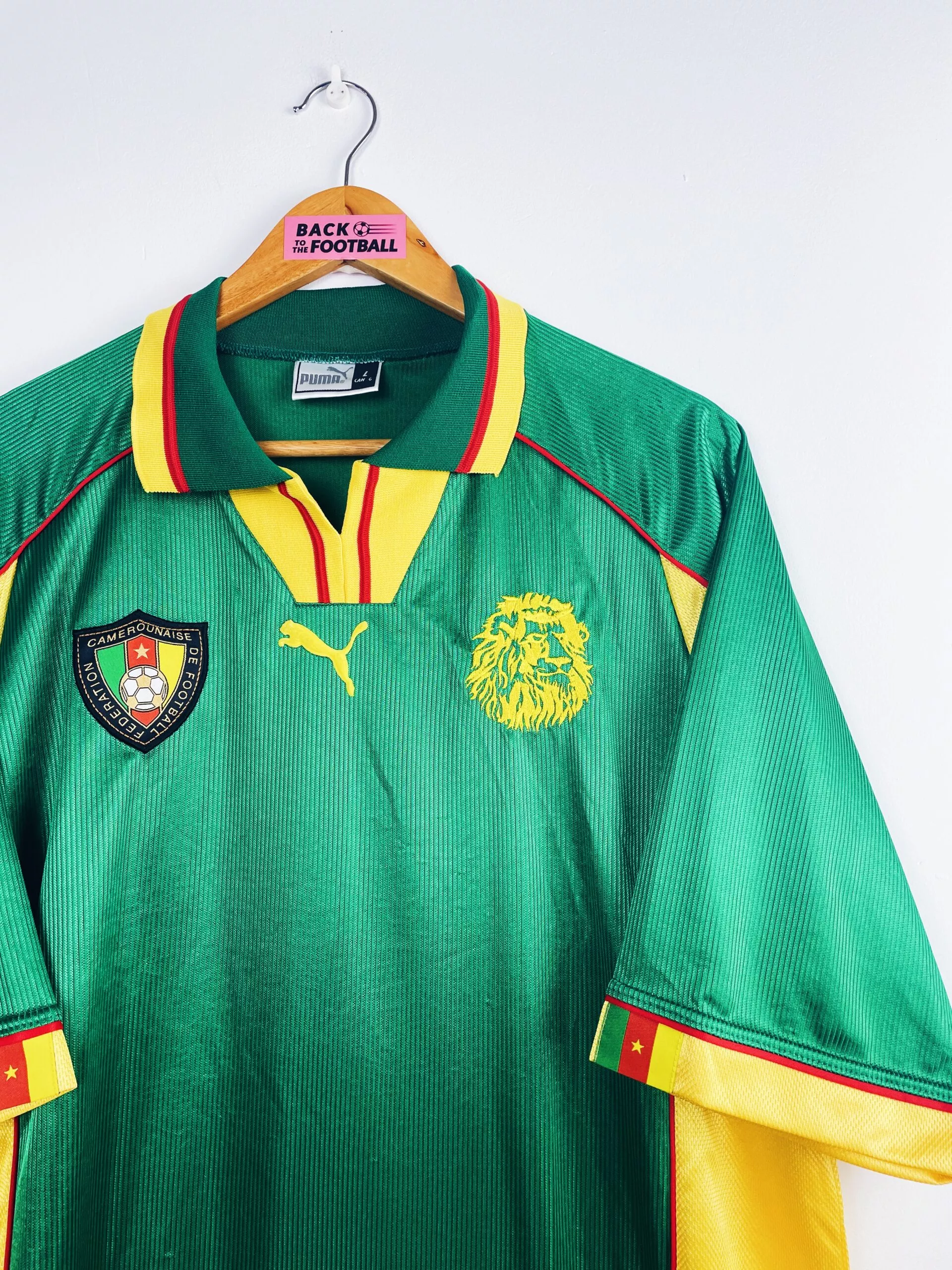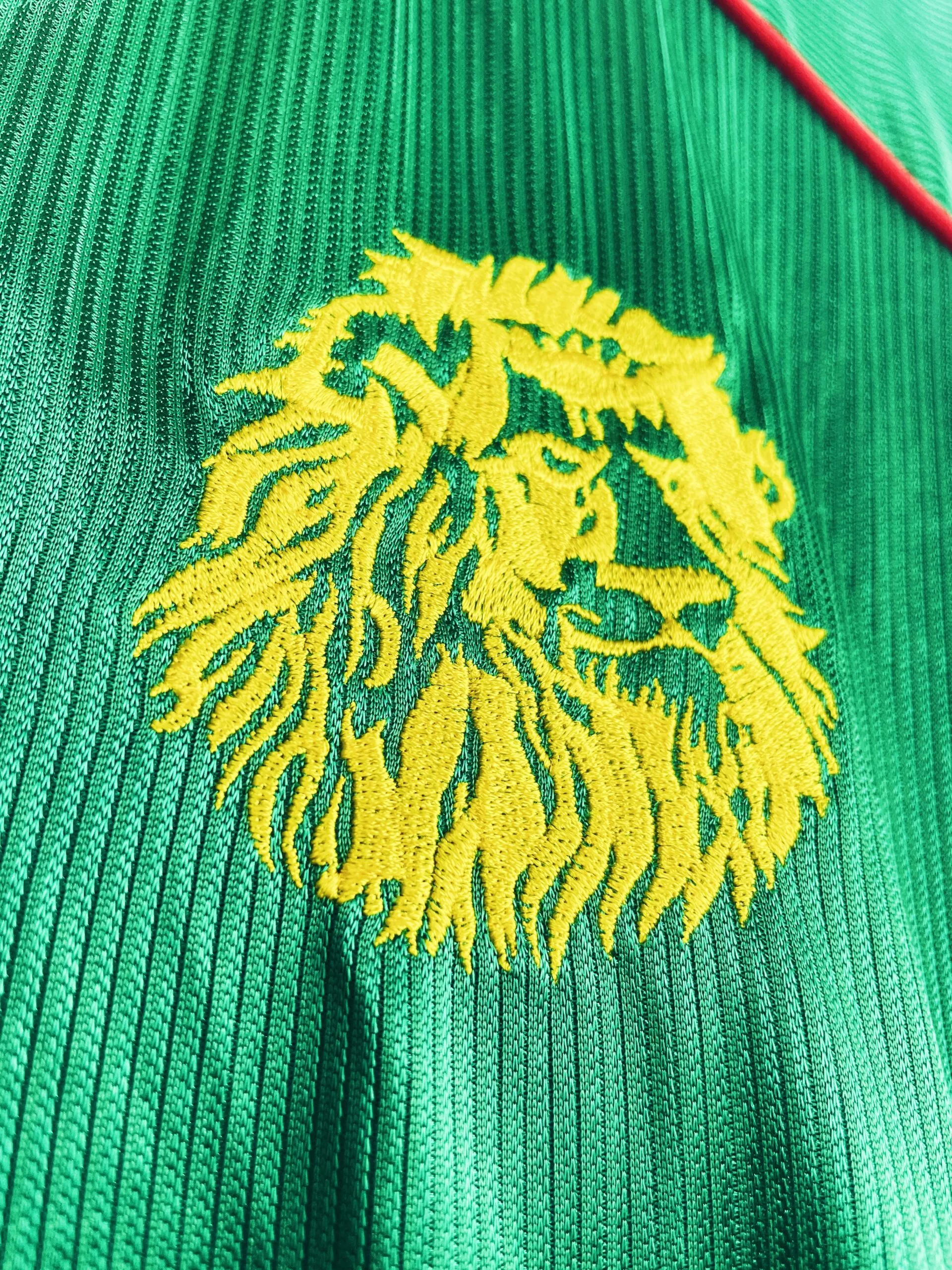 Taille : L Etat : 8/10, très bon état hormis quelques légers accros dans le dos (voir photo) Le maillot : maillot vintage domicile du Cameroun 1998 utilisé pour la Coupe du Monde. Les écussons sont brodés, le logo Puma est en feutrine. Le maillot est satiné. Très beau maillot rétro du Cameroun ! Histoire : le Cameroun se qualifie pour la Coupe du Monde 98 en terminant à la première place de son groupe, devant l’Angola. Les Lions indomptables de Claude Le Roy tombent dans un groupe compliqué. Après 2 matchs nuls contre l’Autriche et le Chili et une…