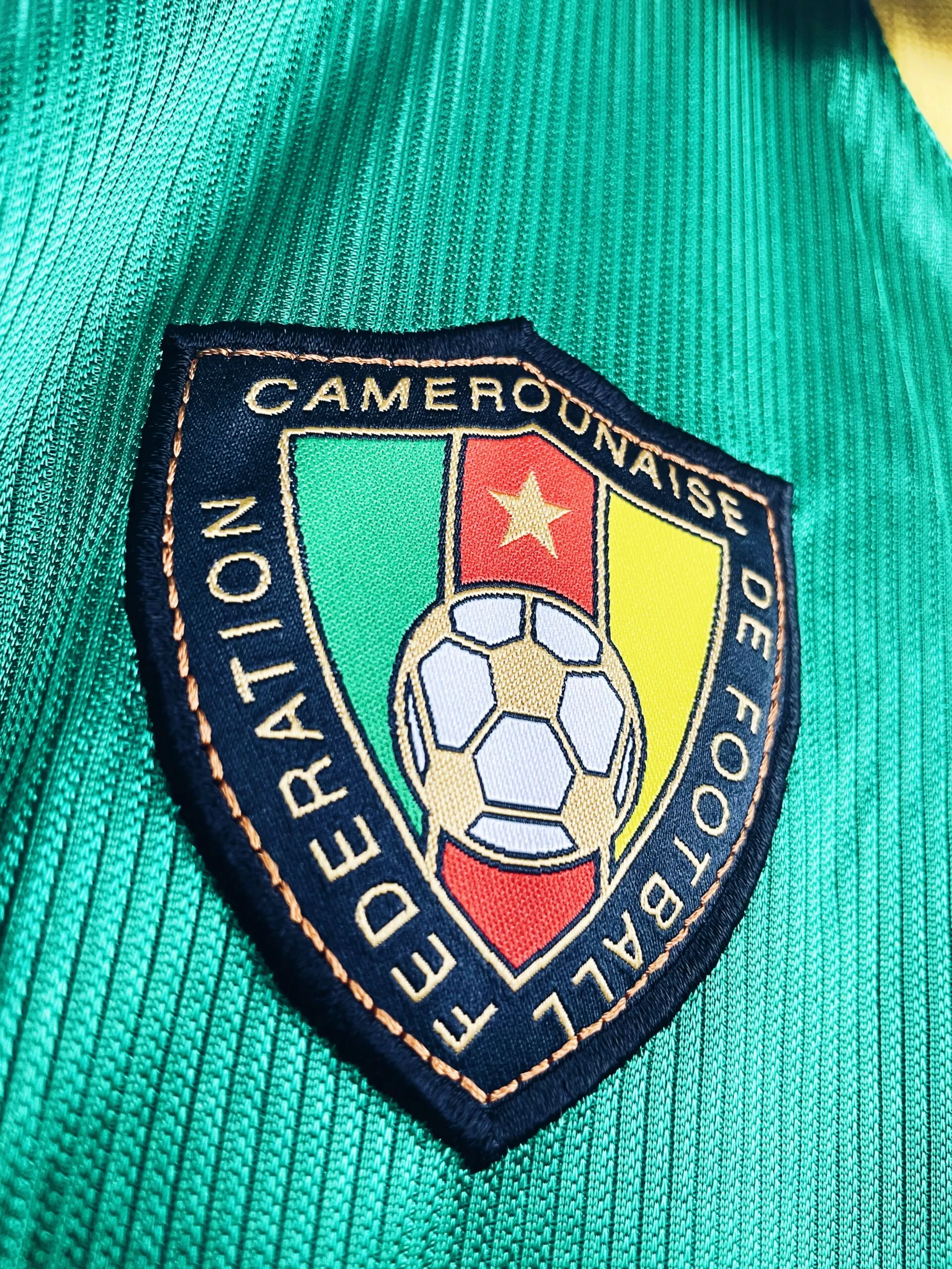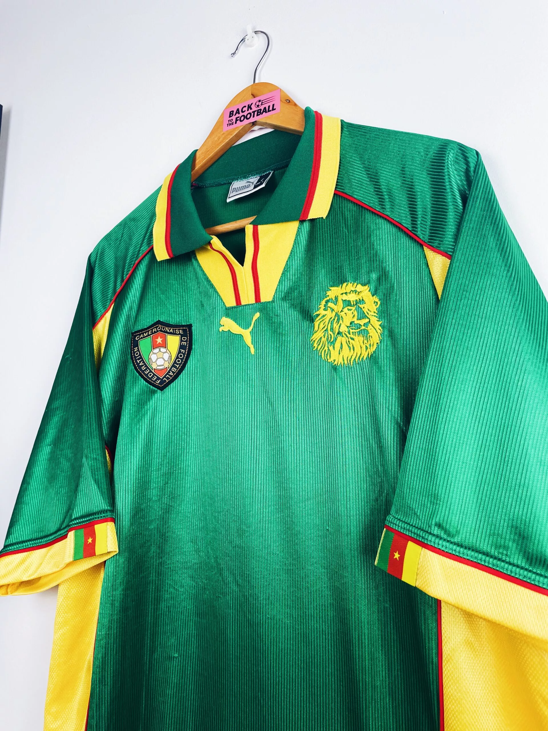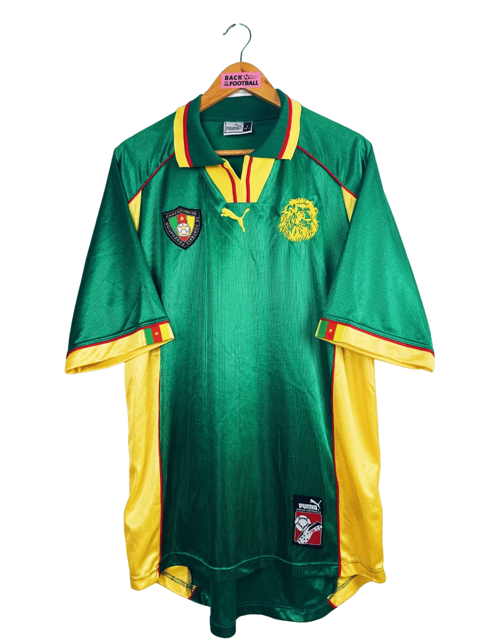 Taille : L Etat : 8/10, très bon état hormis quelques légers accros dans le dos (voir photo) Le maillot : maillot vintage domicile du Cameroun 1998 utilisé pour la Coupe du Monde. Les écussons sont brodés, le logo Puma est en feutrine. Le maillot est satiné. Très beau maillot rétro du Cameroun ! Histoire : le Cameroun se qualifie pour la Coupe du Monde 98 en terminant à la première place de son groupe, devant l’Angola. Les Lions indomptables de Claude Le Roy tombent dans un groupe compliqué. Après 2 matchs nuls contre l’Autriche et le Chili et une…