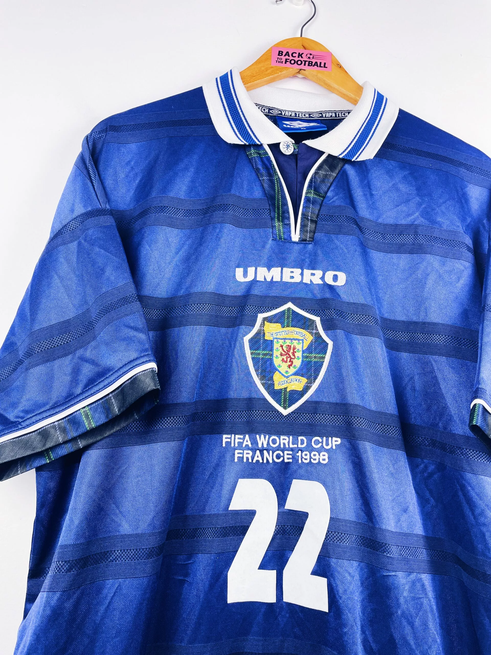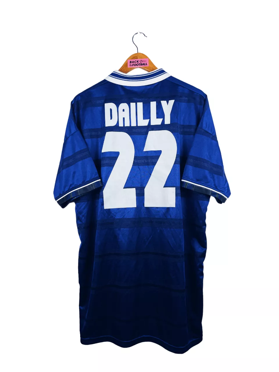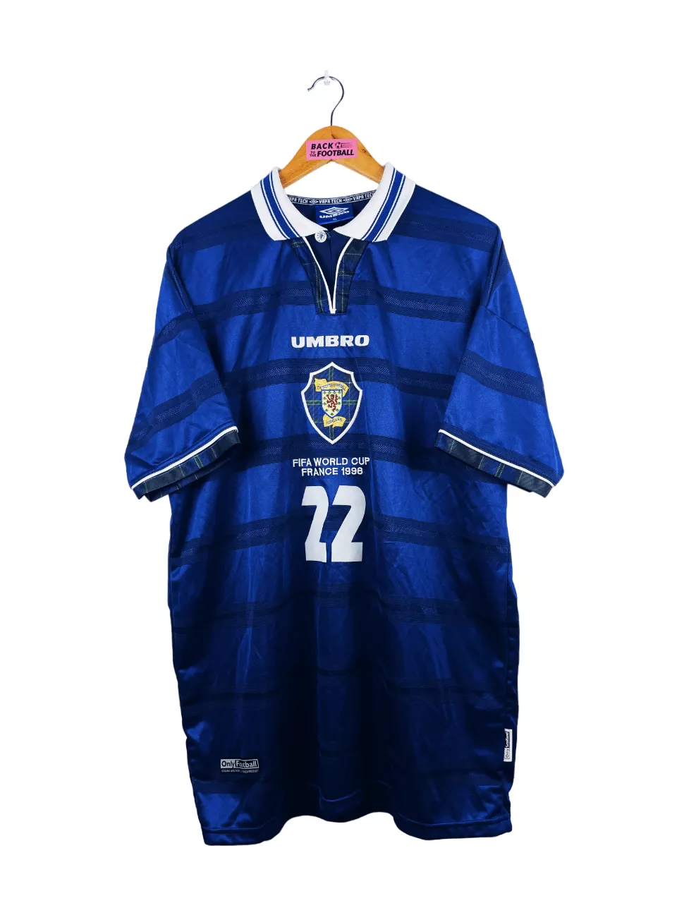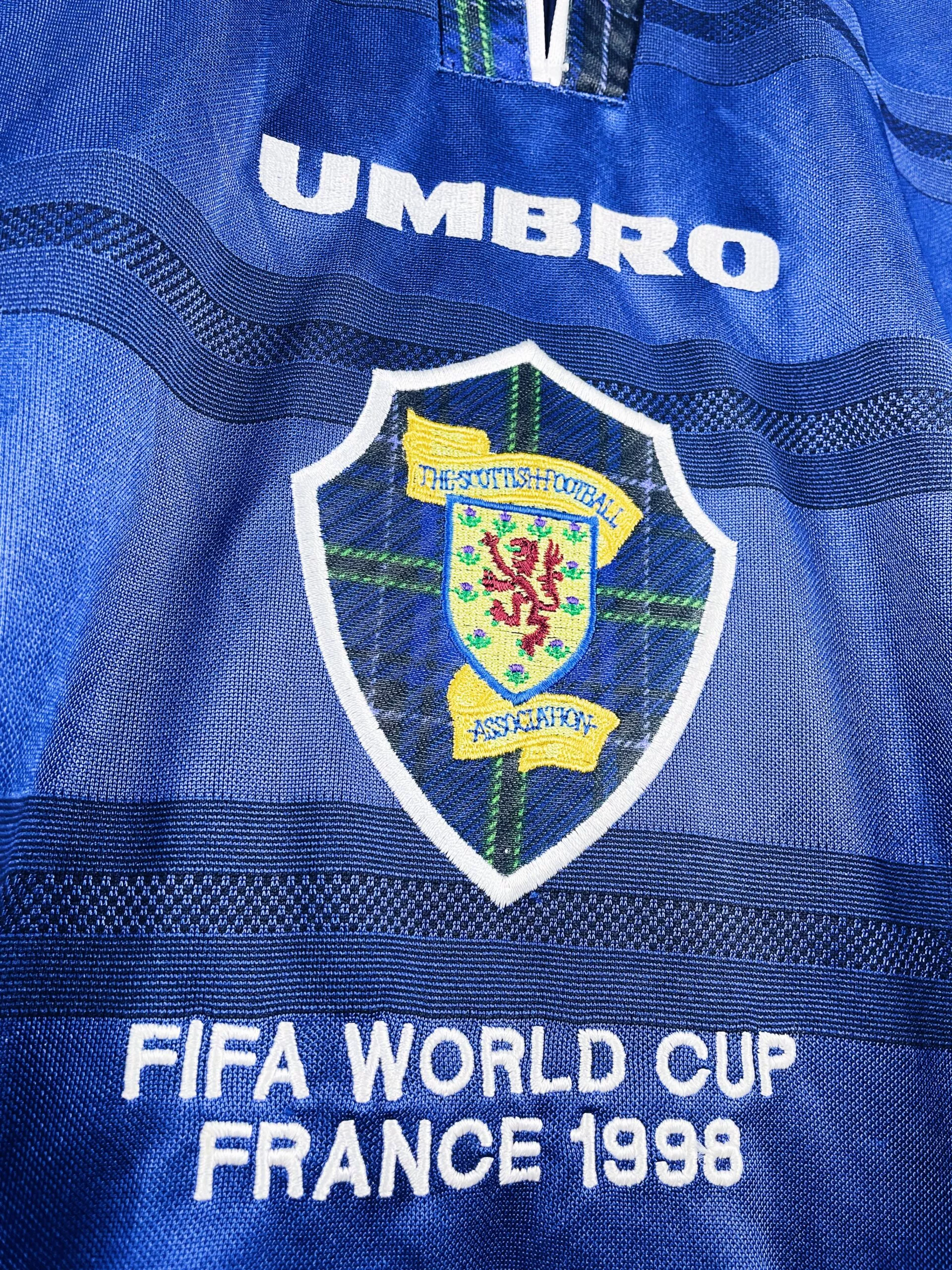 Taille : XL Si tu veux plus de détails, tu peux nous contacter par mail ou sur les réseaux 😉 Etat : 8/10 très bon état Le maillot : maillot vintage domicile de l’Ecosse 1998 porté (match worn) par Dailly #22. L’écusson, le logo Umbro, « FIFA World Cup France 98 » sont brodés, Daily 22 est en feutrine. Quel maillot rétro de l’Ecosse ! Histoire : maillot porté par Christian Dailly lors du match de poules contre le Maroc. Il joue tout le match. Défaite 3-0. Le maillot a été récupéré via un proche d’un joueur marocain. Un certificat d’authenticité sera…