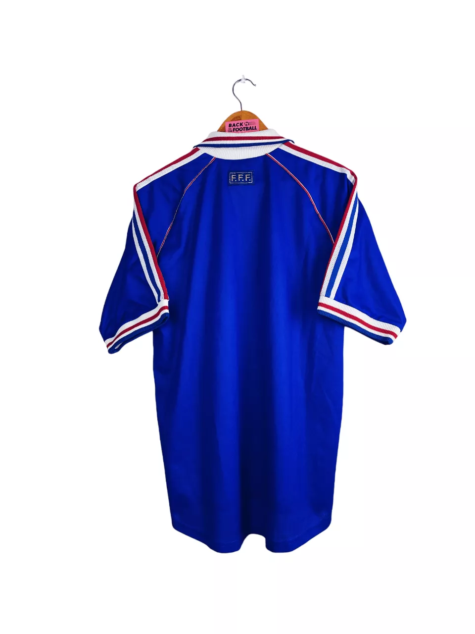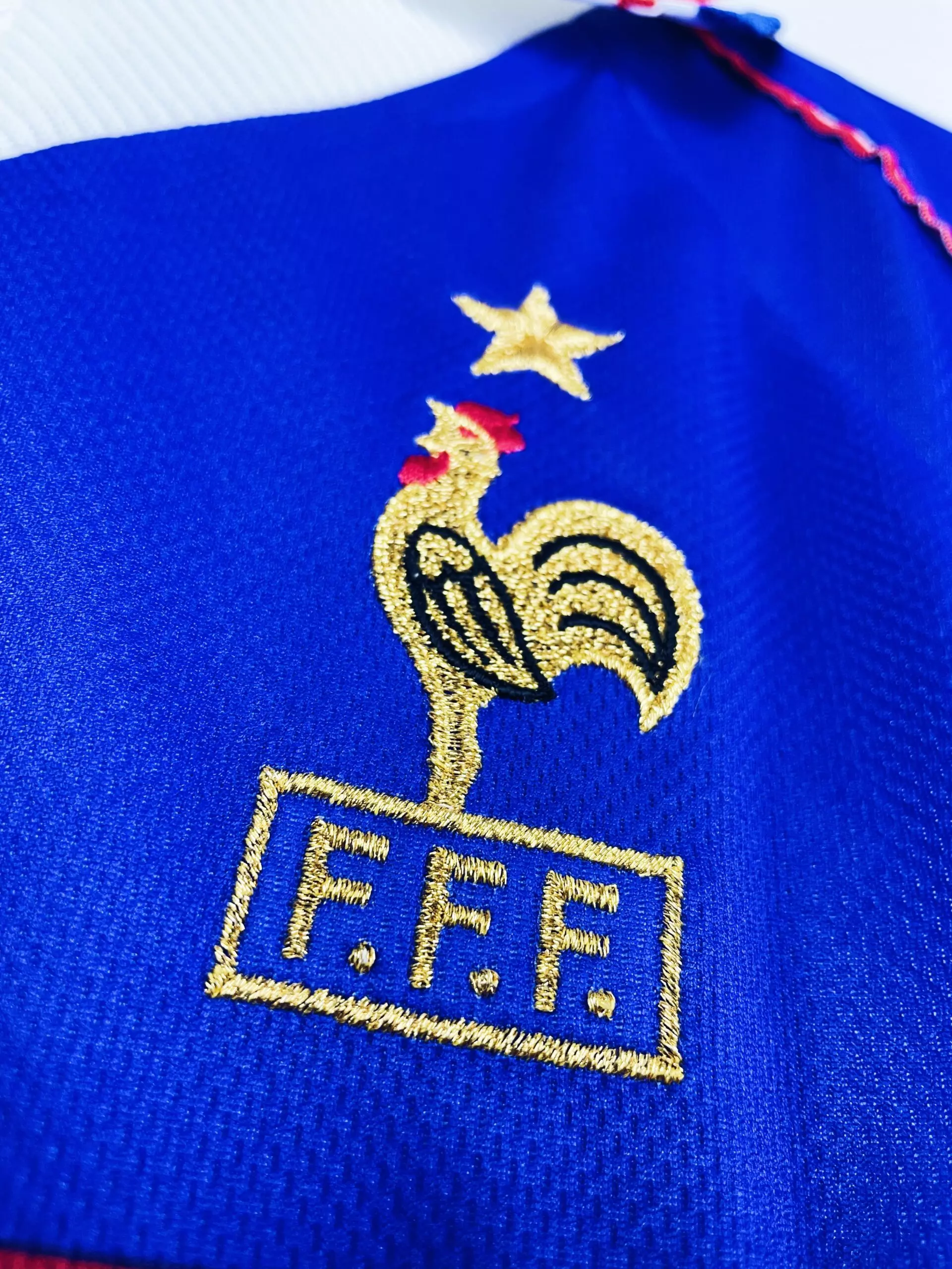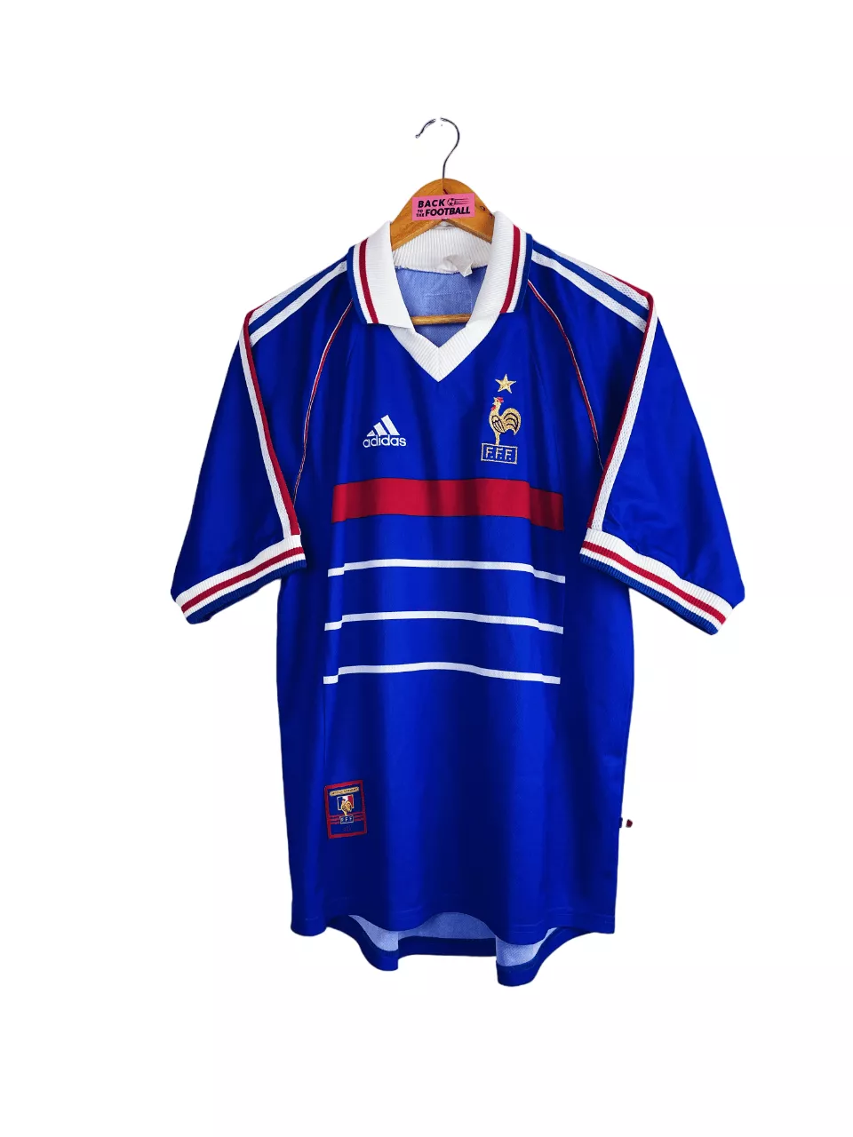 Taille : M Si tu veux plus de détails, tu peux nous contacter par mail ou sur les réseaux 😉 Etat : 8/10, très bon état, quelques légères bouloches dans le dos (voir photo) Le maillot : maillot vintage domicile de l’équipe de France 1998 pour la Coupe du Monde 98, la version avec l’étoile. L’écusson et le logo Adidas sont brodés. Très beau maillot rétro de l’équipe de France ! Histoire : la première étoile des bleus ! tout le monde connait l’histoire mais on se la refait : l’équipe de France se qualifie automatiquement en tant que pays…
