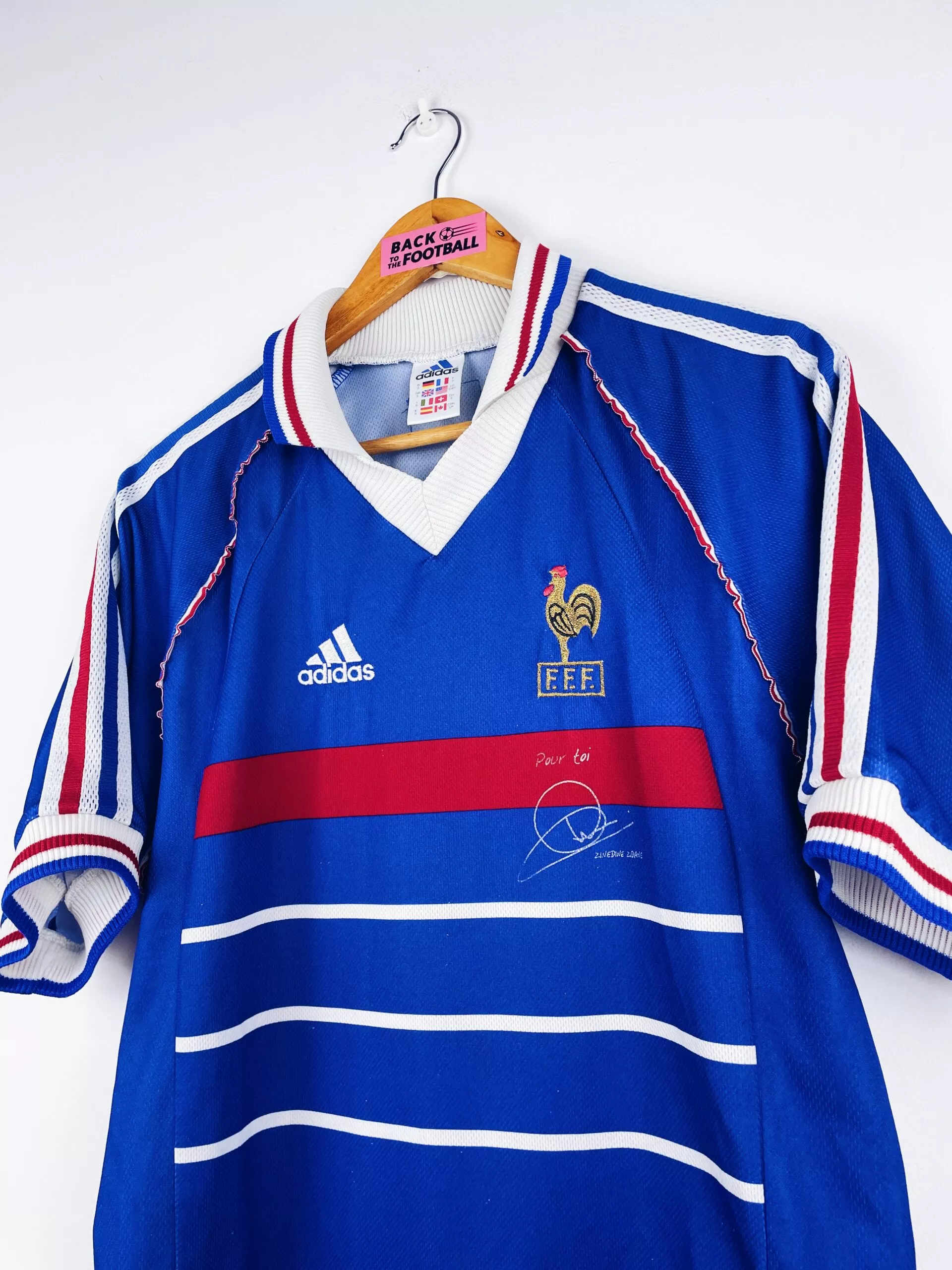 Taille : S Si tu veux plus de détails, tu peux nous contacter par mail ou sur les réseaux 😉 Etat : 7.5/10, très bon état général, le patch Adidas en bas a été enlevé et il y a un petite trace à l’intérieur du col (voir photos) Le maillot : maillot vintage domicile de l’équipe de France 1998 pour la Coupe du Monde 98, la version sans étoile et avec signature de Zidane. L’écusson et le logo Adidas sont brodés. Très beau maillot rétro de l’équipe de France ! Histoire : la première étoile des bleus ! tout le…