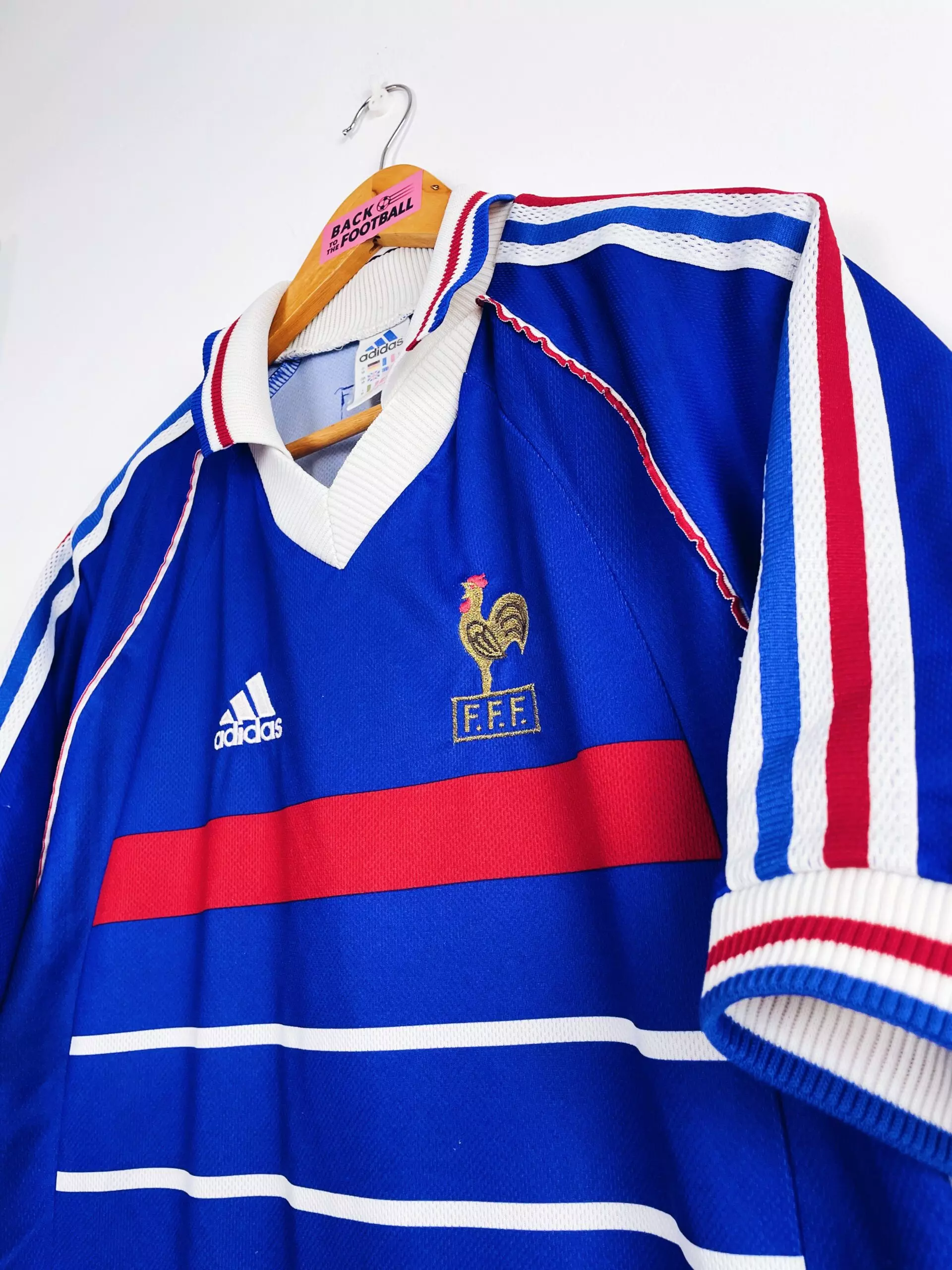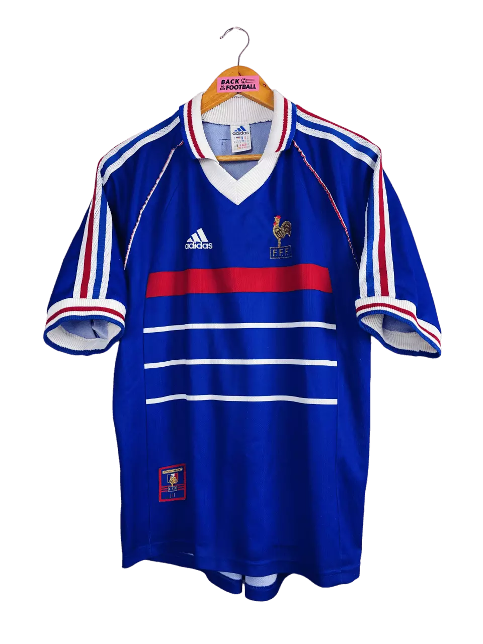 Taille : S Etat : 7.5/10, très bon état général mais quelques bouloches et 2 accros dans le dos (voir photo) Le maillot : maillot vintage domicile de l’équipe de France pour la Coupe du Monde 1998, la version sans l’étoile. L’écusson et le logo Adidas sont brodés. Très beau maillot rétro de l’équipe de France ! Histoire : la première étoile des bleus ! tout le monde connait l’histoire mais on se la refait : l’équipe de France se qualifie automatiquement en tant que pays organisateur, après avoir raté les 2 derniers mondiaux. Les Bleus battent largement l’Afrique du…