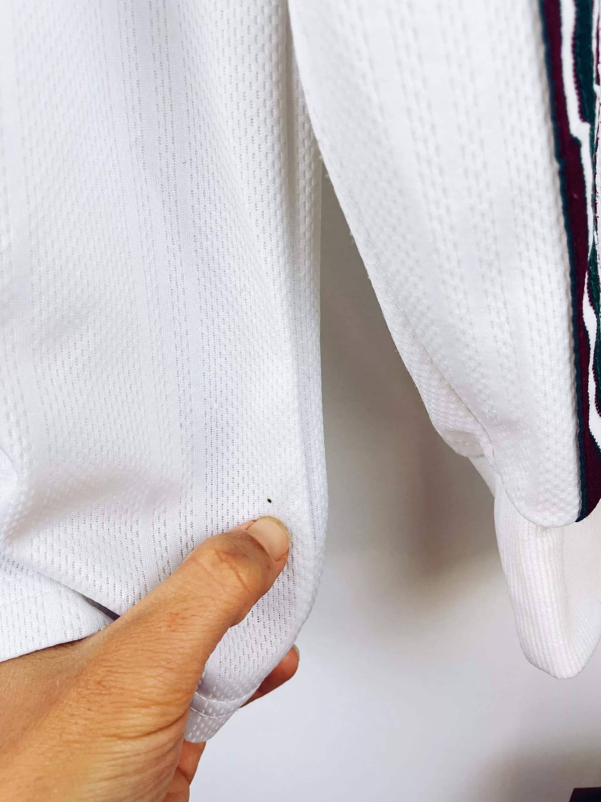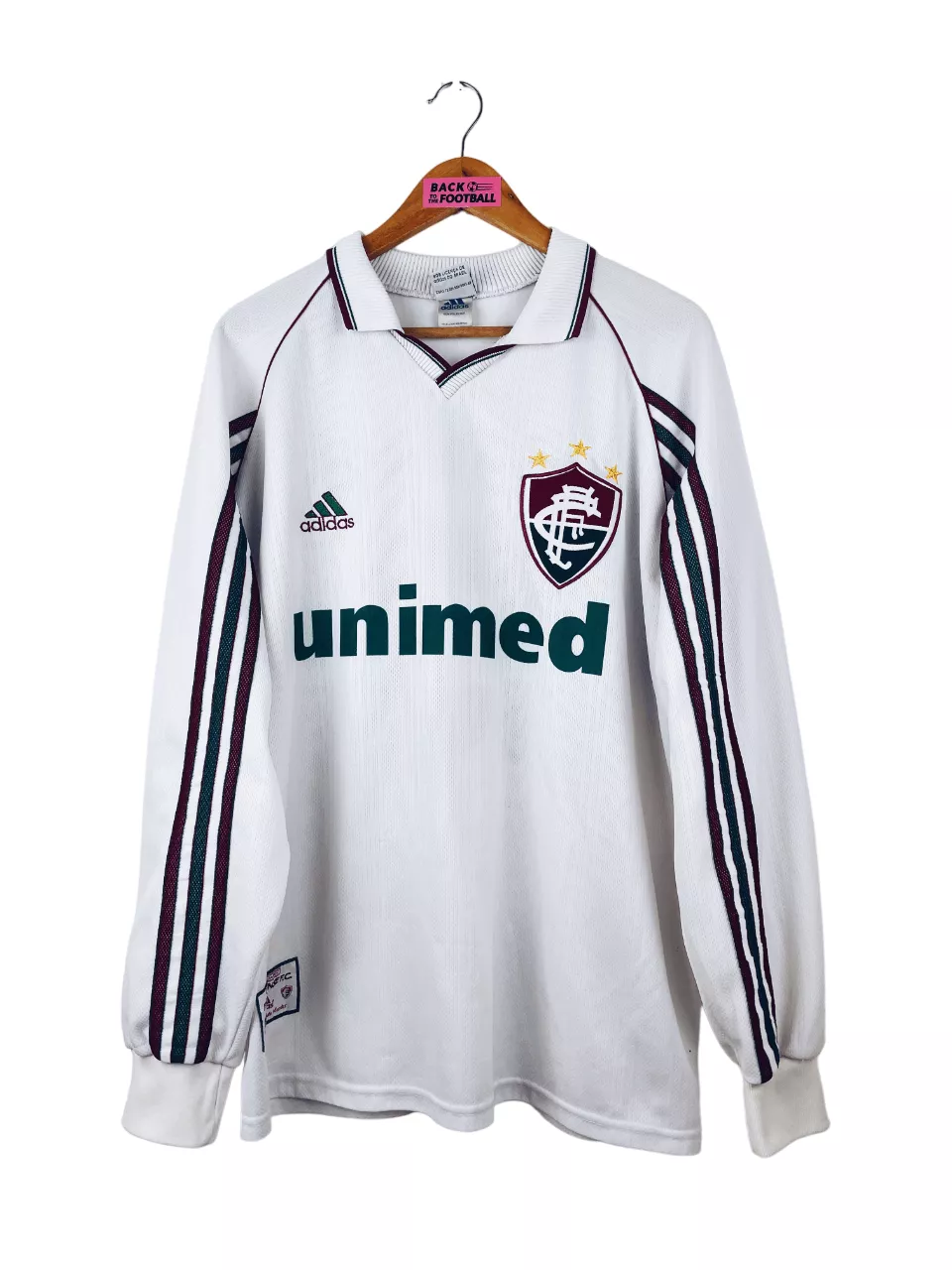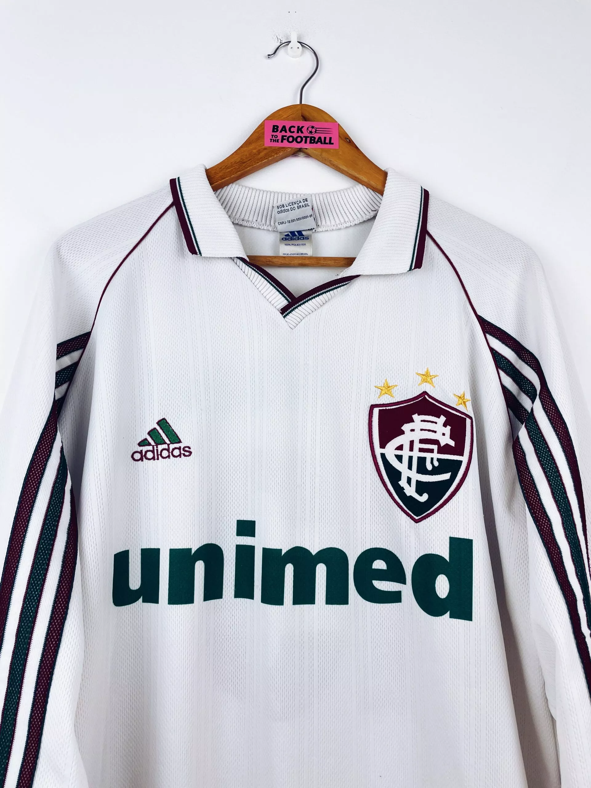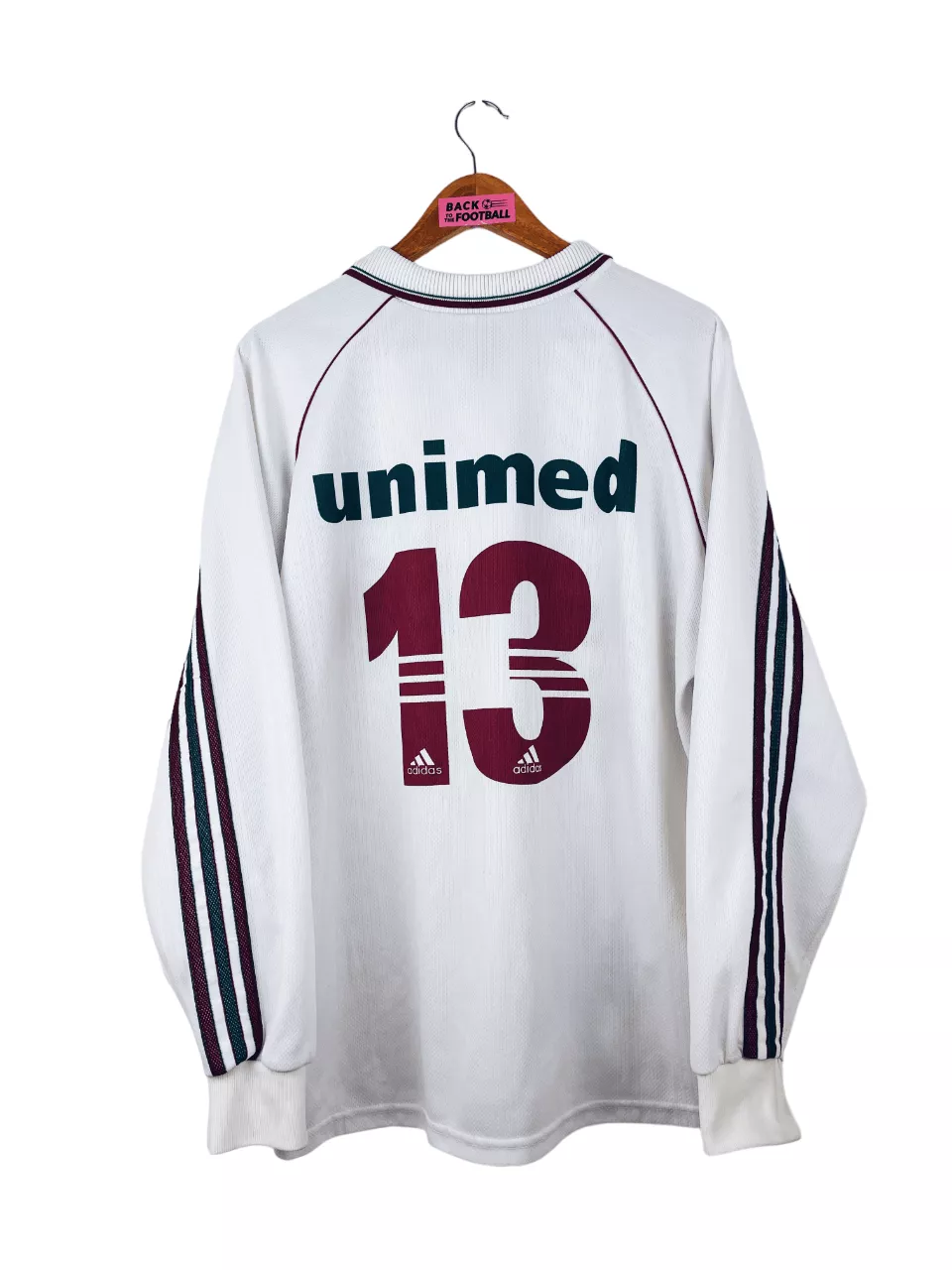 Taille : L Si tu veux plus de détails, tu peux nous contacter par mail ou sur les réseaux 😉 Etat : 8/10, très bon état, mini point noir en bas du maillot (voir photo) Le maillot : maillot vintage extérieur de Fluminense 1998 manches longues floqué du numéro 13. L’écusson et le logo Adidas sont brodés, le sponsor Unimed et le #13 au dos sont incrustés. Très beau maillot rétro de Fluminense ! Histoire : descendu la saison passée, le club de Rio de Janeiro continue sa descente aux enfers avec une 19ème place sur 24, synonyme de descente…