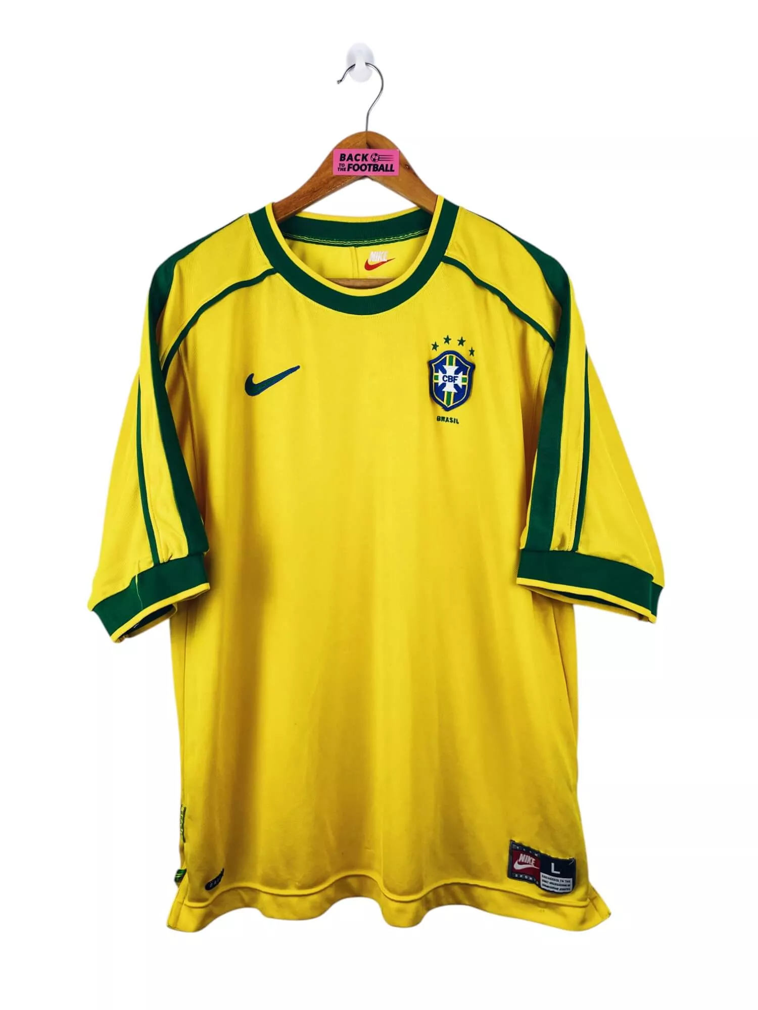 Taille : L Largeur : 58cm (aisselle à aisselle) Longueur : 73cm (base du col au bas) Si tu veux plus d’infos, tu peux nous contacter par mail ou sur les réseaux 😉 Etat : 8.5/10, très bon état, quelques bouloches Le maillot : maillot vintage du Brésil 1998 pour la Coupe du Monde. L’écusson avec les 4 étoiles est brodé, comme le logo Nike. Quel maillot rétro du Brésil ! Histoire : on connait bien l’histoire, avec la finale perdue 3-0 face aux français. Pourtant la Seleçao avait une sacré équipe : Cafu, Roberto Carlos, Dunga, Rivaldo, Leonardo, Denilson,…