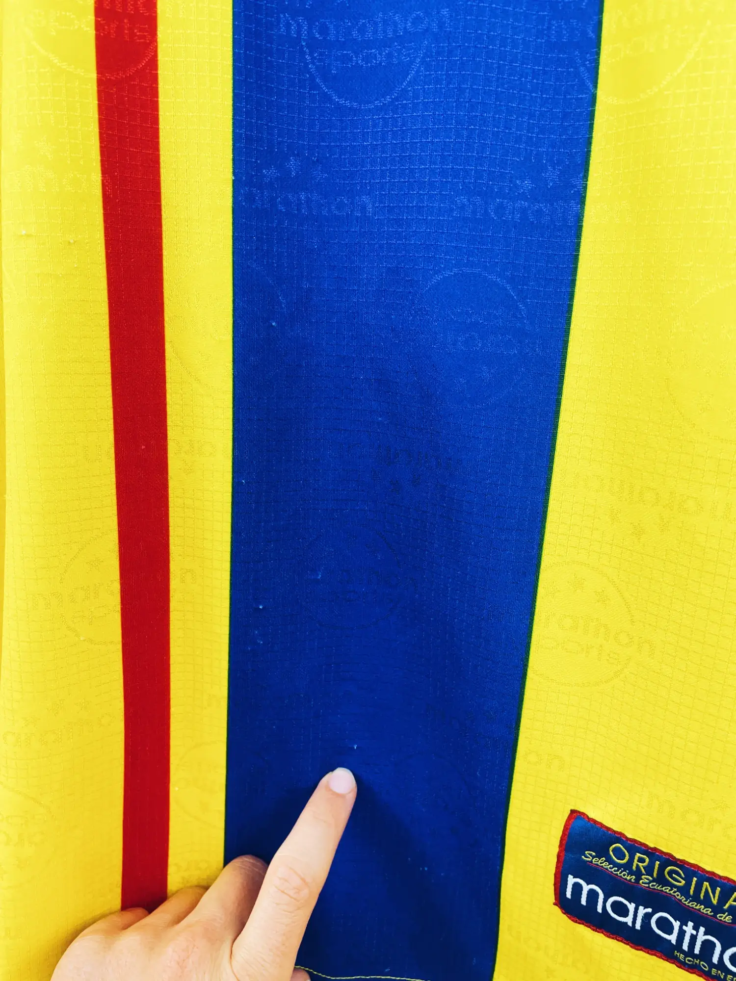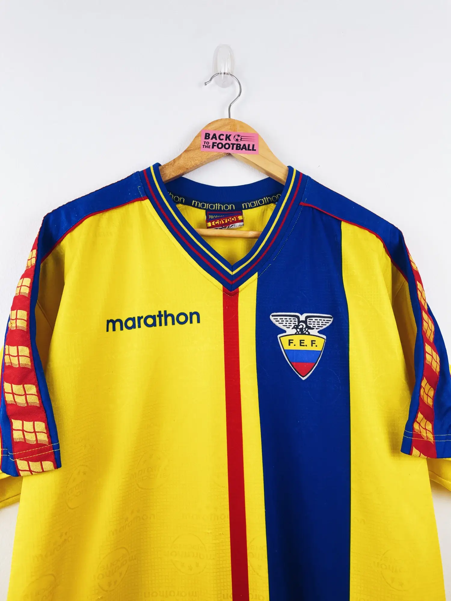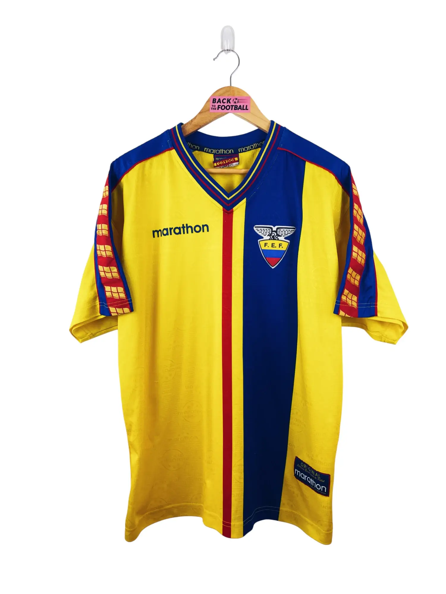 Taille : L – taille large Largeur : 58cm (aisselle à aisselle) Longueur : 72cm (base du col au bas) Si tu veux plus d’infos, tu peux nous contacter par mail ou sur les réseaux 😉 Etat : 8/10, très bon état, quelques bouloches, mini trace sur une manche (voir photos) Le maillot : maillot vintage domicile de l’Equateur 1998. L’écusson est en feutrine, le logo Marathon est incrusté. On peut voir le logo Marathon sports en tramé sur tout le maillot. Très beau maillot rétro de l’Equateur ! Histoire : l’Equateur n’arrive pas à se qualifier pour le Mondial…
