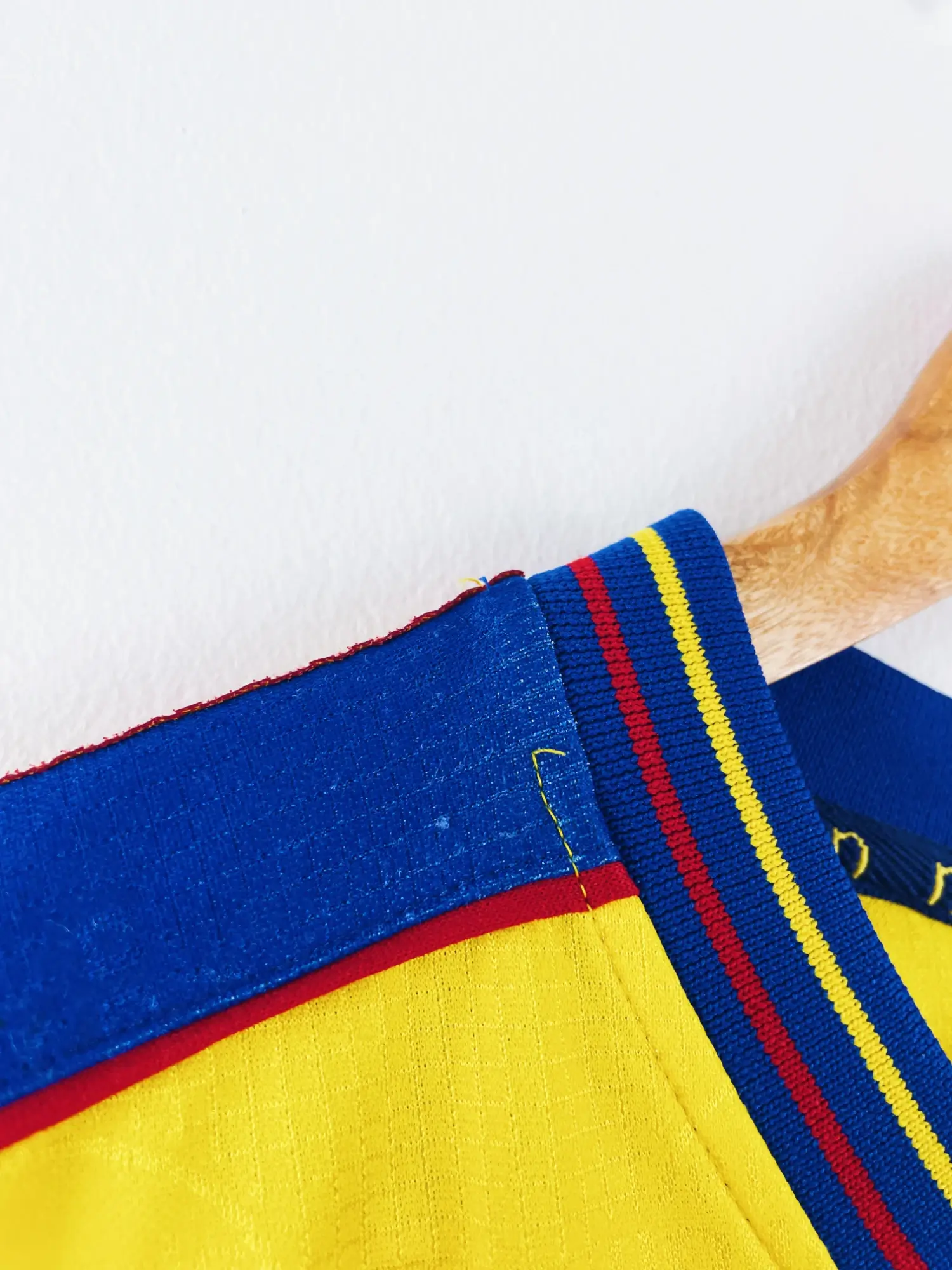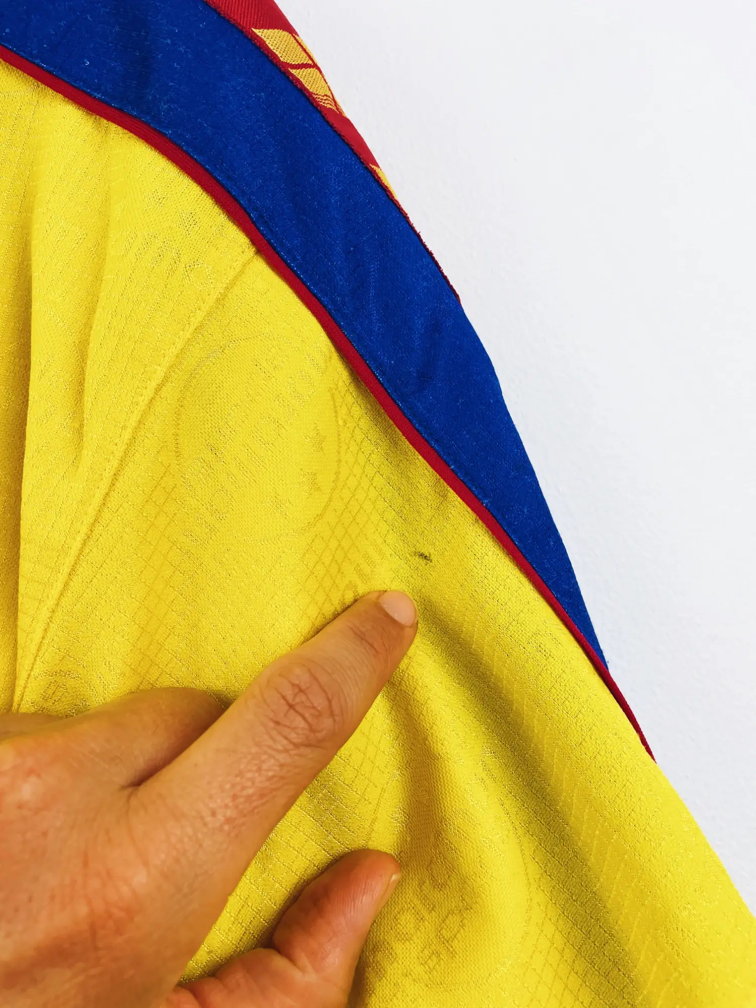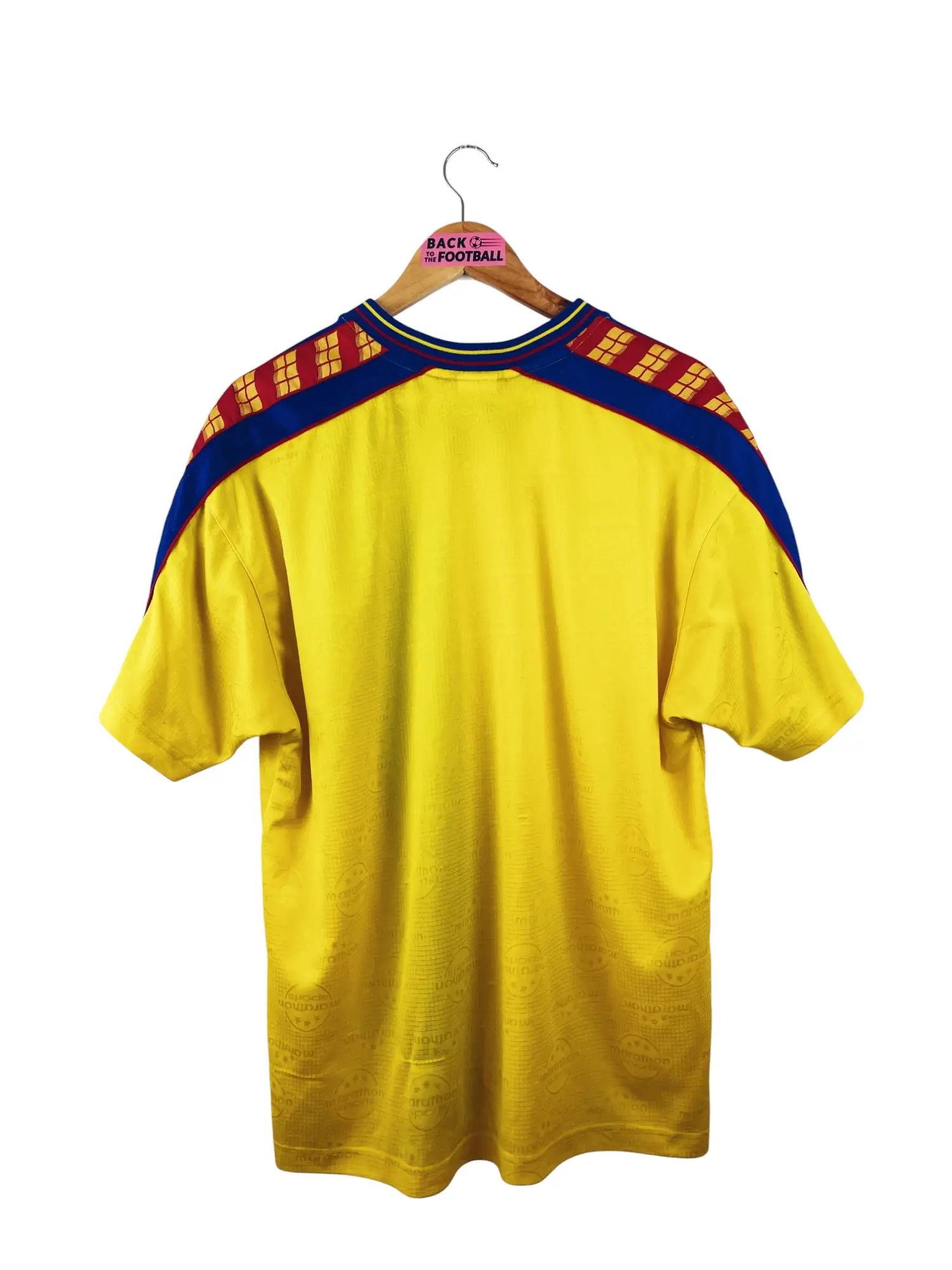 Taille : L – taille large Largeur : 58cm (aisselle à aisselle) Longueur : 72cm (base du col au bas) Si tu veux plus d’infos, tu peux nous contacter par mail ou sur les réseaux 😉 Etat : 8/10, très bon état, quelques bouloches, mini trace sur une manche (voir photos) Le maillot : maillot vintage domicile de l’Equateur 1998. L’écusson est en feutrine, le logo Marathon est incrusté. On peut voir le logo Marathon sports en tramé sur tout le maillot. Très beau maillot rétro de l’Equateur ! Histoire : l’Equateur n’arrive pas à se qualifier pour le Mondial…