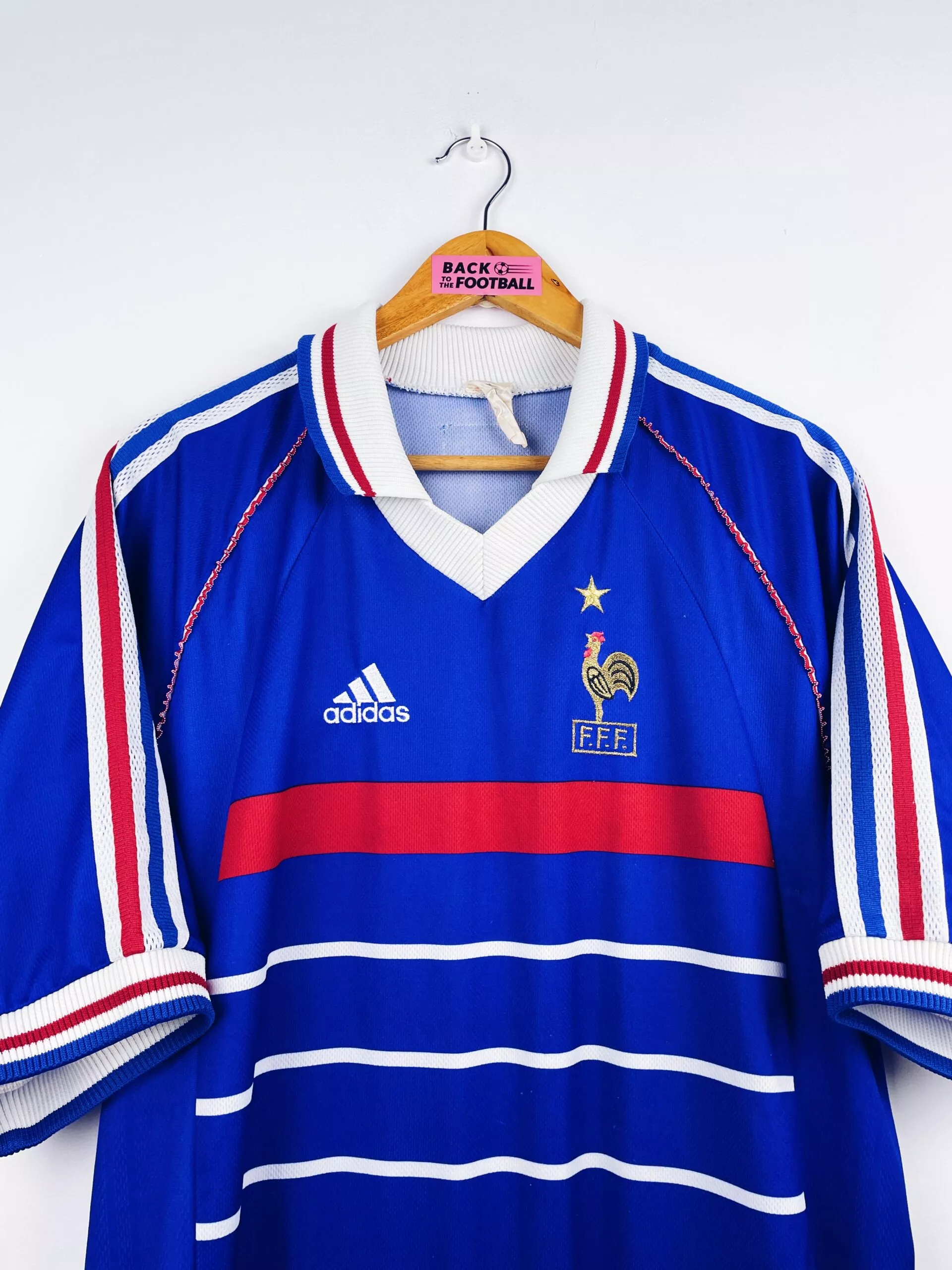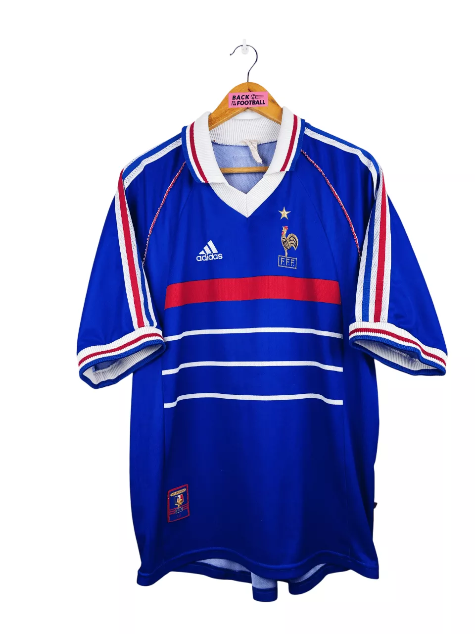 Taille : L Si tu veux plus de détails, tu peux nous contacter par mail ou sur les réseaux 😉 Etat : 8/10, très bon état, mini trace sur le devant (voir photo) Le maillot : maillot vintage domicile de l’équipe de France 1998 pour la Coupe du Monde 98, la version avec l’étoile. L’écusson et le logo Adidas sont brodés. Très beau maillot rétro de l’équipe de France ! Histoire : la première étoile des bleus ! tout le monde connait l’histoire mais on se la refait : les Bleus battent largement l’Afrique du Sud 3-0 en match d’ouverture.…
