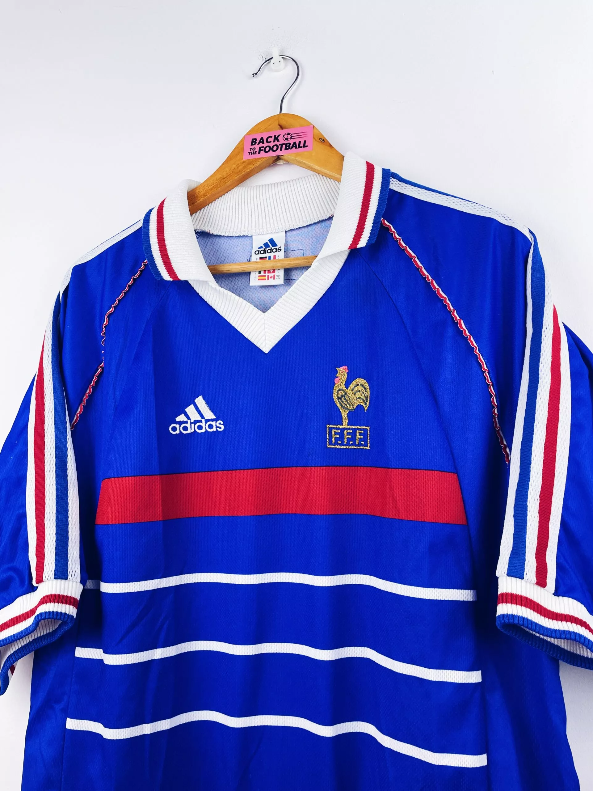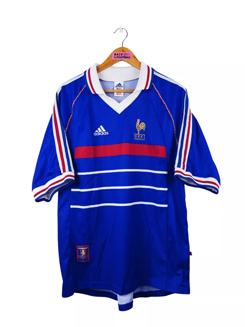Taille : L Si tu veux plus de détails, tu peux nous contacter par mail ou sur les réseaux 😉 Etat : 8/10, très bon état. Le maillot : maillot vintage domicile de l’équipe de France pour la Coupe du Monde 1998, la version sans l’étoile. L’écusson et le logo Adidas sont brodés. Très beau maillot rétro de l’équipe de France ! Histoire : la première étoile des bleus ! tout le monde connait l’histoire mais on se la refait : l’équipe de France se qualifie automatiquement en tant que pays organisateur, après avoir raté les 2 derniers mondiaux. Les…