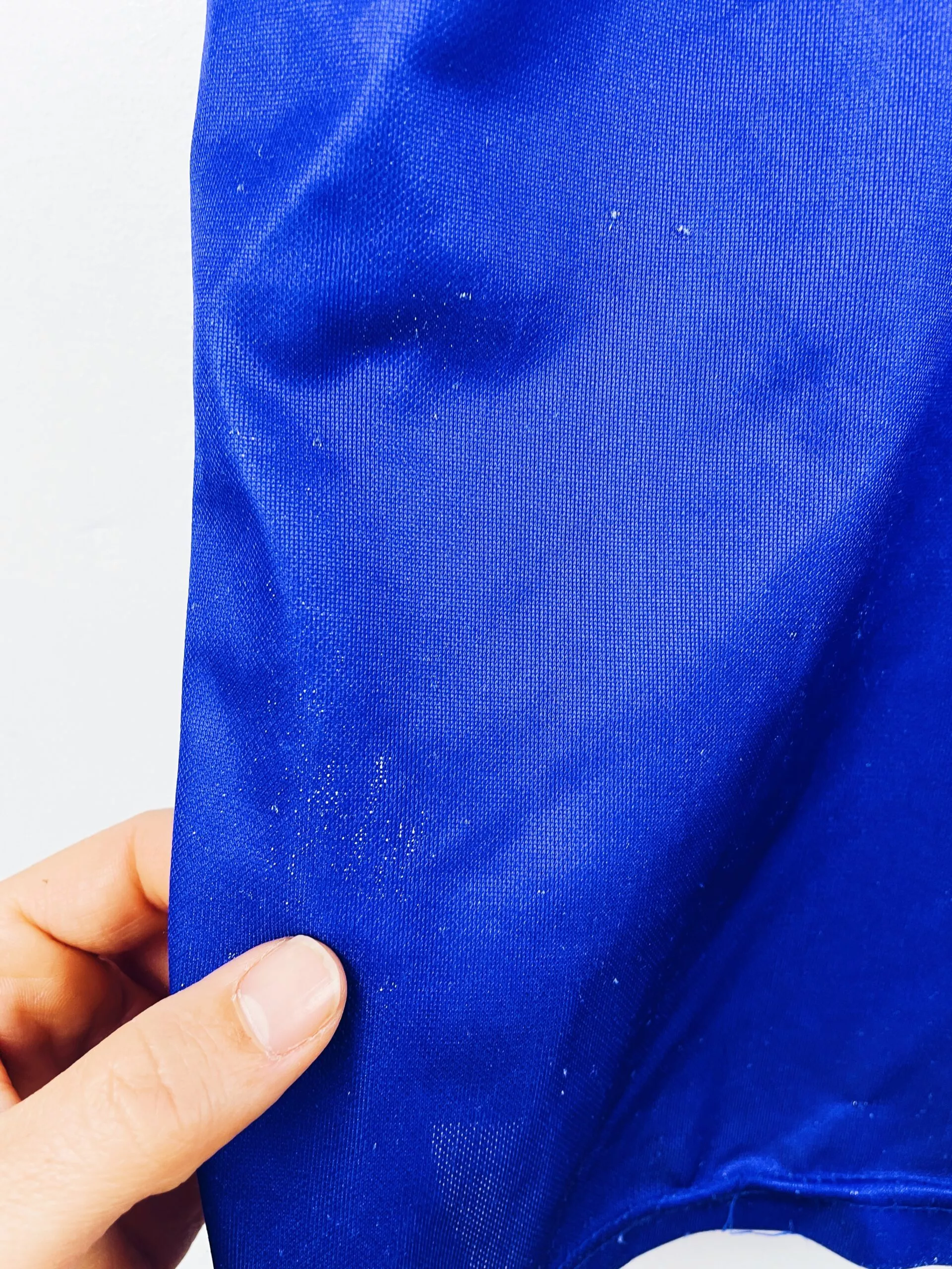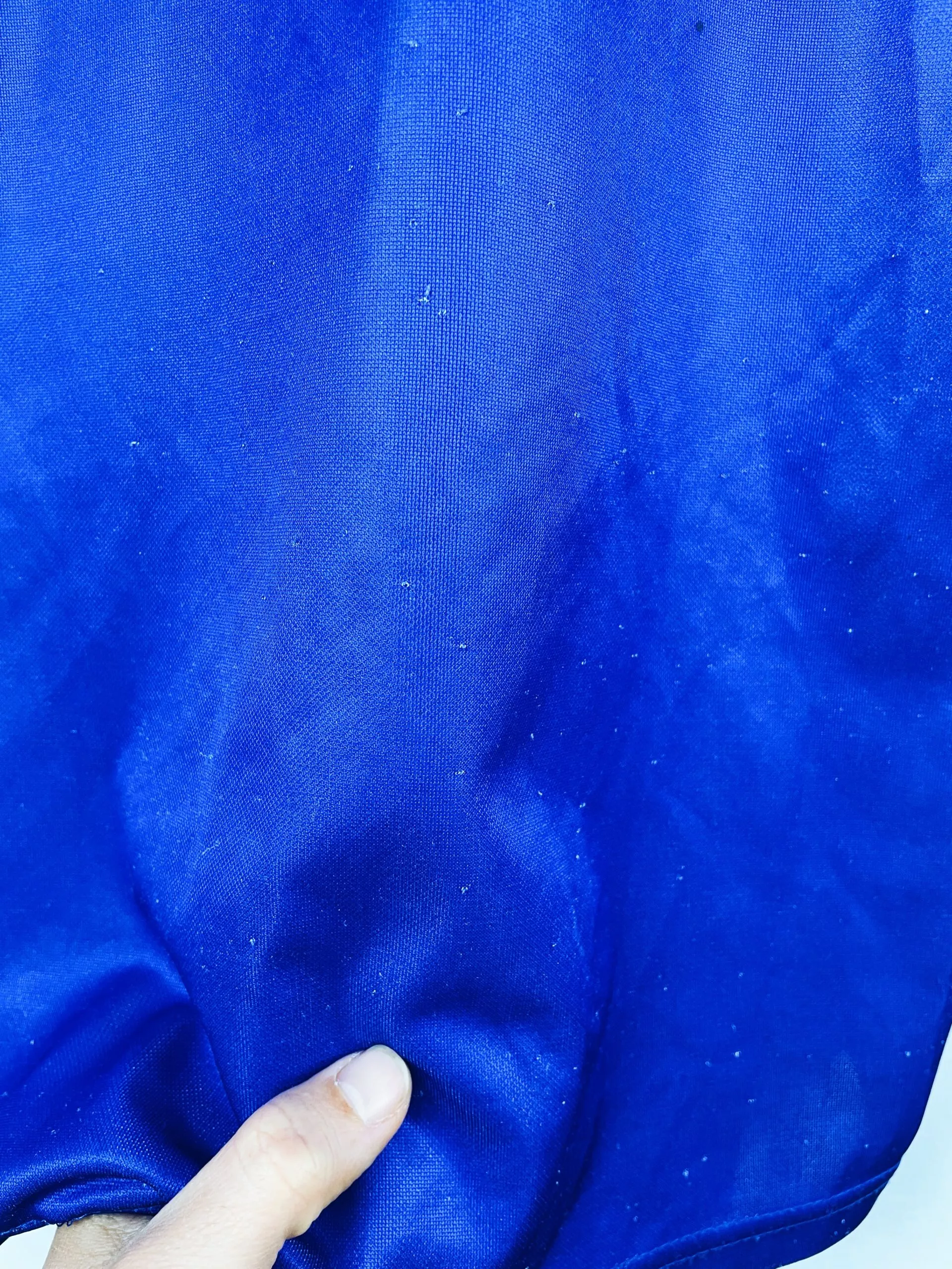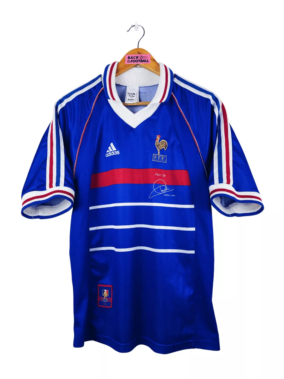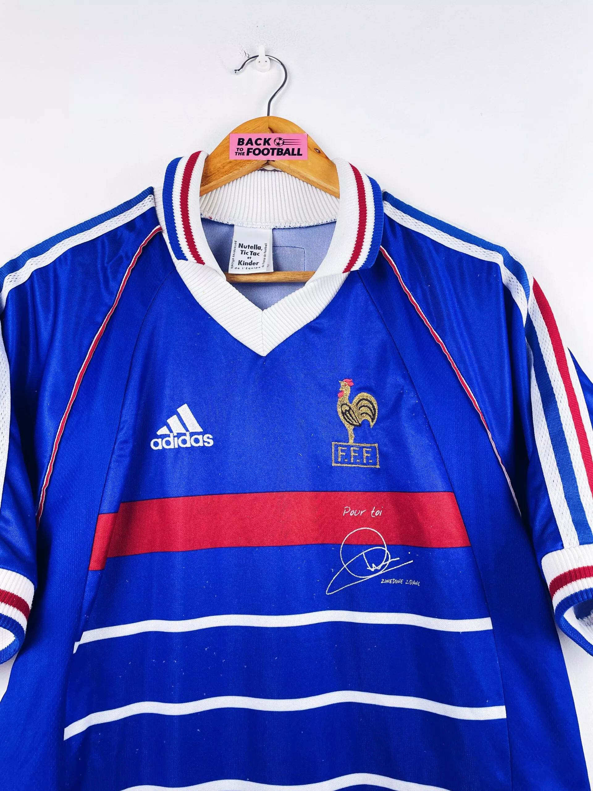 Taille : S Largeur : 48cm (aisselle à aisselle) Longueur : 68cm (base du col au bas) Si tu veux plus de détails, tu peux nous contacter par mail ou sur les réseaux 😉 Etat : 6/10, bon état général mais beaucoup de bouloches, notamment en bas du dos et des traces blanches en bas (voir photos) Le maillot : maillot vintage domicile de l’équipe de France 1998 pour la Coupe du Monde. L’écusson sans l’étoile et le logo Adidas sont brodés. « Pour toi Zidane » est incrusté. Version officielle Kinder. Très beau maillot rétro de la France ! Histoire :…