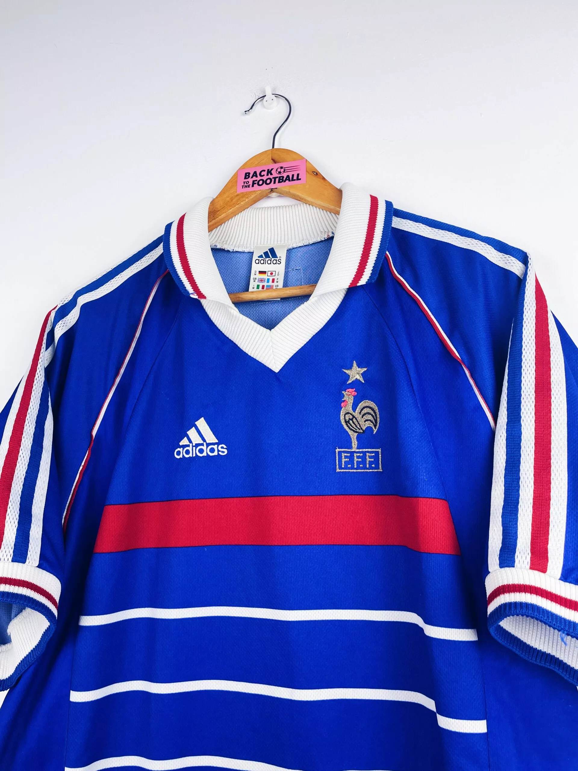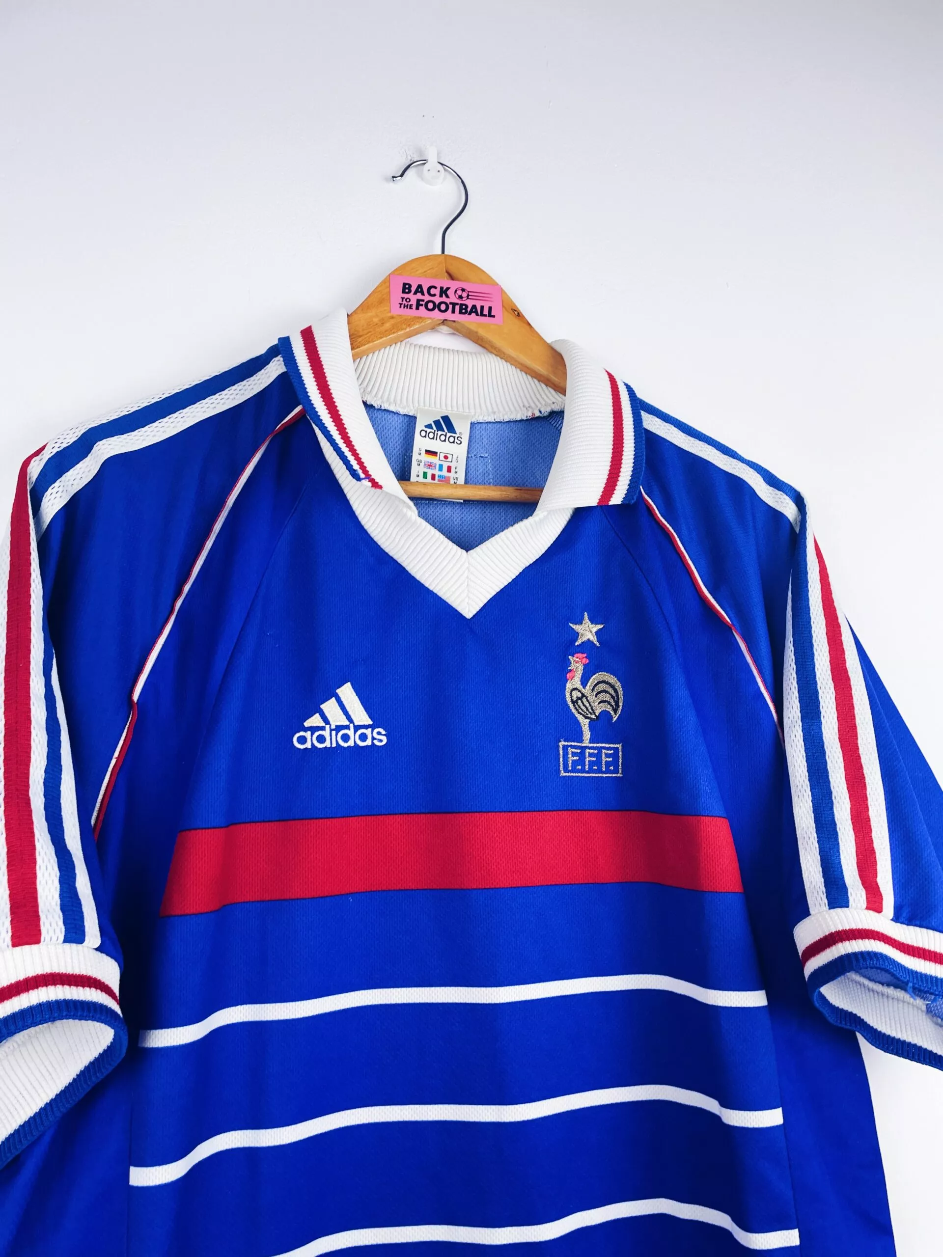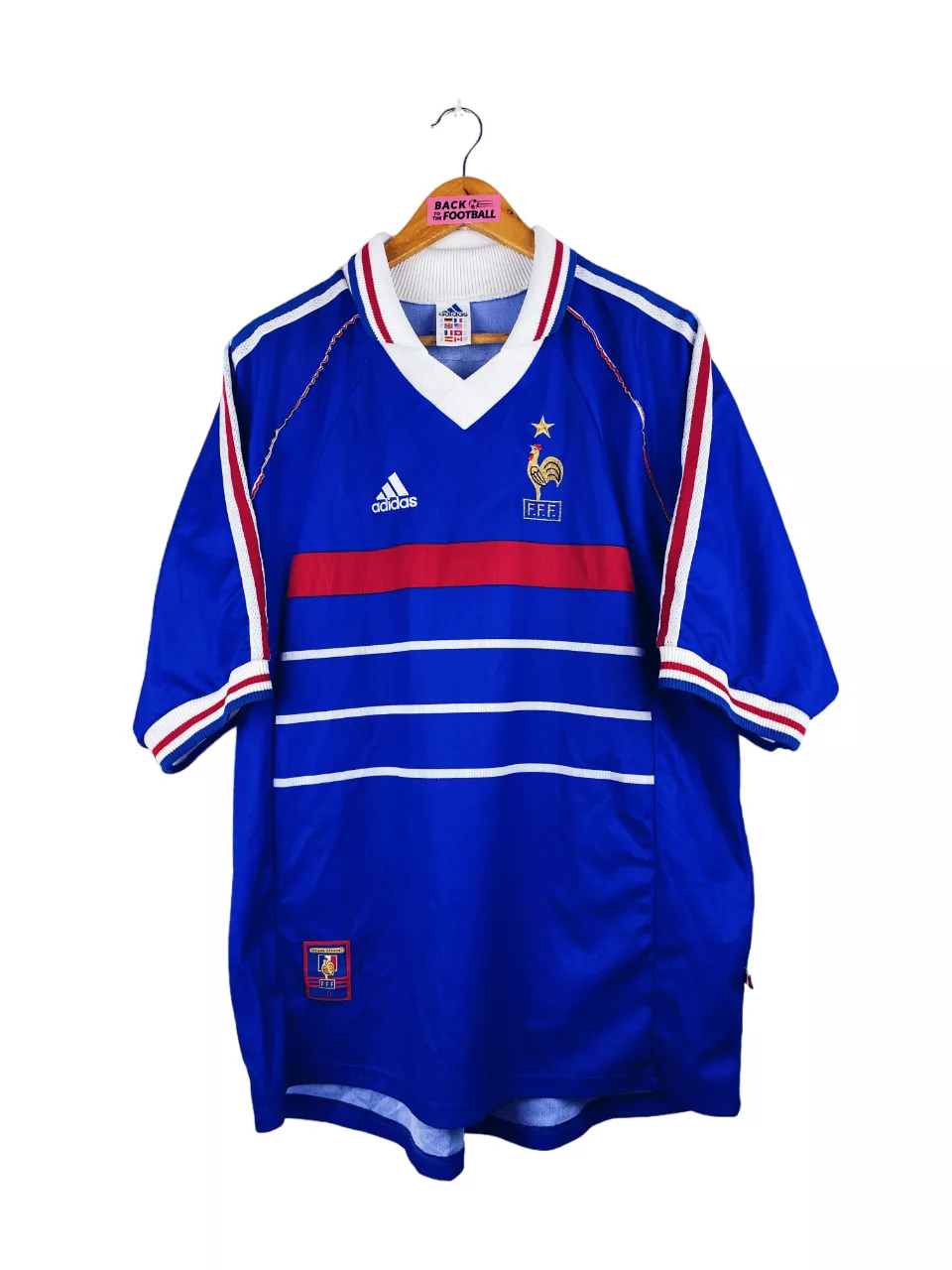 Taille : XL Si tu veux plus de détails, tu peux nous contacter par mail ou sur les réseaux 😉 Etat : 8.5/10, excellent état Le maillot : maillot vintage domicile de l’équipe de France 1998 pour la Coupe du Monde 98, la version avec l’étoile. L’écusson et le logo Adidas sont brodés. Très beau maillot rétro de l’équipe de France ! Histoire : la première étoile des bleus ! tout le monde connait l’histoire mais on se la refait : les Bleus battent largement l’Afrique du Sud 3-0 en match d’ouverture. Ils enchainent contre l’Arabie Saoudite et le Danemark…