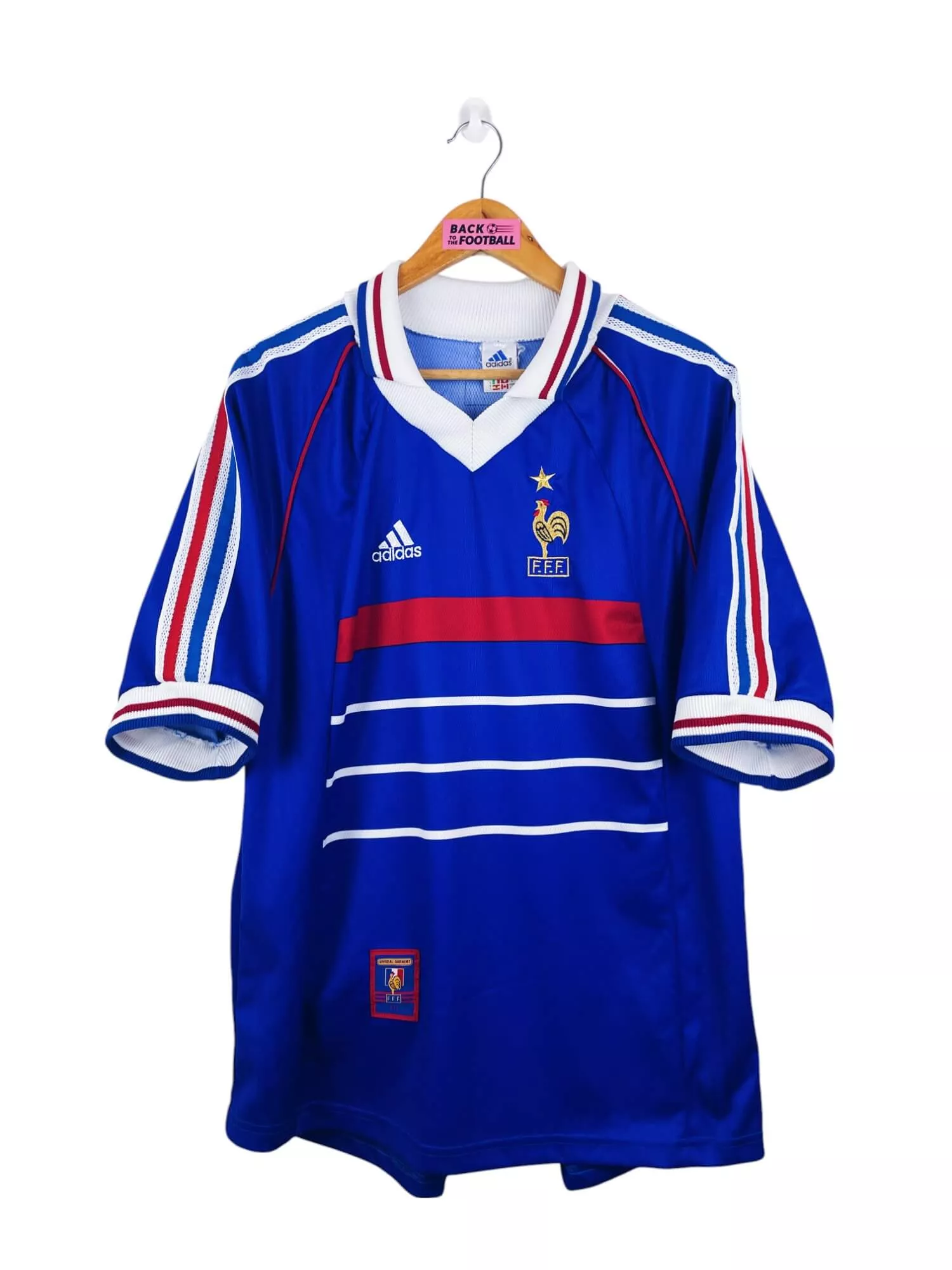 Taille : L Largeur : 55cm (aisselle à aisselle) Longueur : 73cm (base du col au bas) Si tu veux plus d’infos, tu peux nous contacter par mail ou sur les réseaux 😉 Etat : 8.5/10, excellent état, fils tirés au niveau des coutures en haut du dos (voir photo) Le maillot : maillot vintage domicile de l’équipe de France 1998 floqué Zidane #10. La version avec l’étoile. L’écusson et le logo Adidas sont brodés, Zidane #10 est en flocage épais. Très beau maillot rétro de l’équipe de France ! Histoire : la 1ère étoile des bleus ! tout le…