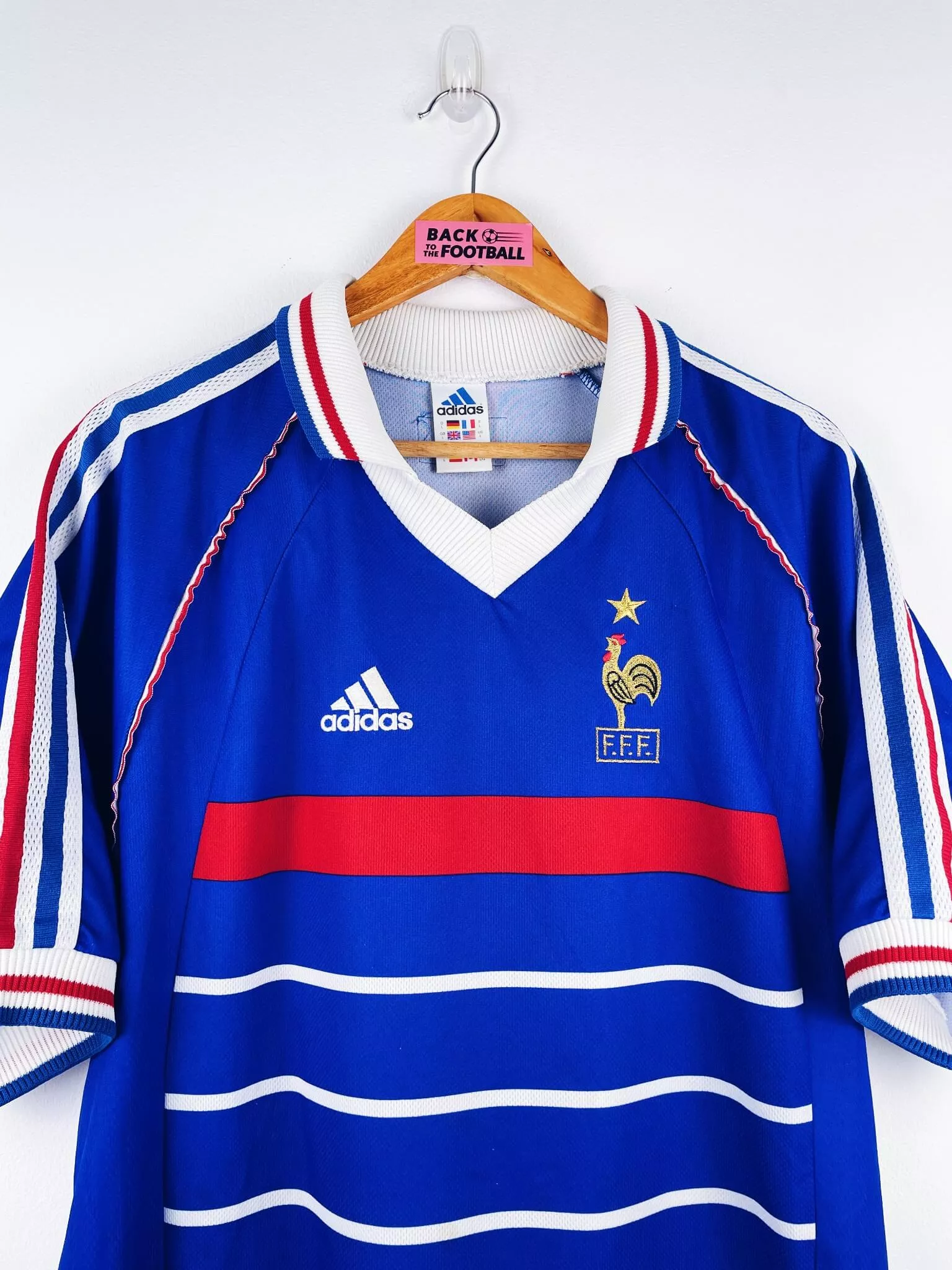 Taille : L Largeur : 58cm (aisselle à aisselle) Longueur : 73cm (base du col au bas) Si tu veux plus d’infos, tu peux nous contacter par mail ou sur les réseaux 😉 Etat : 8/10, très bon état. A noter : un petit accroc en bas du dos, deux micros traces en bas (voir photos) Le maillot : maillot vintage domicile de l’équipe de France 1998 floqué Zidane #10. La version avec l’étoile. L’écusson et le logo Adidas sont brodés, Zidane #10 est en flocage épais. Très beau maillot rétro de l’équipe de France ! Histoire : la 1ère…
