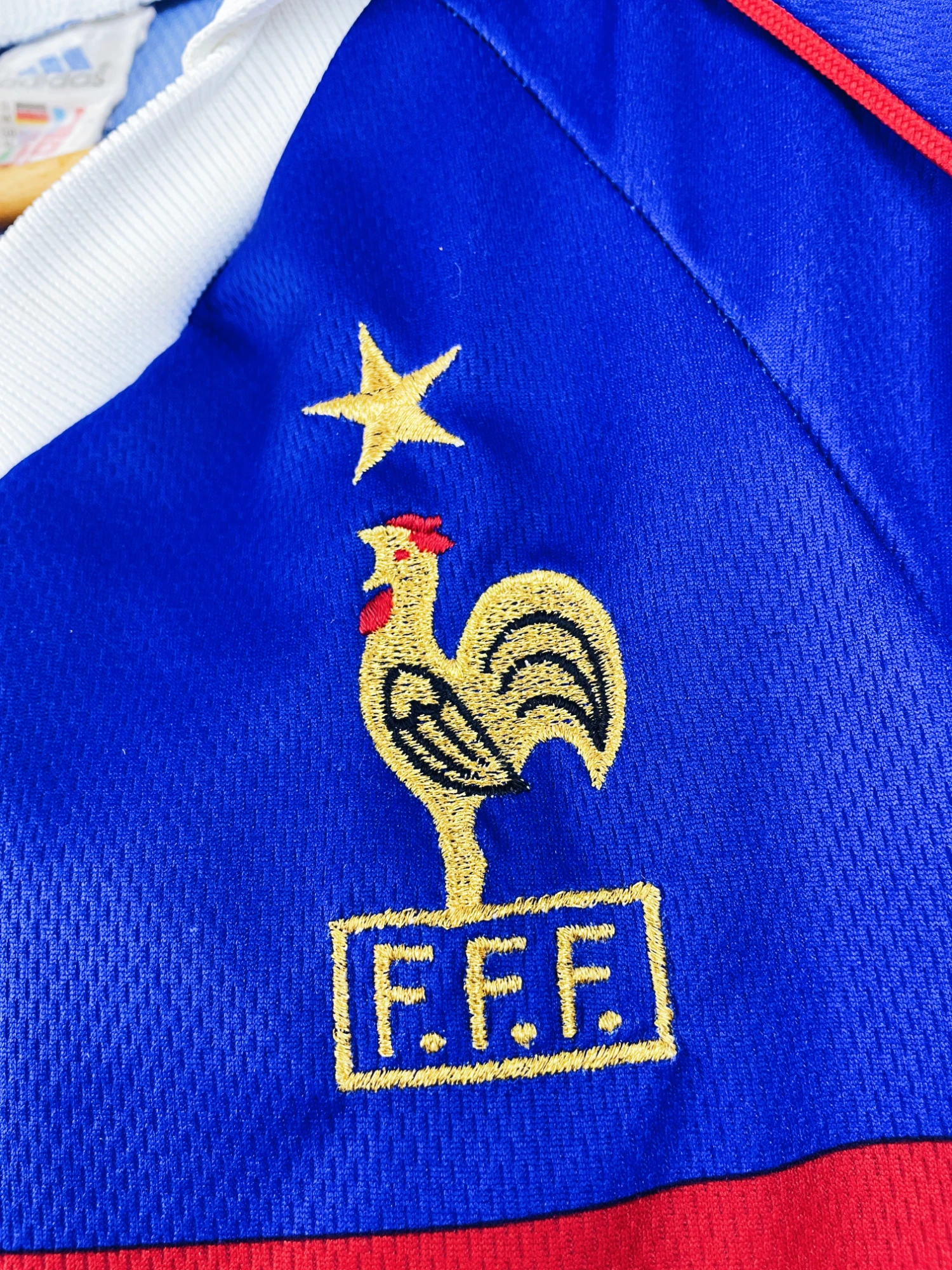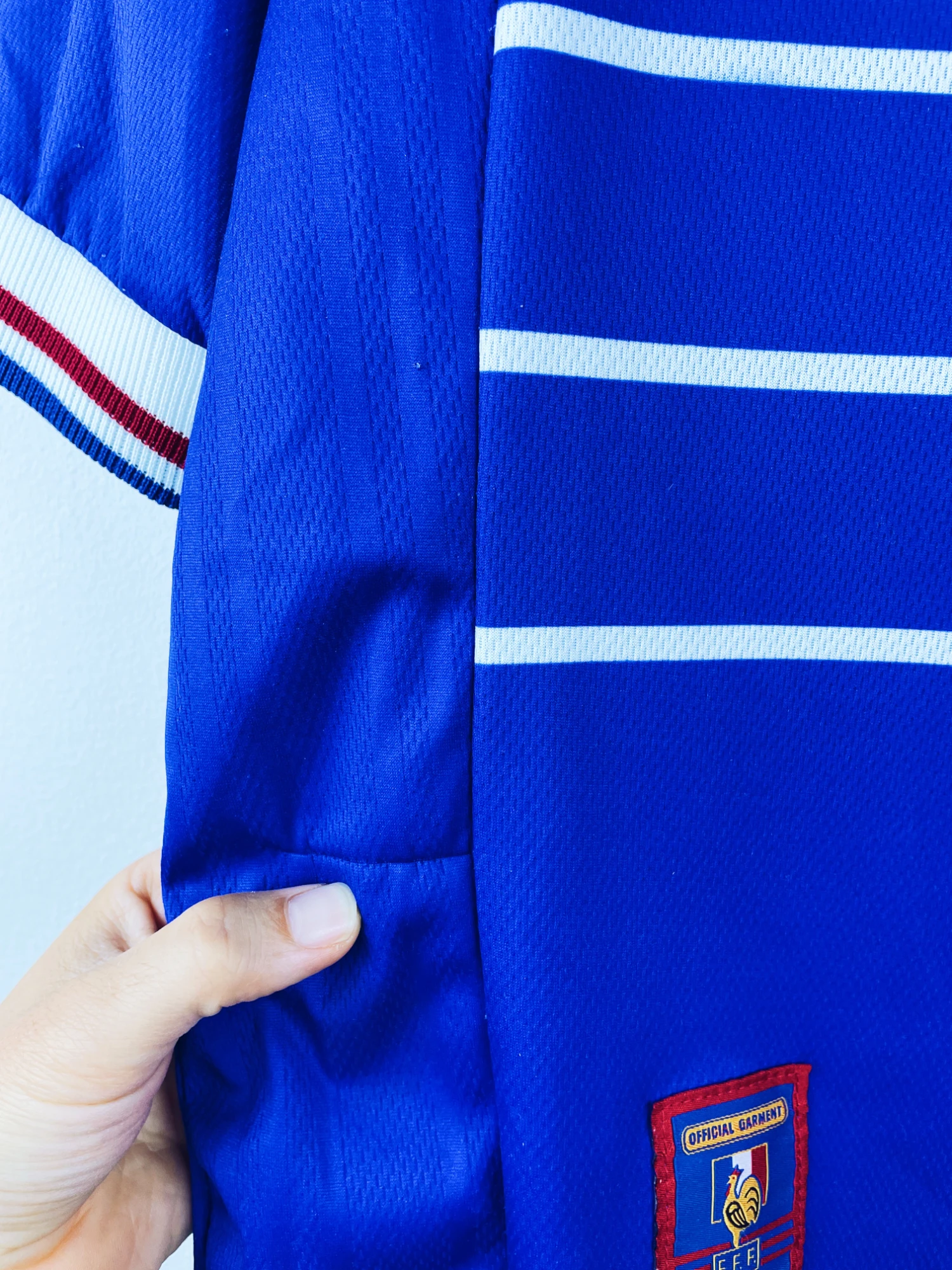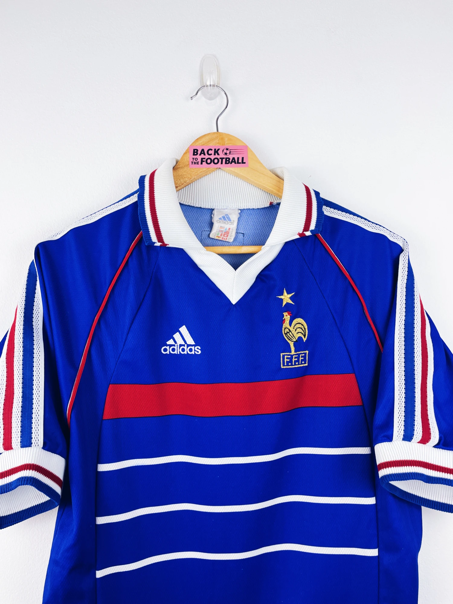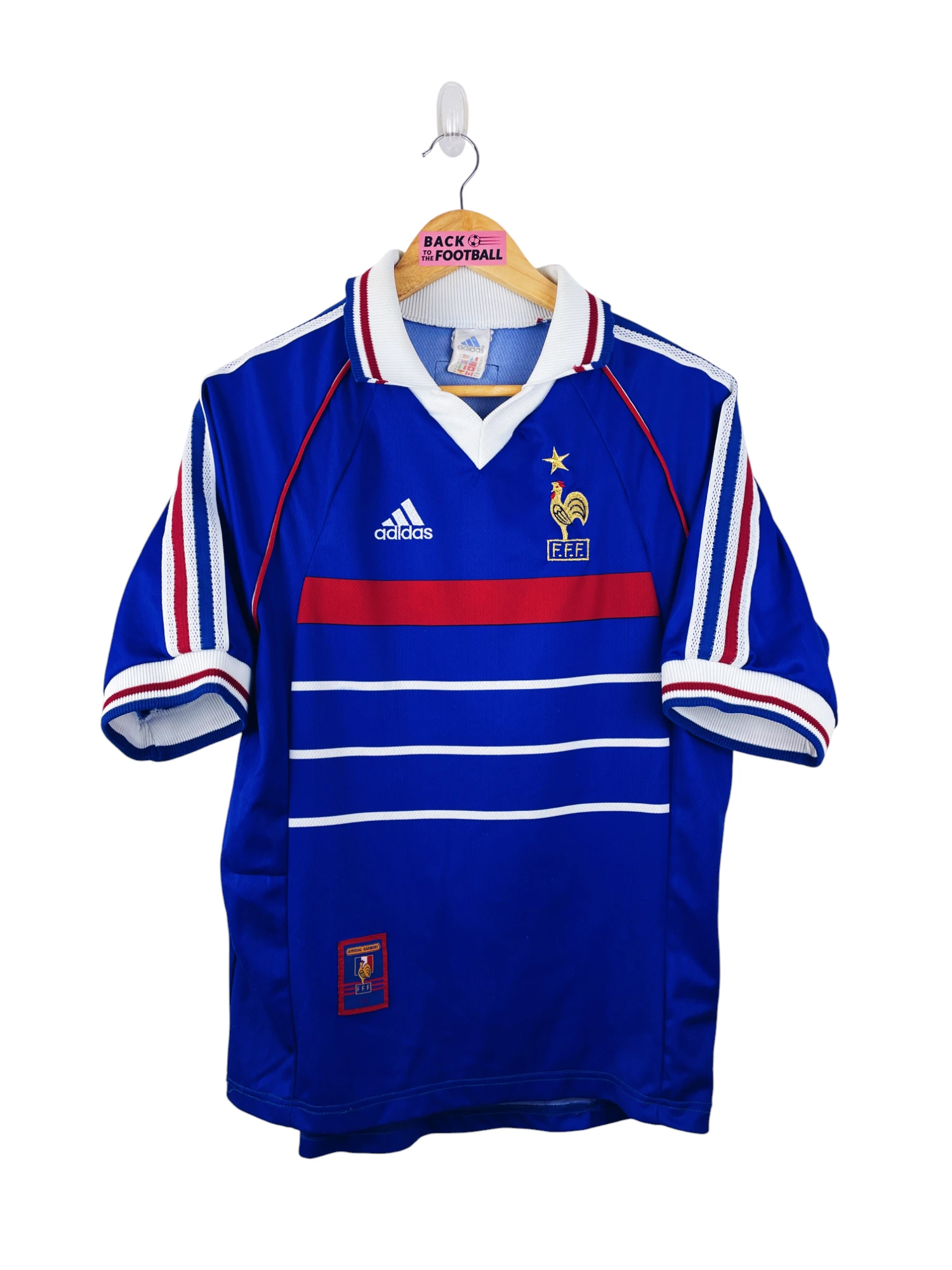 Taille : M Largeur : 51cm (aisselle à aisselle) Longueur : 68cm (base du col au bas) Si tu veux plus d’infos, tu peux nous contacter par mail ou sur les réseaux 😉 Etat : 8.5/10, excellent état hormis quelques bouloches, un accroc sur un côté et le col très légèrement jauni (voir photos) Le maillot : maillot vintage domicile de l’équipe de France 1998 floqué Zidane #10. La version avec l’étoile. L’écusson et le logo Adidas sont brodés, Zidane #10 est en flocage épais. Très beau maillot rétro de l’équipe de France ! Histoire : la 1ère étoile des…