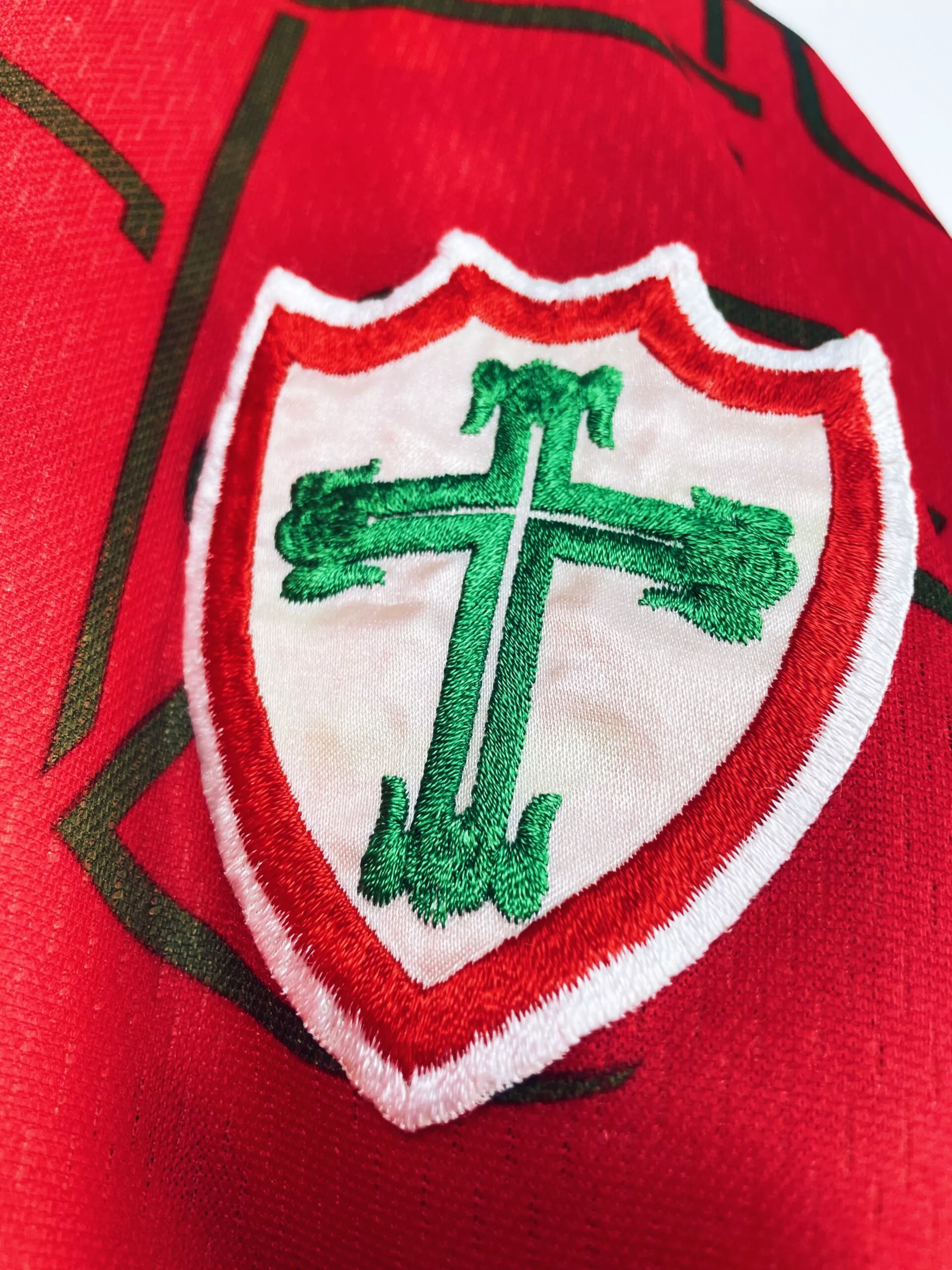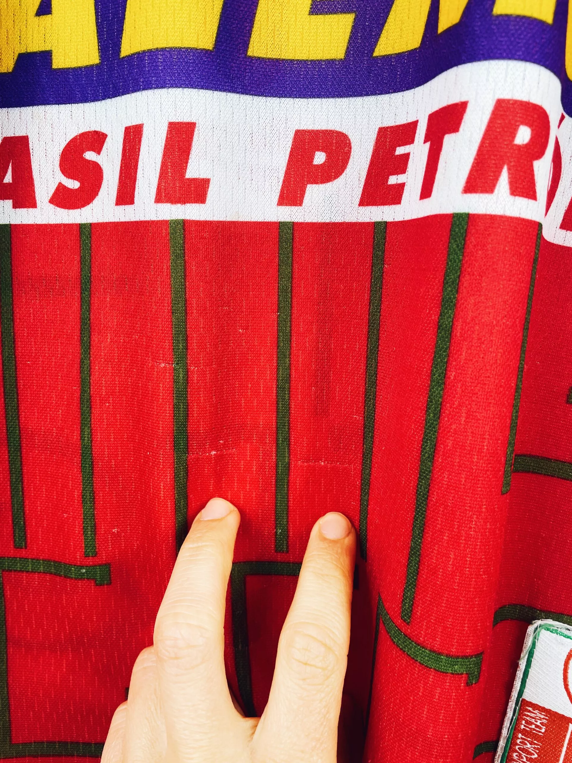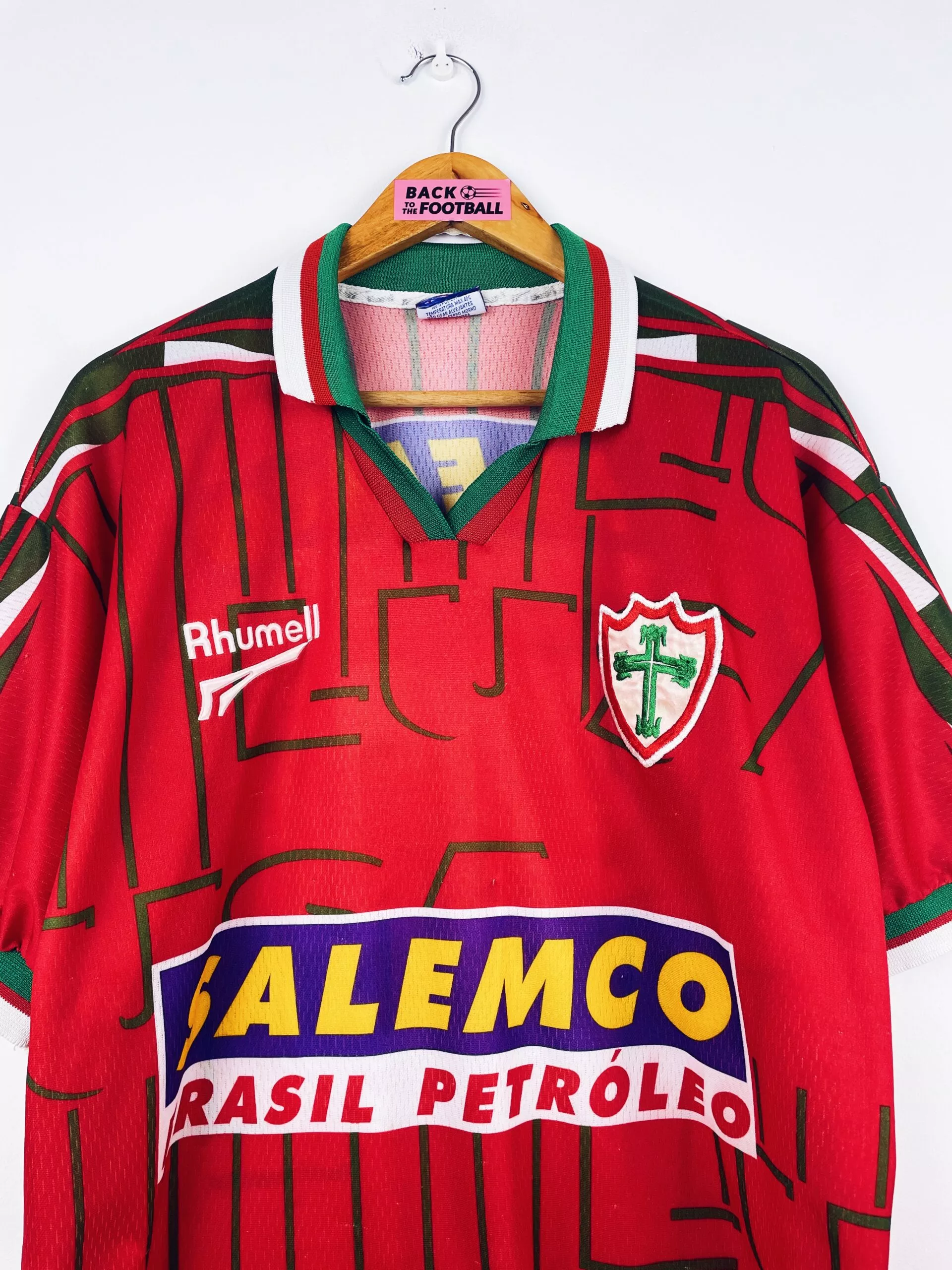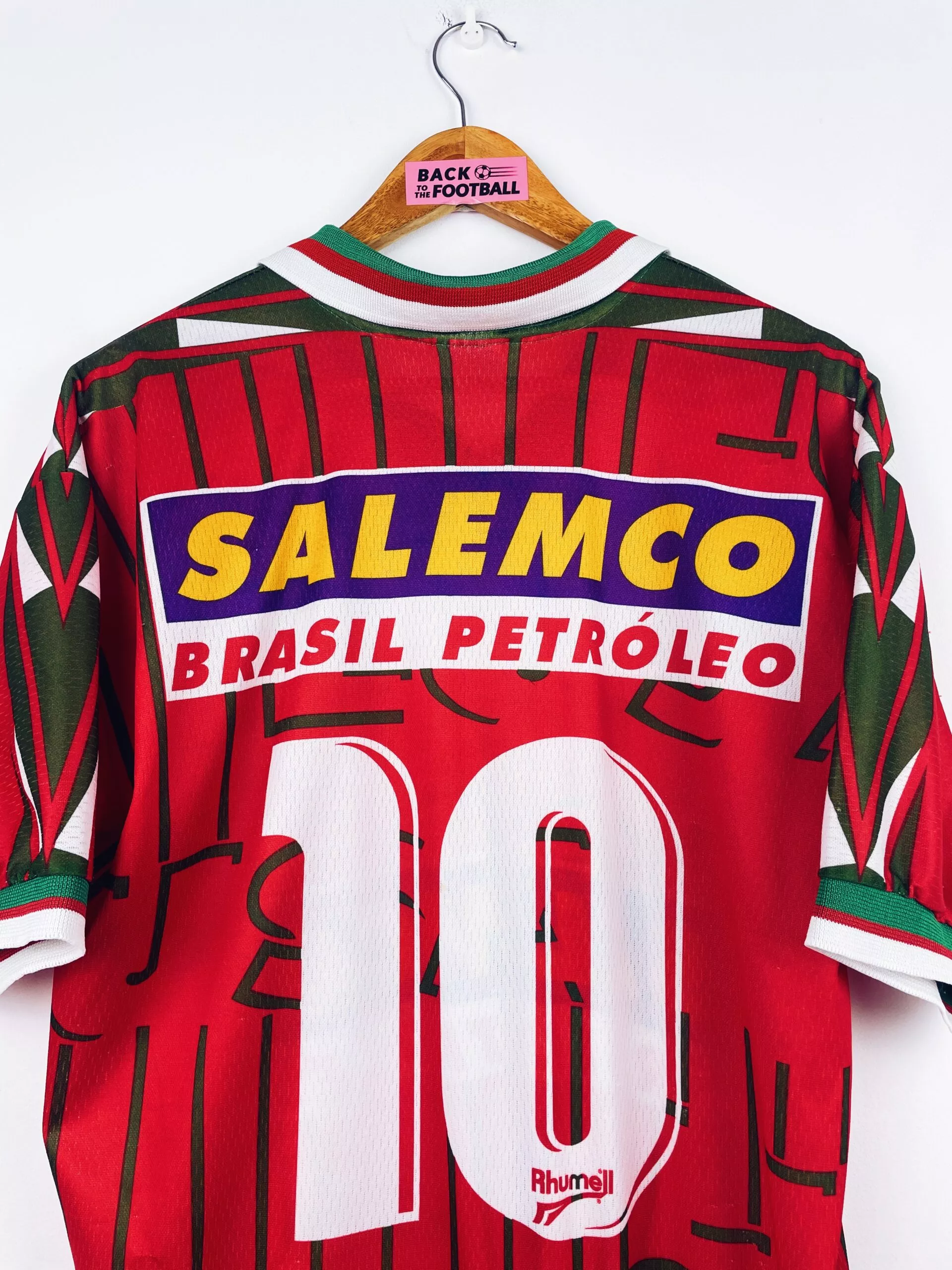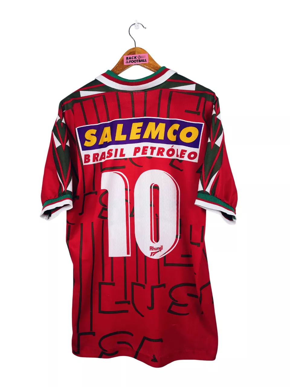 Taille : L Largeur : 54cm (aisselle à aisselle) Longueur : 74cm (base du col au bas) Si tu veux plus d’infos, tu peux nous contacter par mail ou sur les réseaux 😉 Etat : 7.5/10, très bon état mais quelques petits accrocs (voir photos) Le maillot : maillot vintage domicile Portuguesa 1998. L’écusson est brodé, le logo Rhumell est en feutrine, les sponsors Salemco Brasil Petroleo et le numéro 10 sont incrustés. Très beau maillot rétro de Portuguesa ! Histoire : le club de Sao Paulo termine à la 6eme place du classement du championnat brésilien et se qualifie…