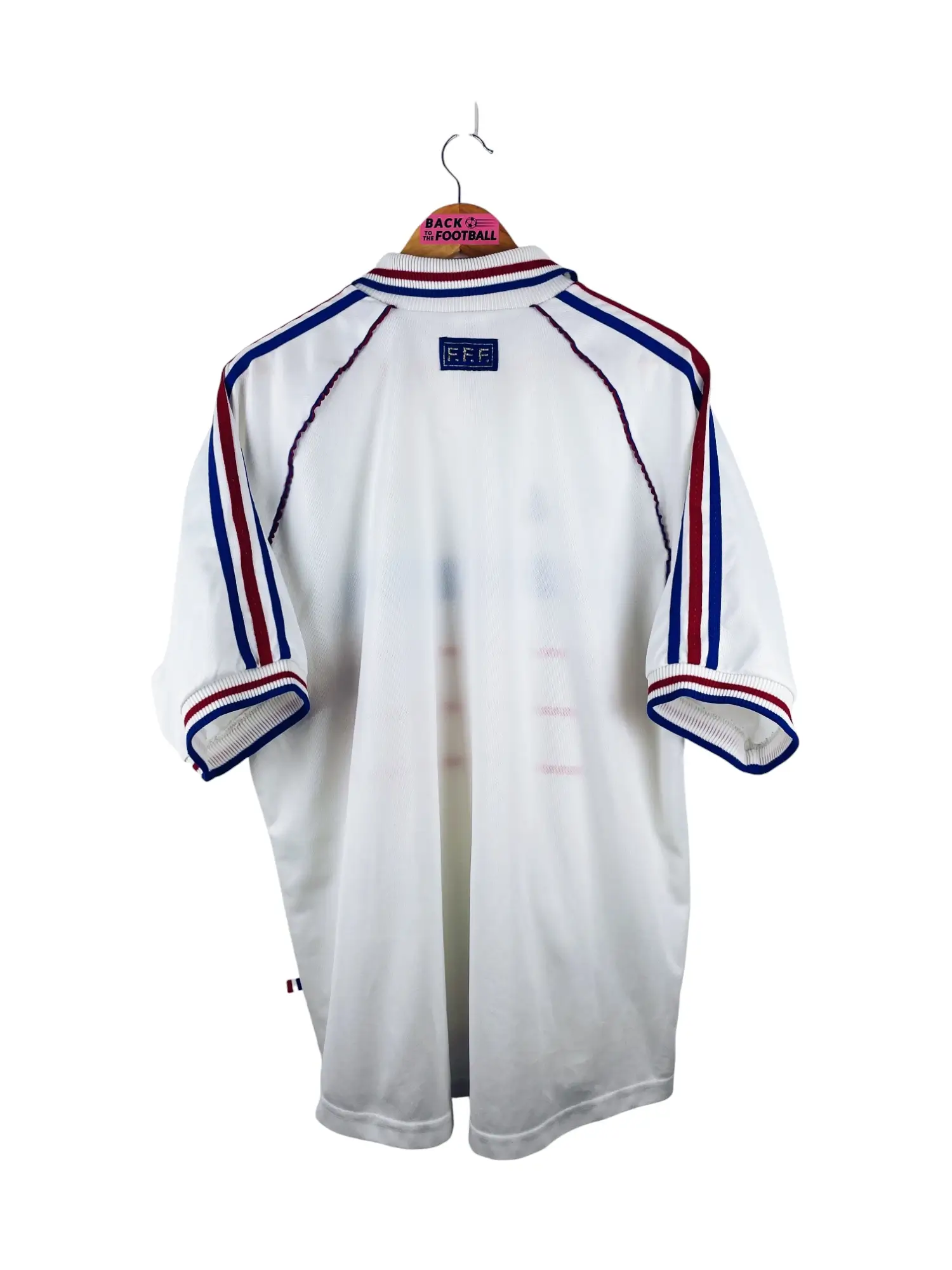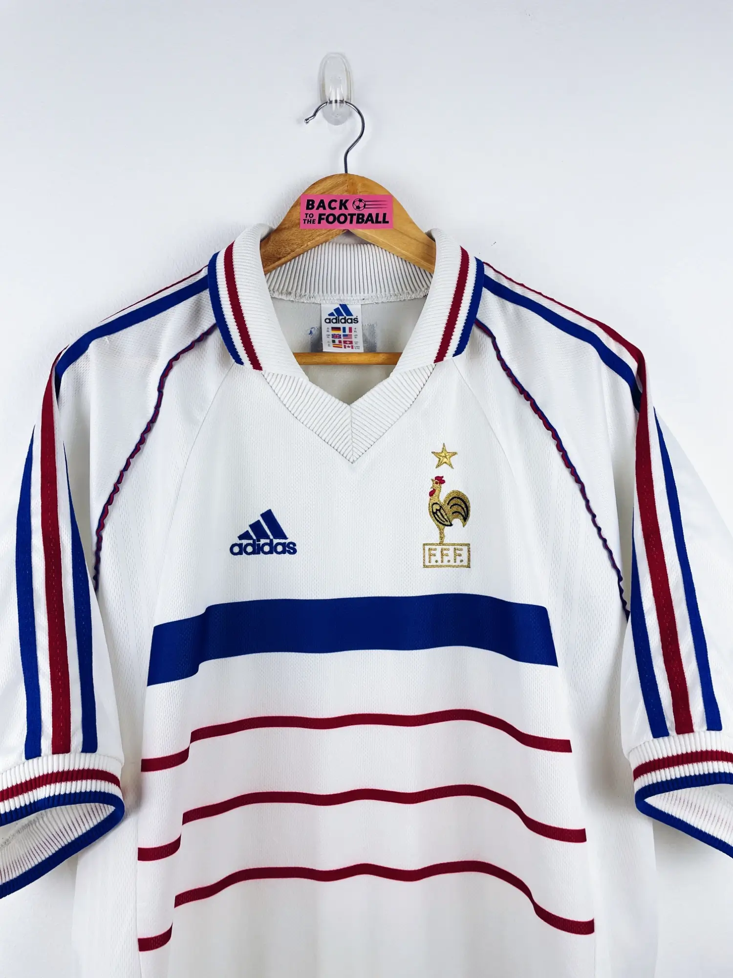 Taille : XL Largeur : 61cm (aisselle à aisselle) Longueur : 75cm (base du col au bas) Si tu veux plus de détails, tu peux nous contacter par mail ou sur les réseaux 😉 Etat : 9/10, excellent état Le maillot : maillot vintage extérieur de l’équipe de France 1998, la version avec l’étoile. L’écusson et le logo Adidas sont brodés. Très beau maillot rétro de l’équipe de France ! Histoire : la 1ère étoile des bleus ! tout le monde connait l’histoire mais on se la refait : les Bleus battent largement l’Afrique du Sud 3-0 en match d’ouverture.…